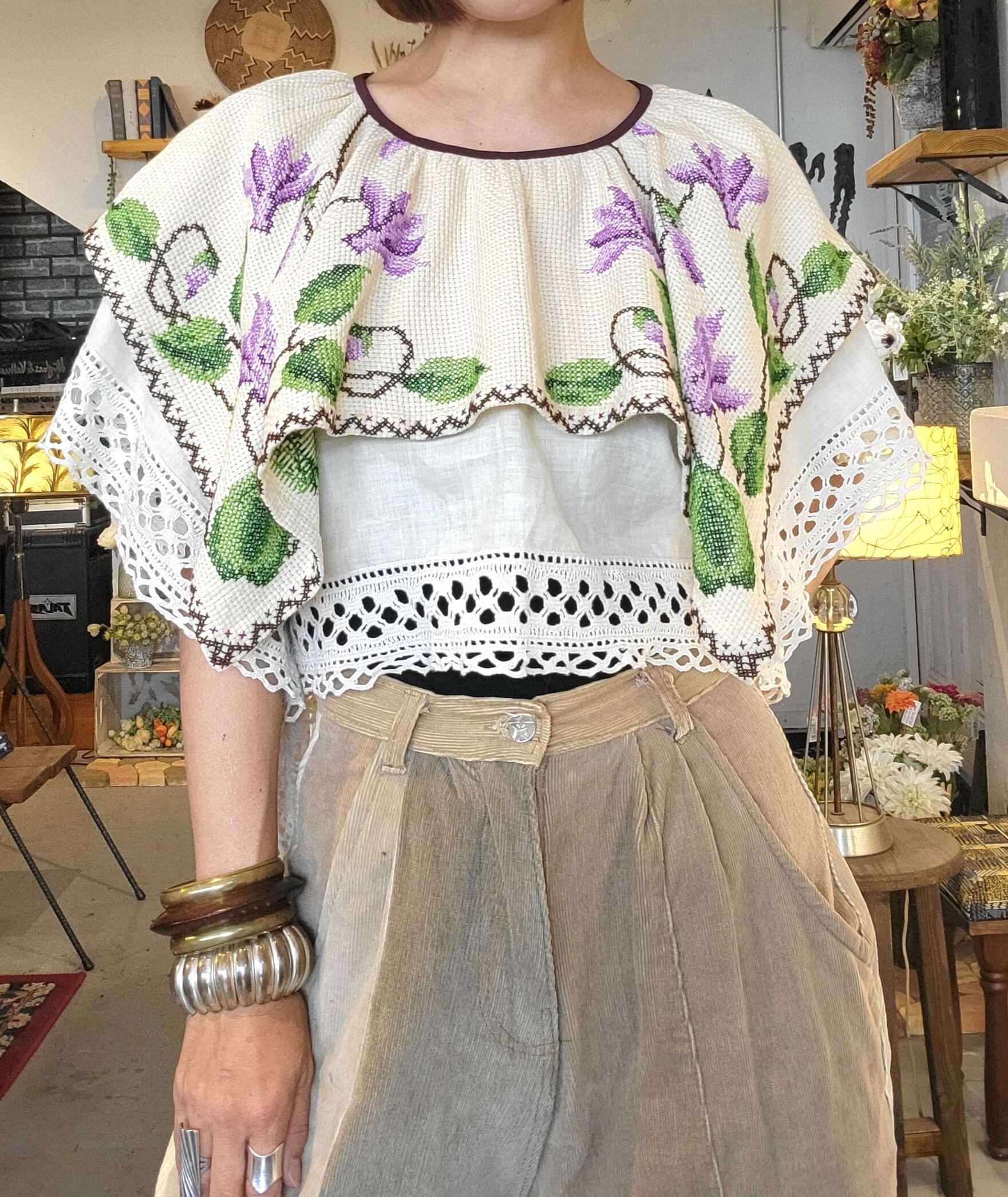 ヴィンテージのテーブルクロスを使用したリメイクプルオーバートップス。素材はコットンです。ポンチョのようにも見えますがサイドが縫われており腕が通せるため、着用時にずれることなく安定感があります。実際の色味は着用画像に近いです。手刺繍のクロスステッチとレースの組み合わせが可愛らしく、デニムやミリタリーパンツ等、辛口なボトムとの相性も抜群です。*注) こちらは割引クーポン対象外となります。