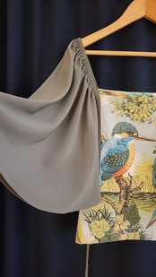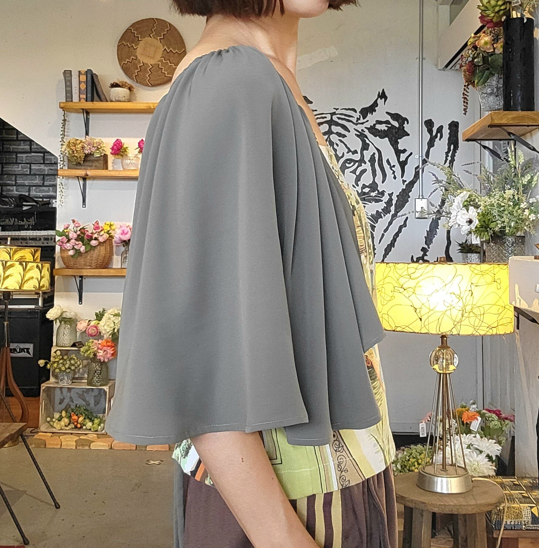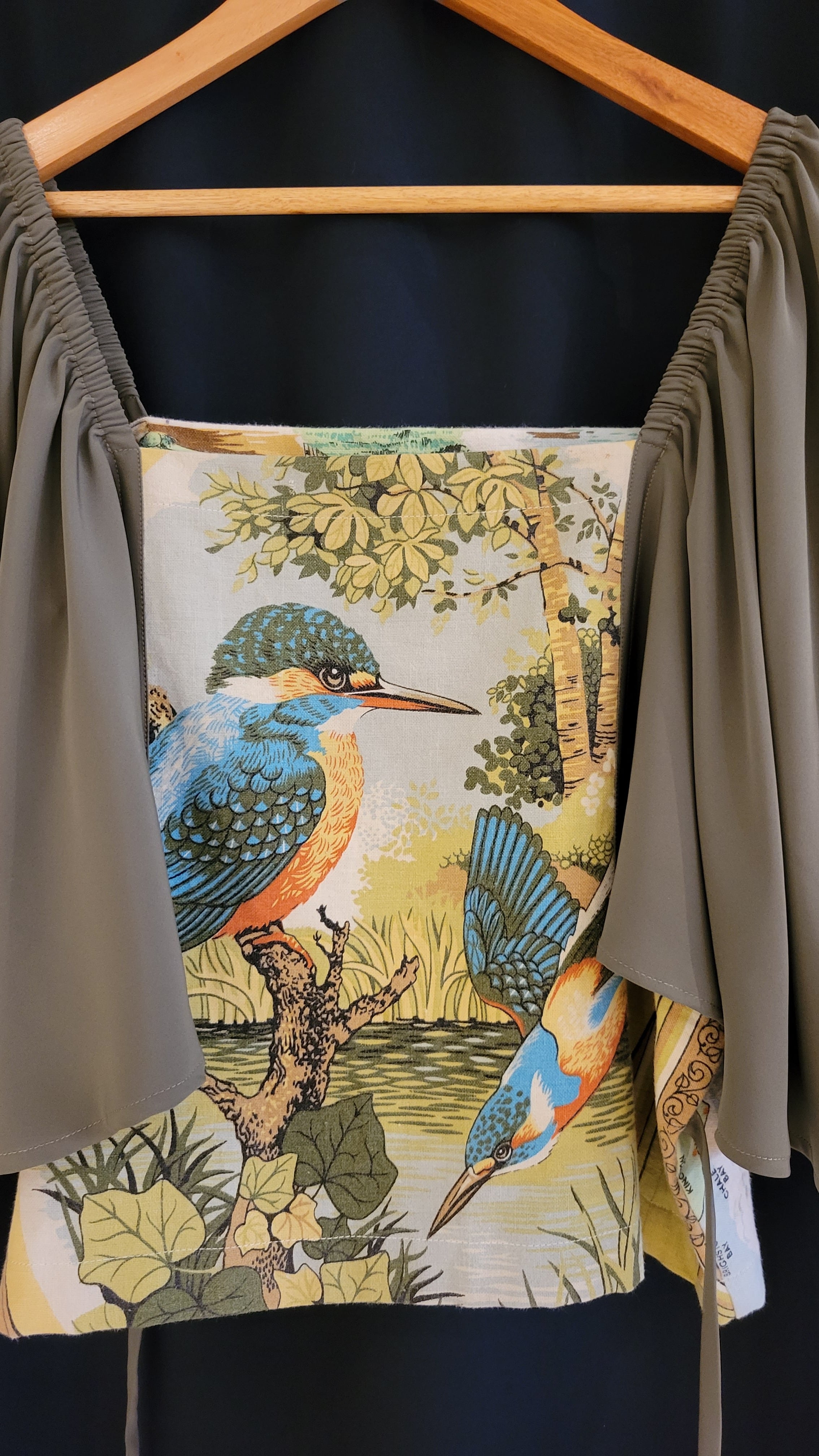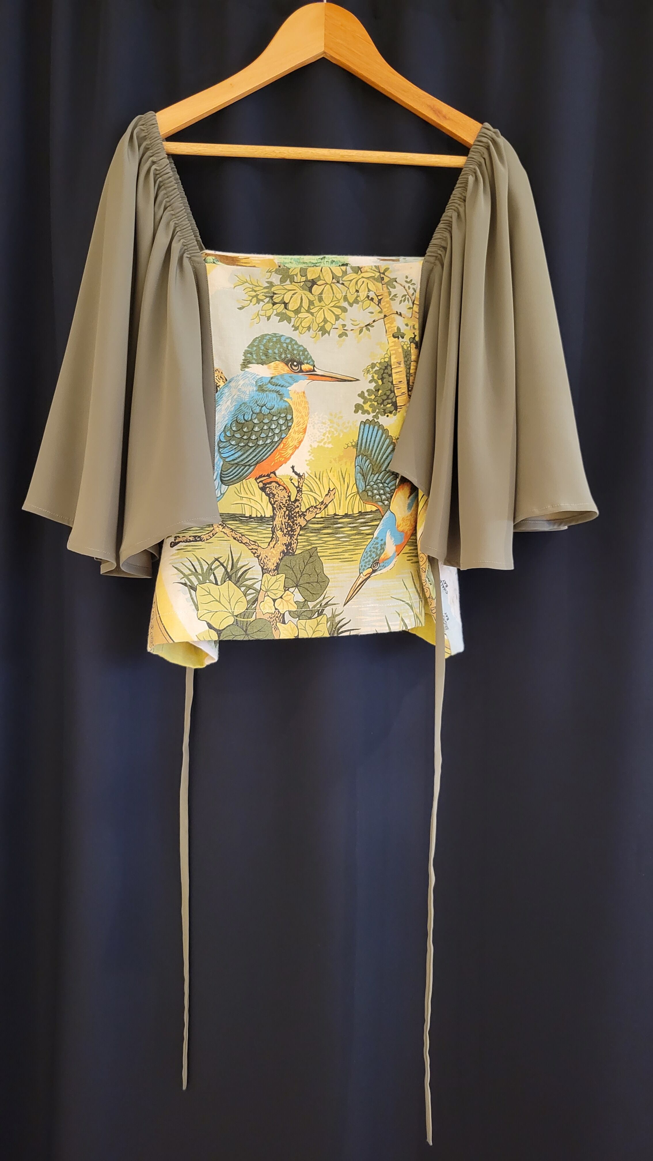 ヴィンテージのティータオルを使用したリメイクトップス。素材は身ごろがコットン、袖はポリエステルサテンです。前後で柄が異なりどちら側でも着用が可能です。サイドリボンは前後どちらでも結べます。*こちらは割引クーポン対象外となります。