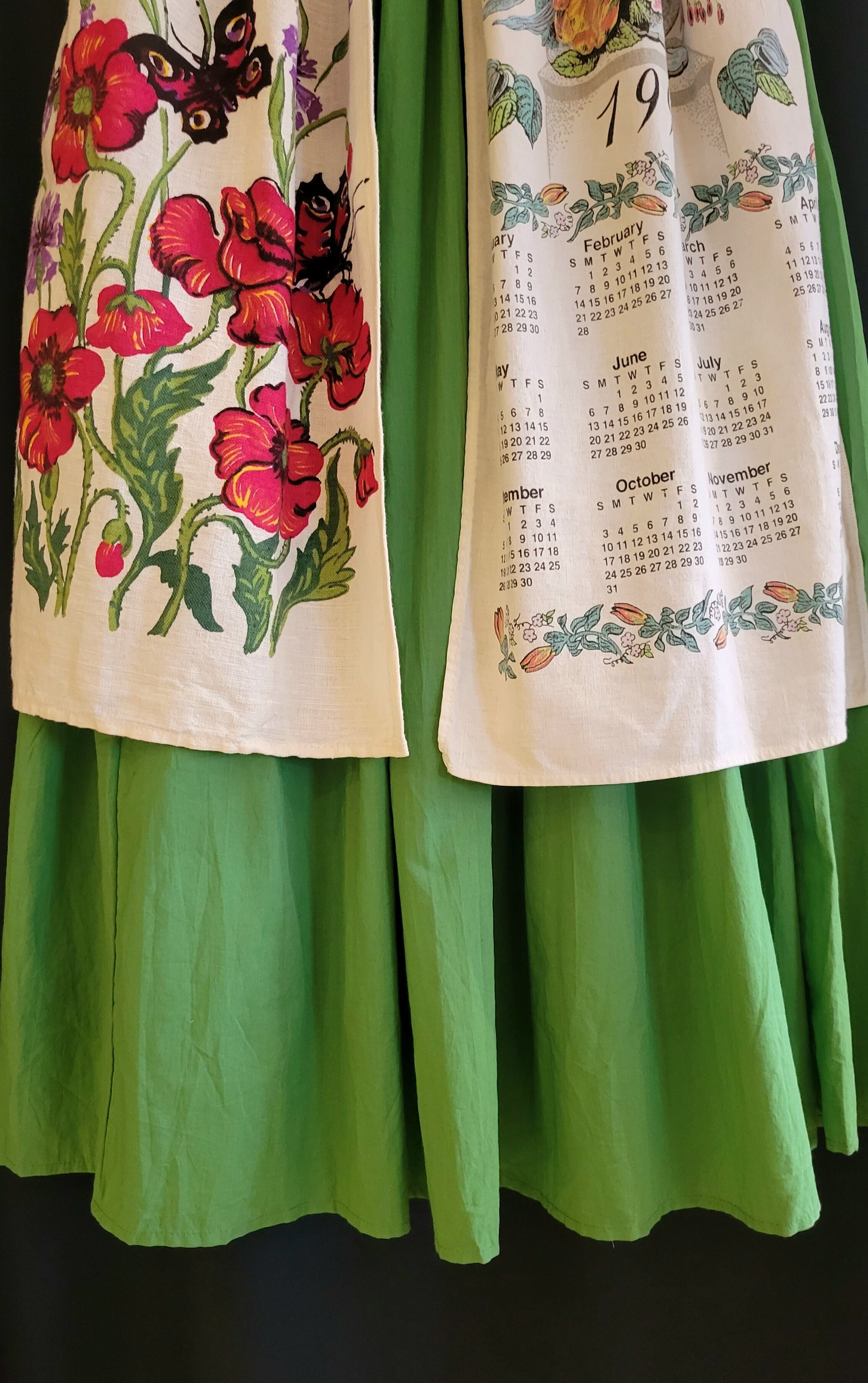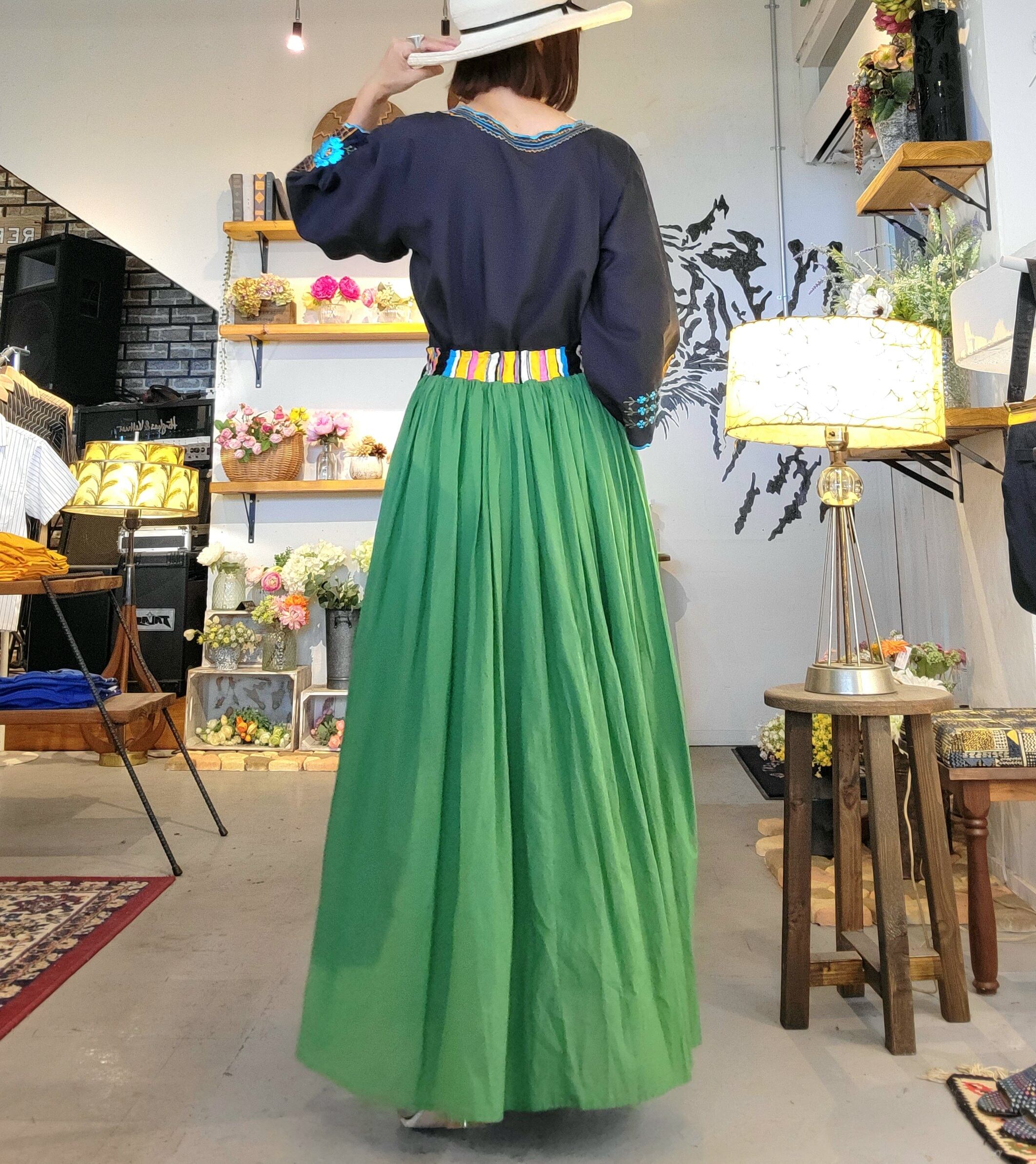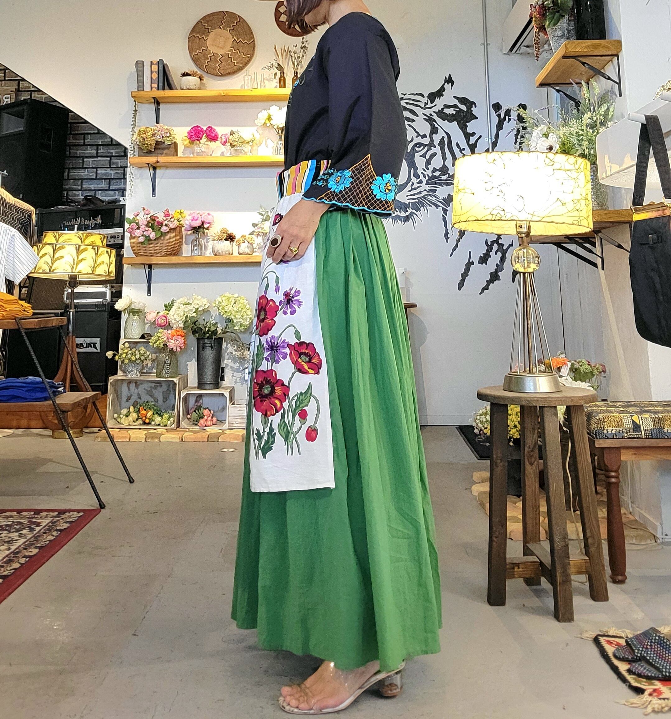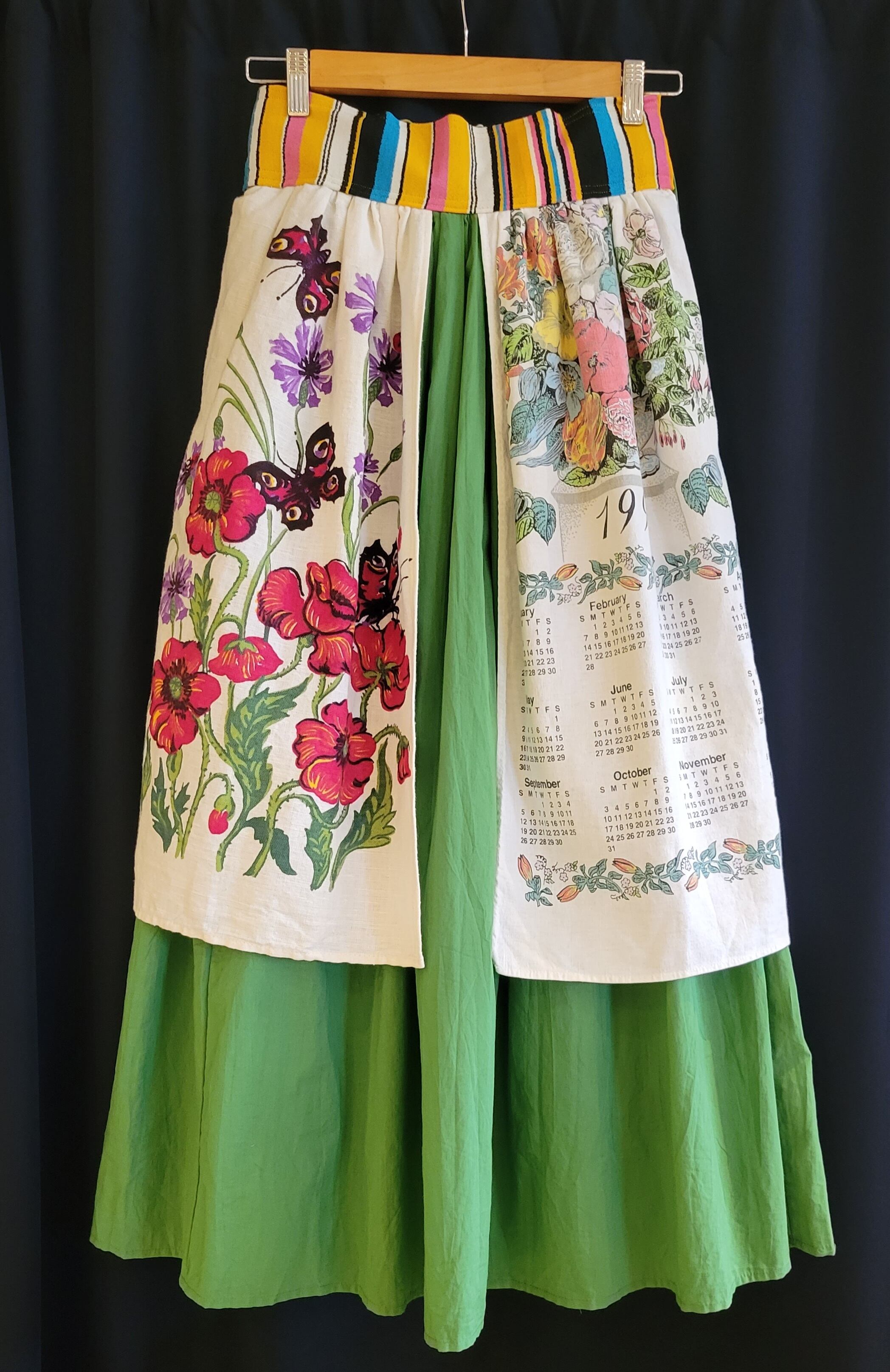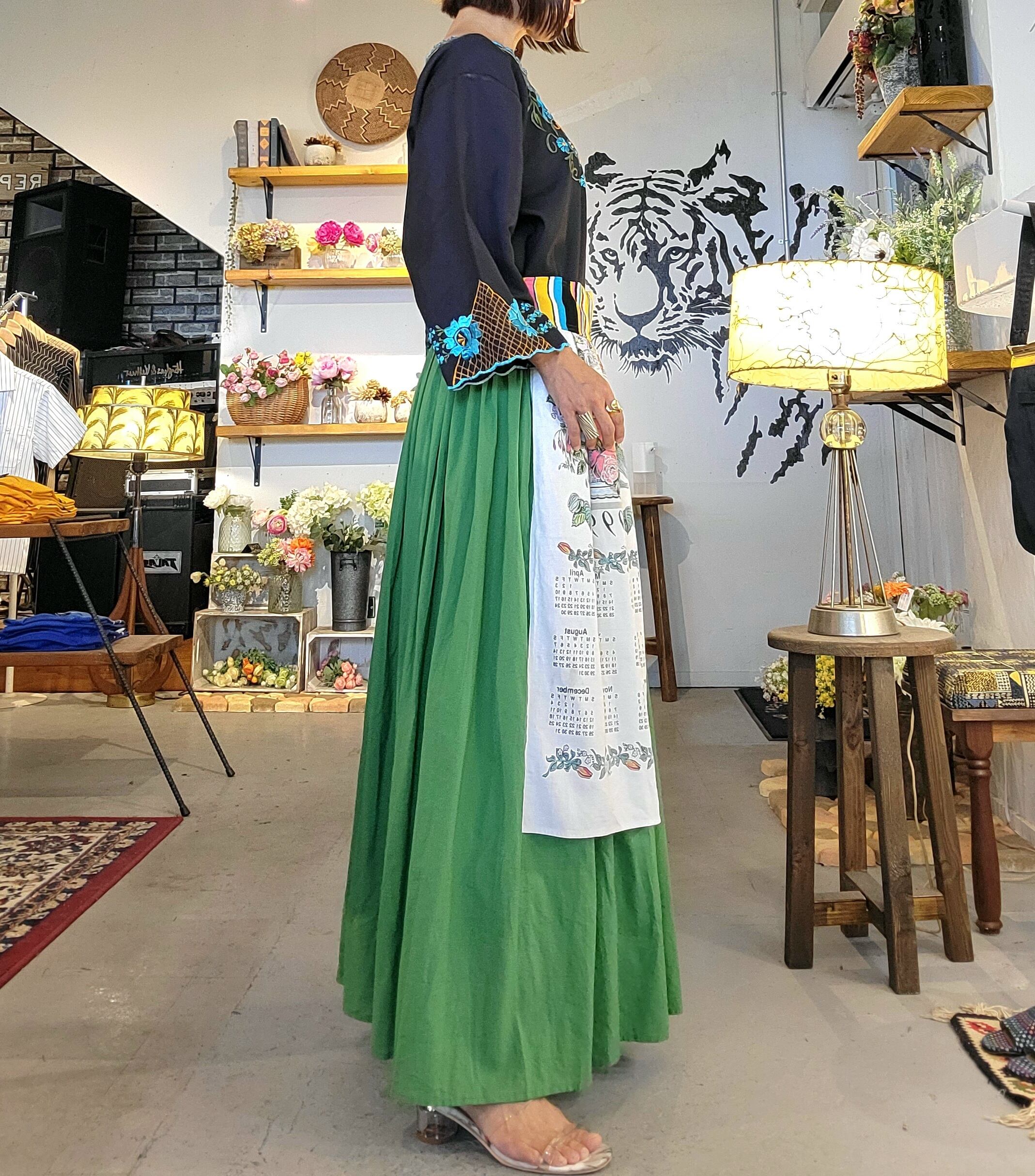 ヴィンテージのティータオルをエプロンのようにあしらったアロカシアオリジナルのリメイクスカート。素材はスカートがコットン、ティータオルは素材表記はありませんがコットンリネンのようです。ウエストはバックがゴム仕様になります。カラフルなウエストヨークがアクセントになり全体のバランスを引き締めます。