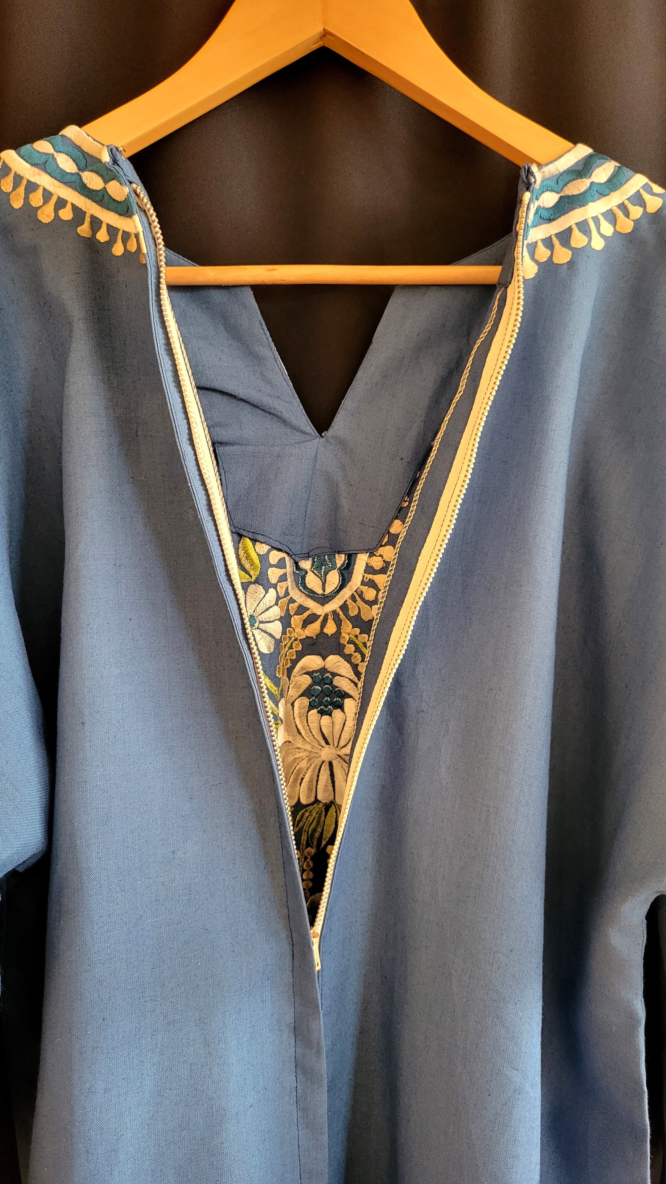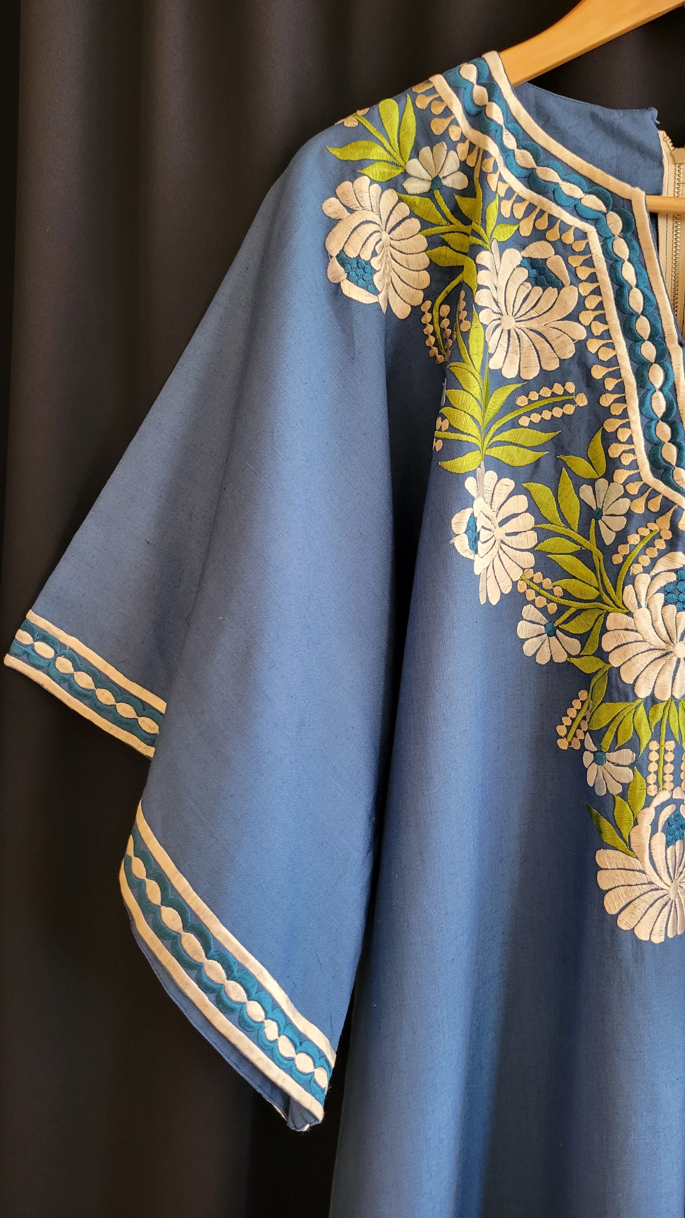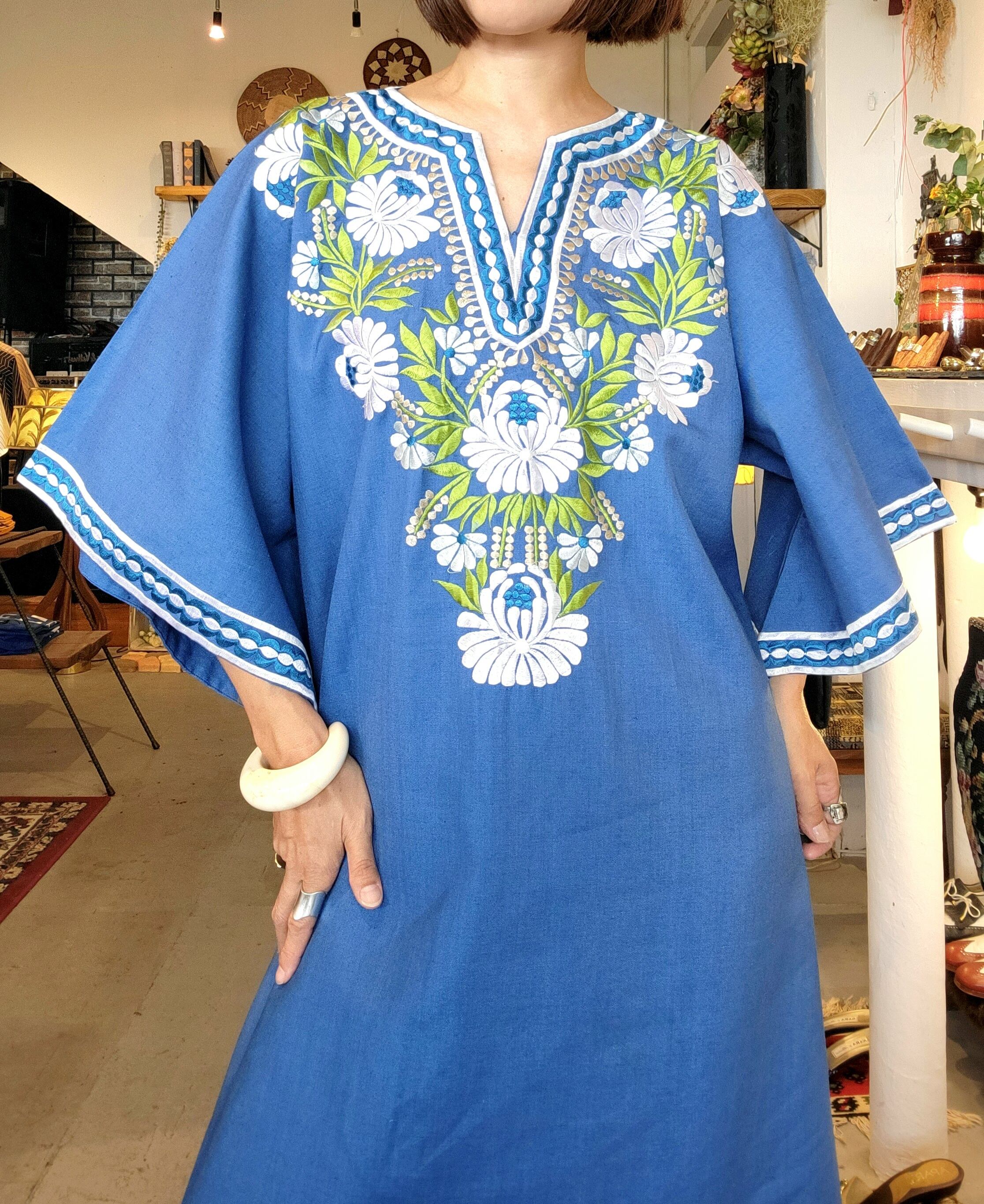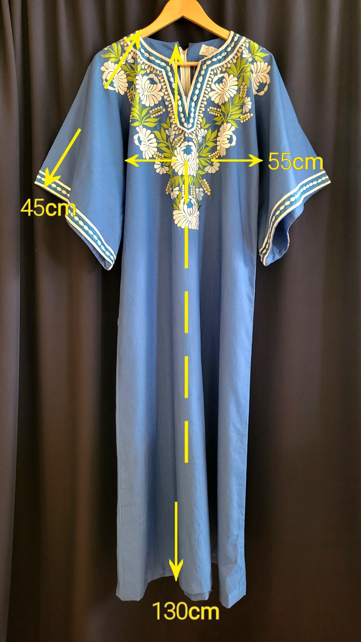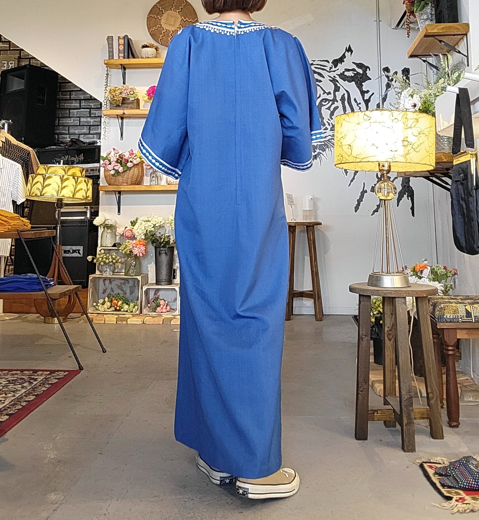 ヴィンテージのマキシドレス。素材はラミー(苧麻/麻の一種)60% テトロン=ポリエステル25% コットン10% しっかり張り感のある素材です。フロントに施された美しいフィリピン刺繍、裾にかけてゆるやかに広がるAラインフレアが大人な印象です。*実際のお色は着用画像に近いです。