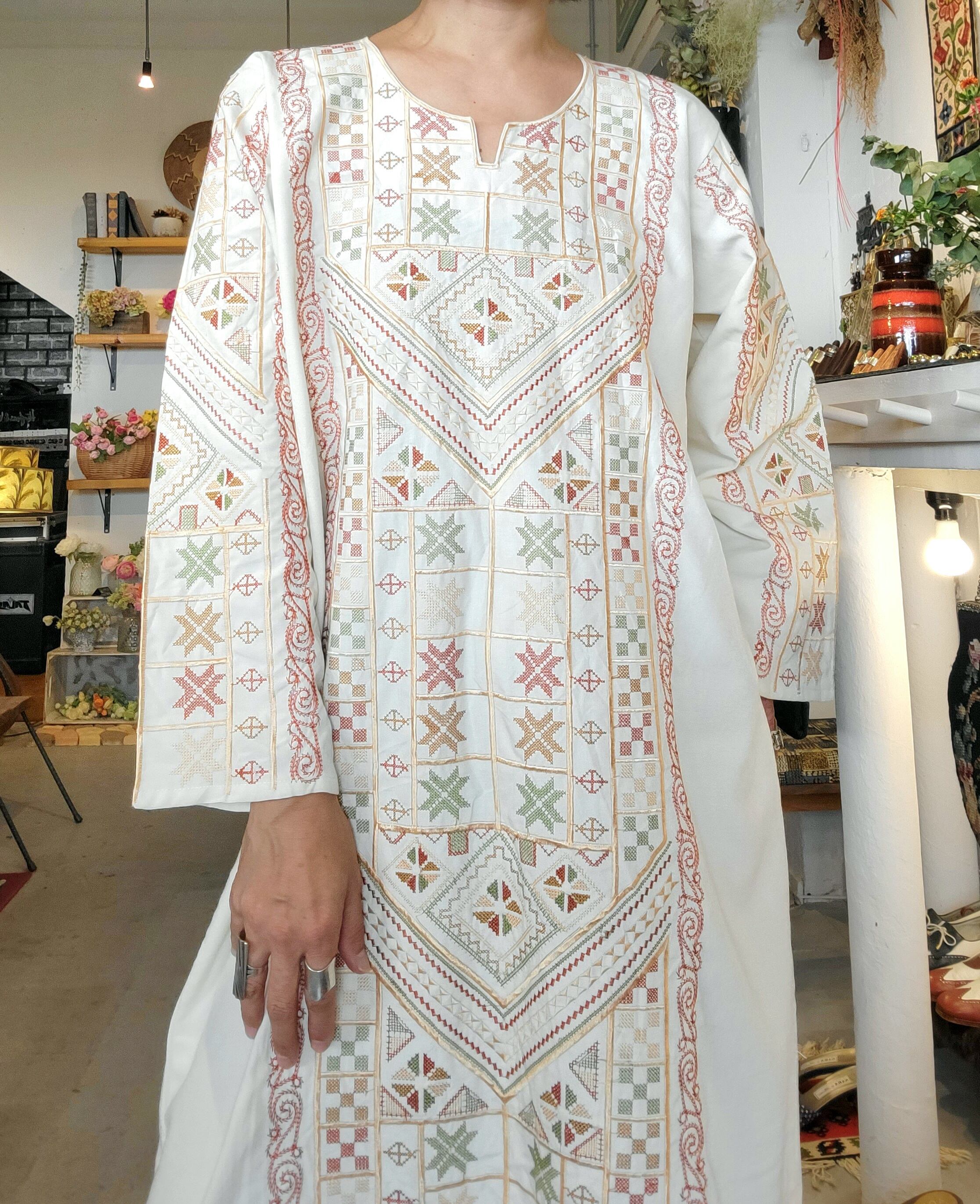 ヴィンテージのカフタンマキシドレス。素材表記はありませんがコットンのようです。直接的ですっきり見えるシルエットに淡いカラーの刺繍が優しい印象です。左のみ裾から21cmのスリット入りで足さばきもスムーズ。1枚で仕上がるヴィンテージドレスです。