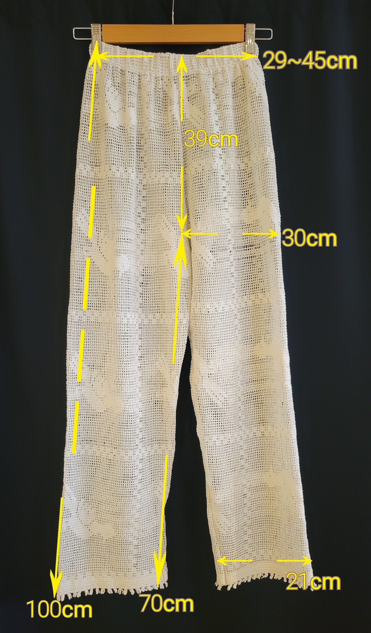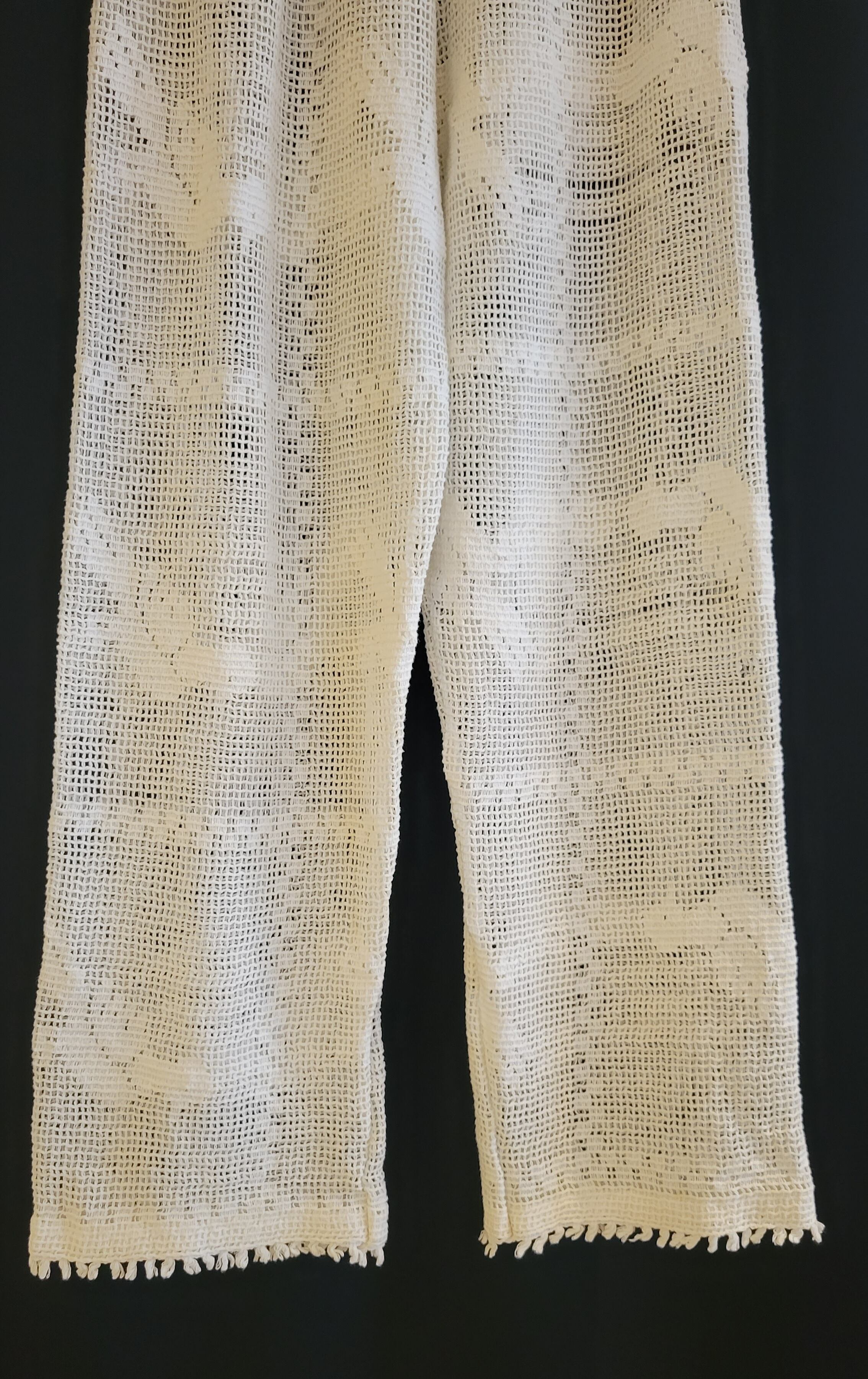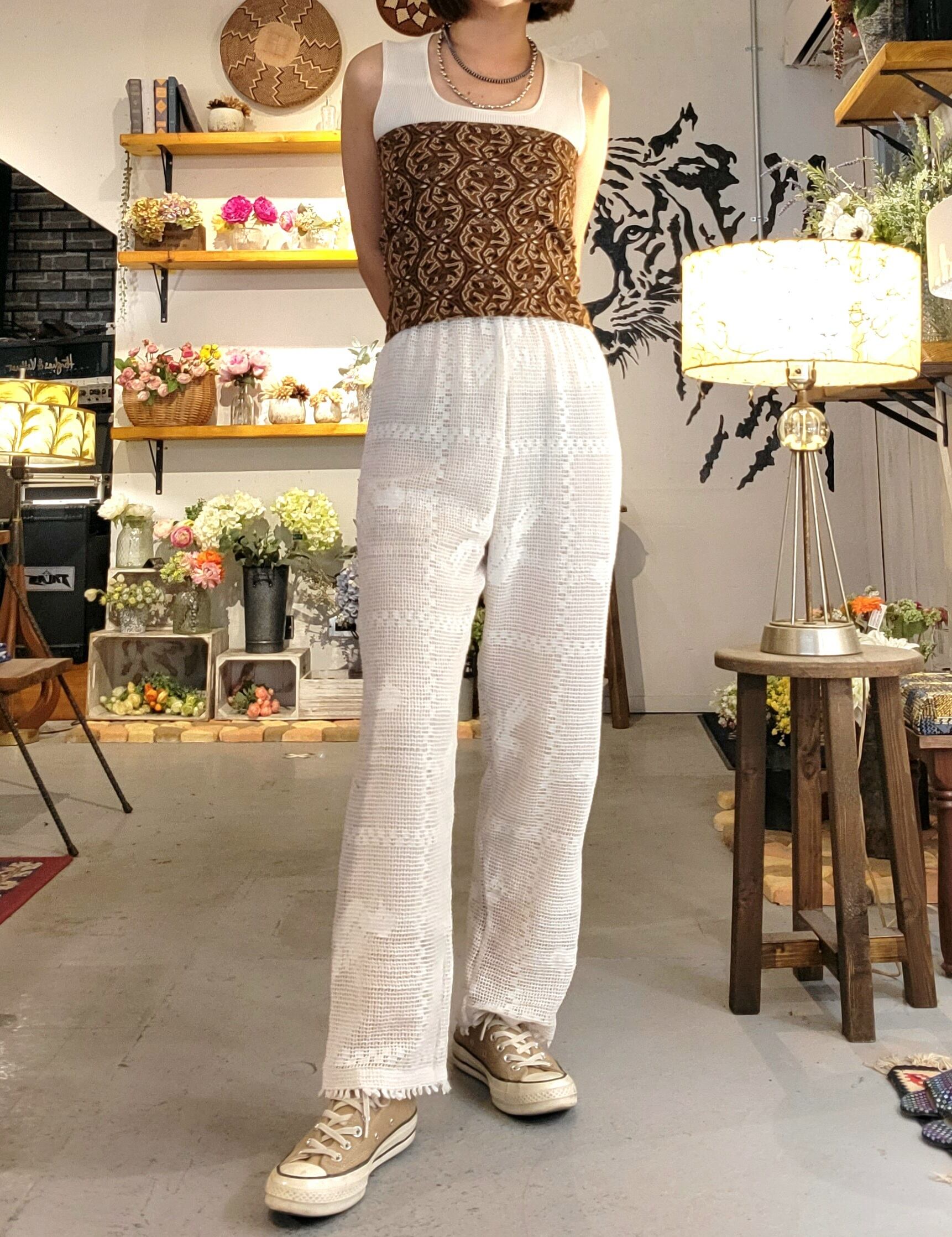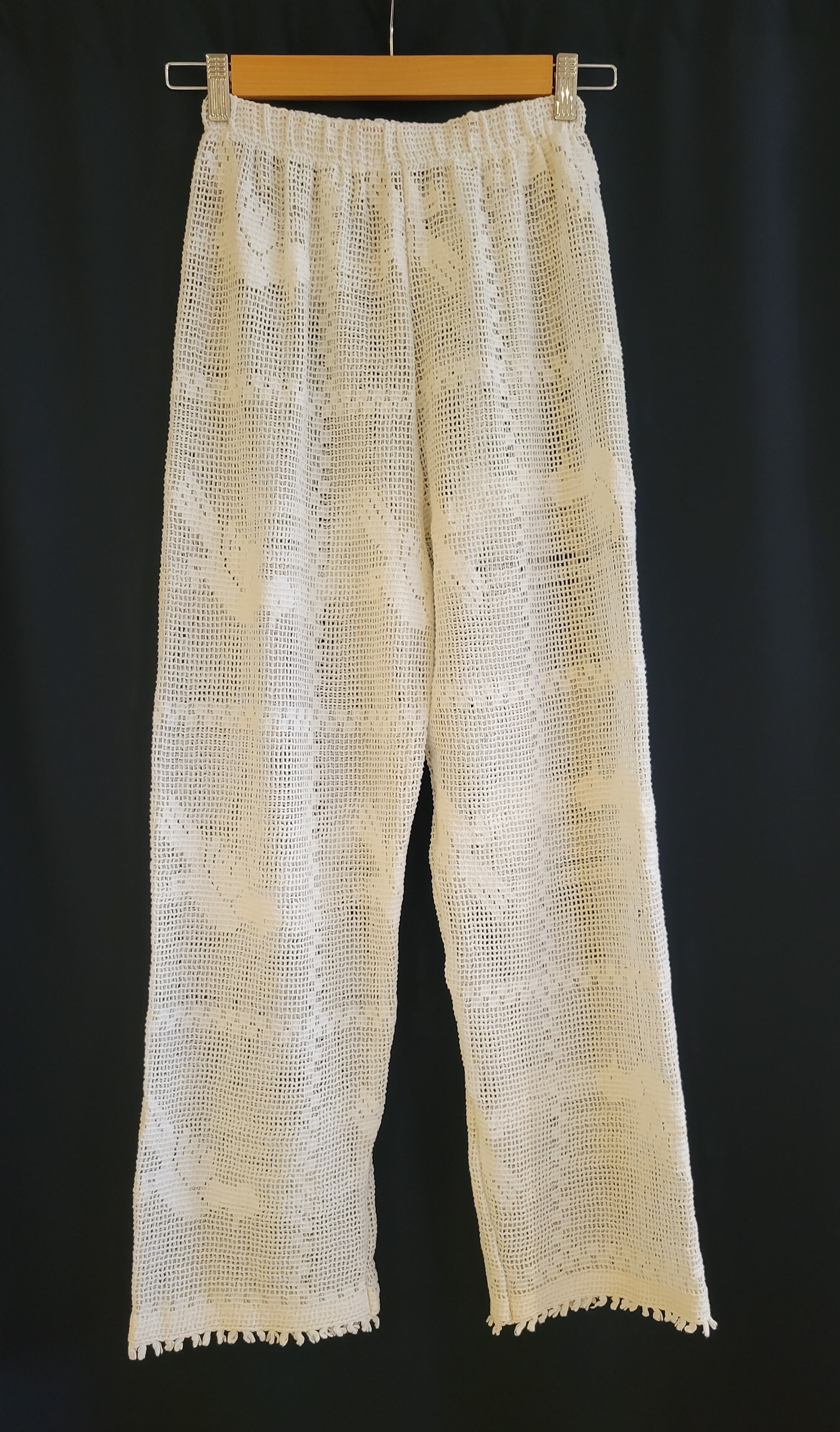 ヴィンテージのクロシェテキスタイルを使用したリメイクイージーパンツ。ウエストはゴム仕様です。裏地は付いていません。インナーにペチコートパンツやレギンス等の着用をおすすめいたします。