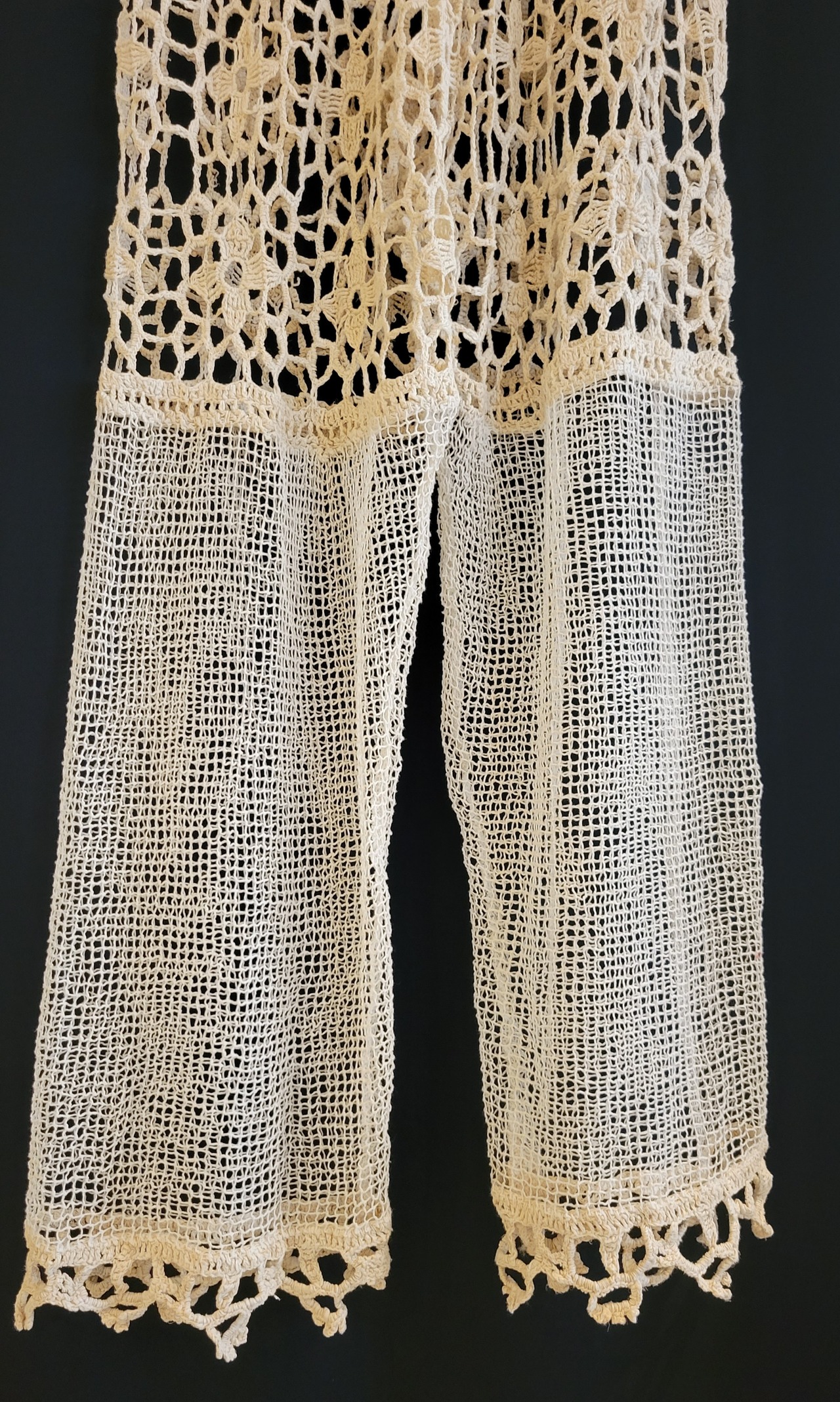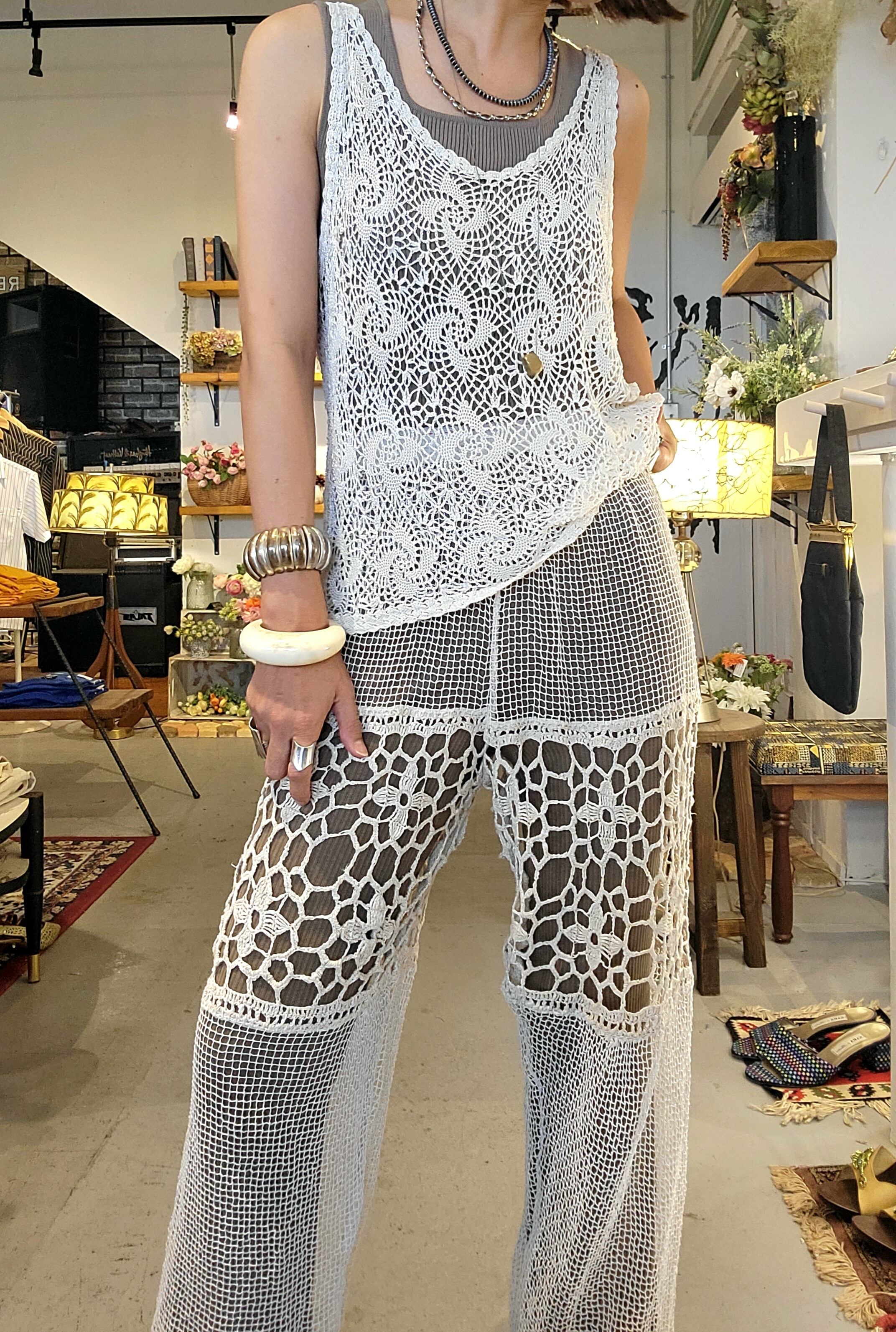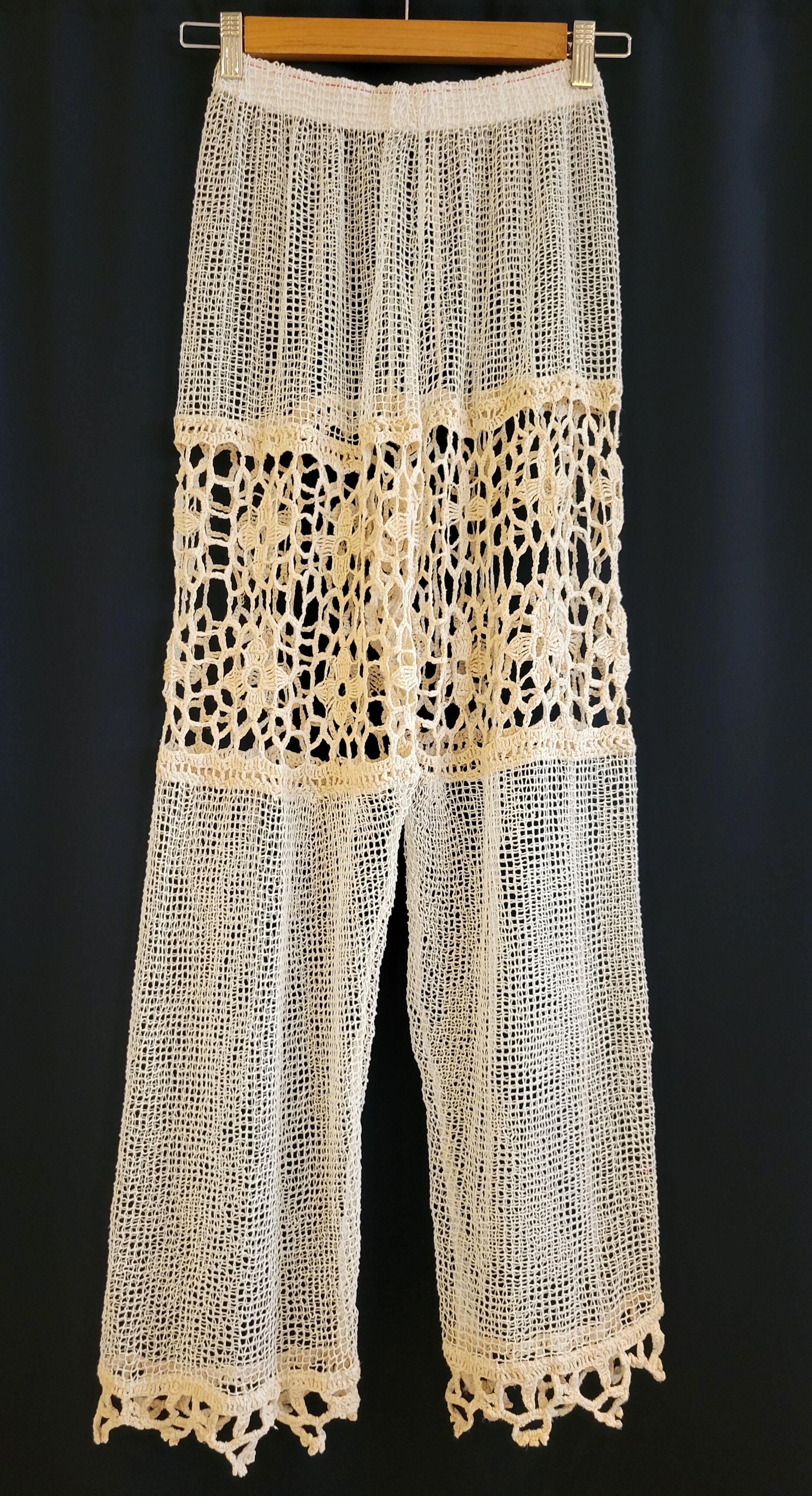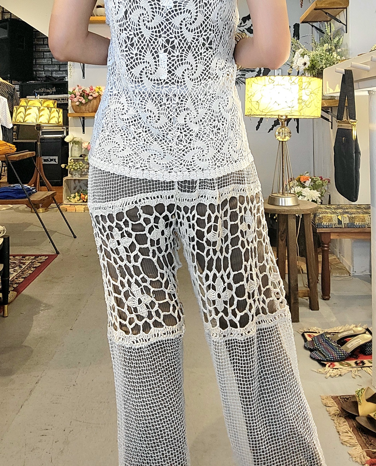 ヴィンテージレースのテキスタイルを使用したリメイクイージーパンツ。ウエストはゴム仕様です。裏地は付いていません。インナーにペチコートパンツやレギンス等の着用をおすすめいたします。
