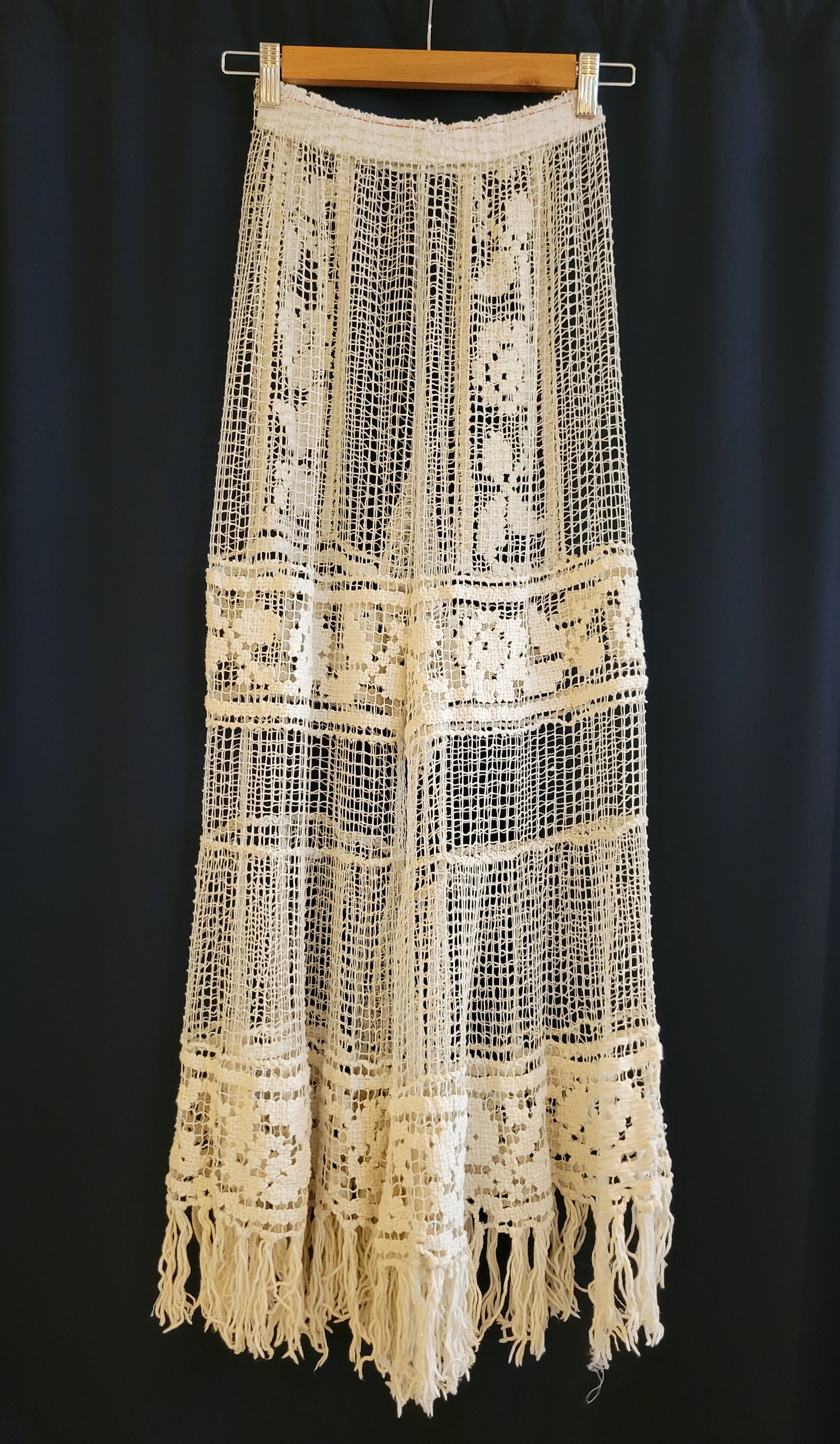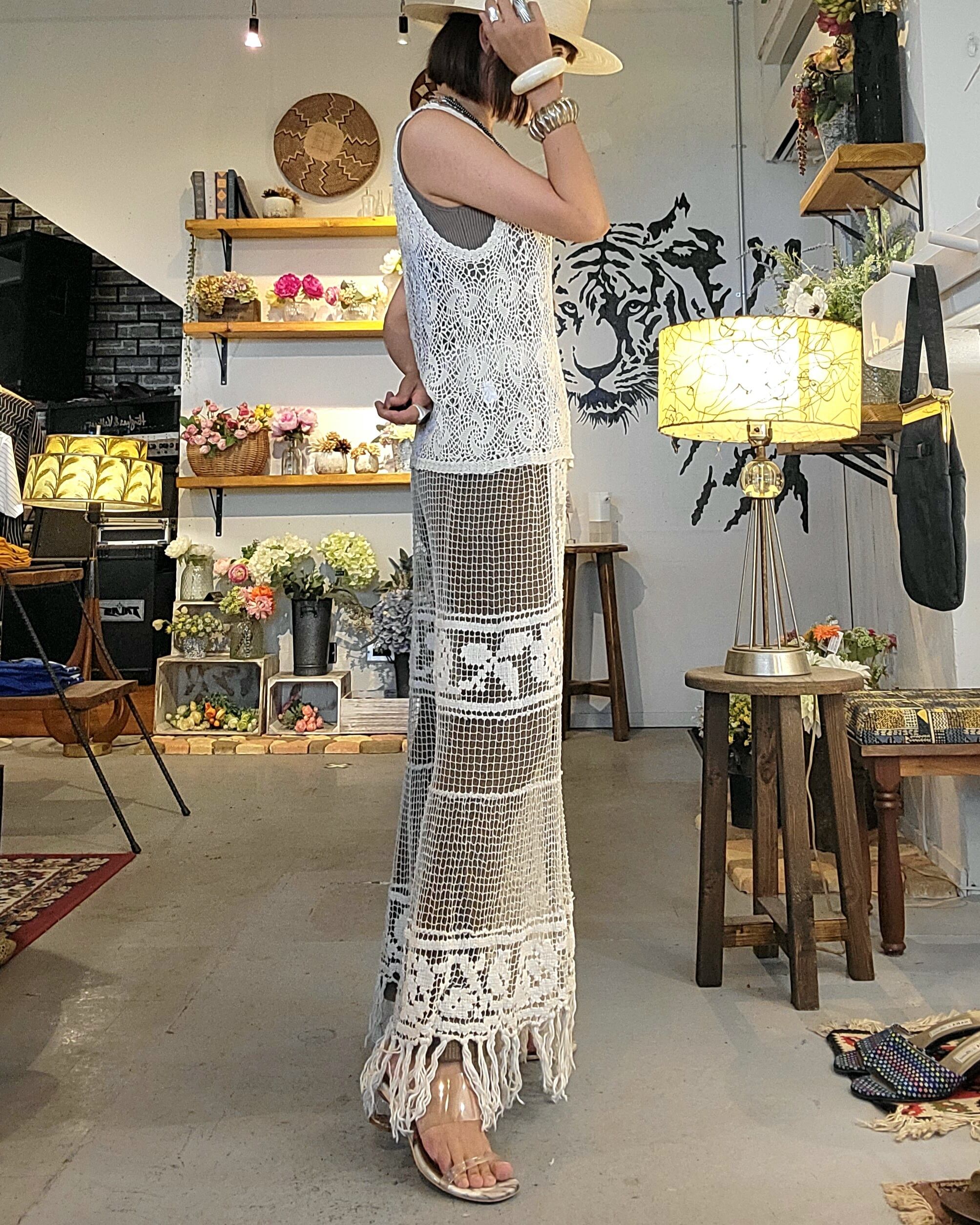 ヴィンテージレースのテキスタイルを使用したリメイクイージーパンツ。ウエストはゴム仕様です。裾はフレアシルエットになります。裏地は付いていません。インナーにペチコートパンツやレギンス等の着用をおすすめいたします。