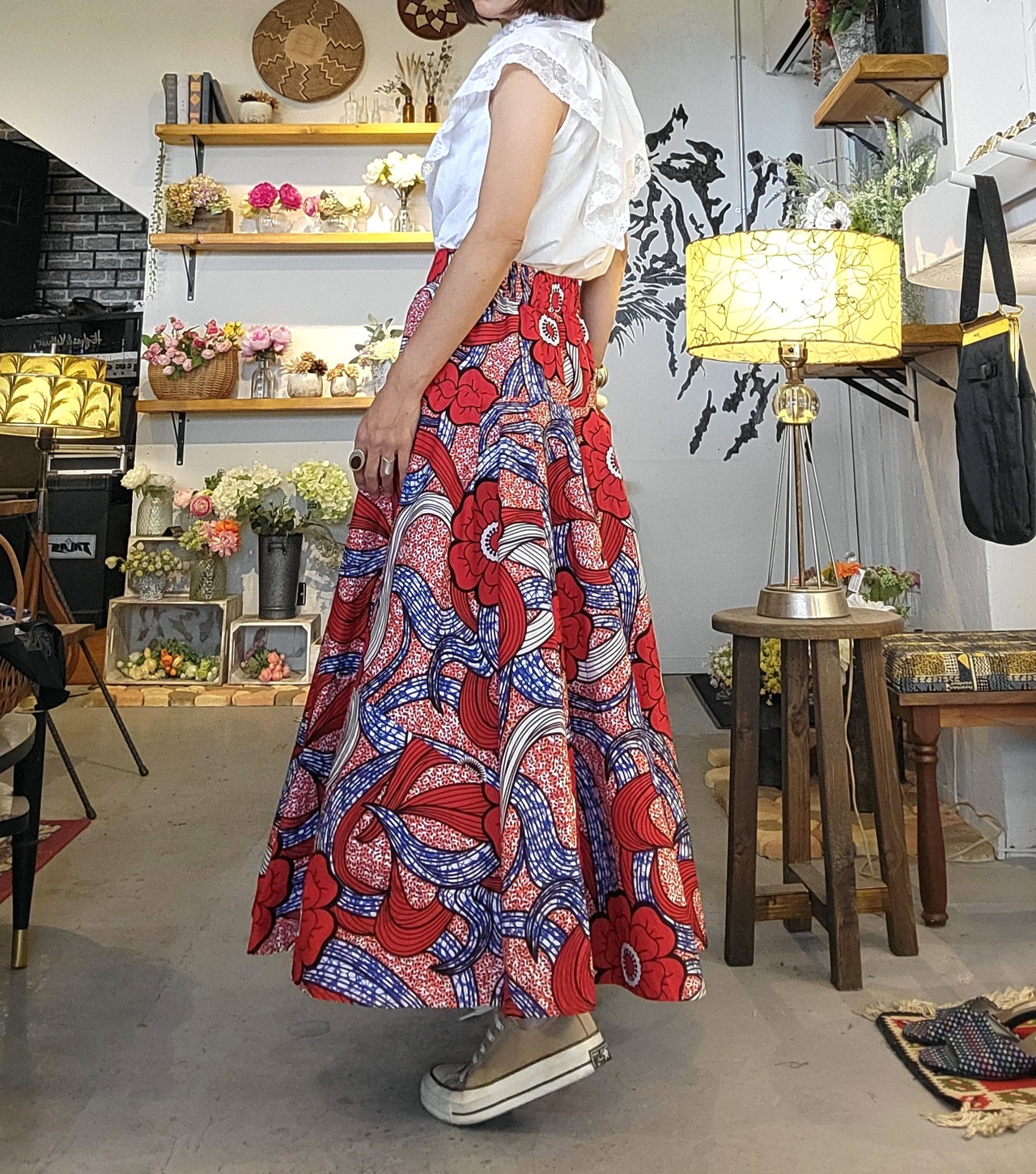 ヴィンテージのアフリカンバティックリメイクスカート。素材表記はありませんがコットンです。ウエストはバックがゴム仕様。しっかり張りのあるコットンのため着用持にもきれいなフレアシルエットがキープできます。