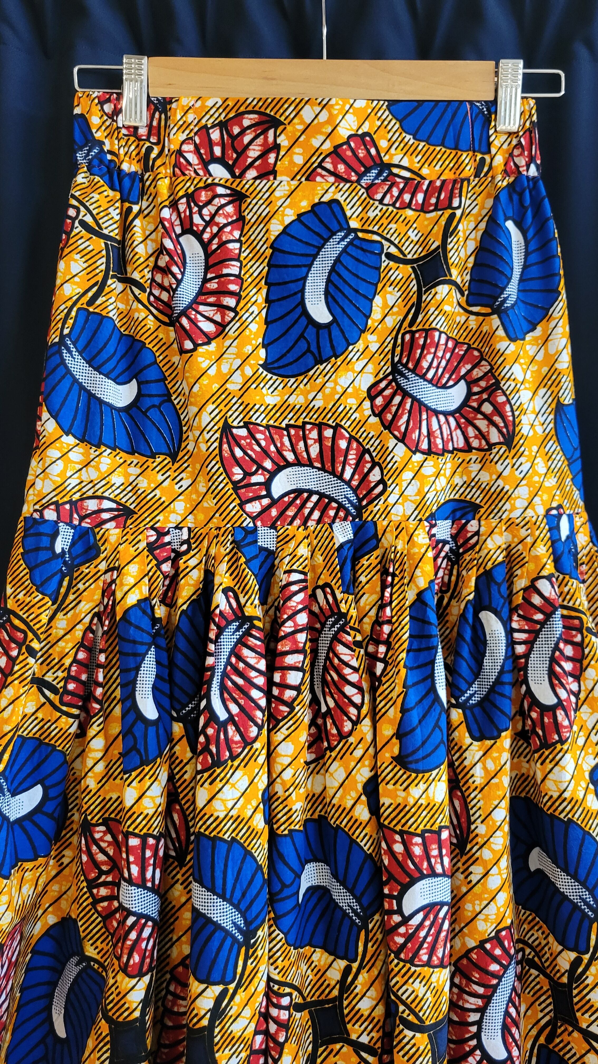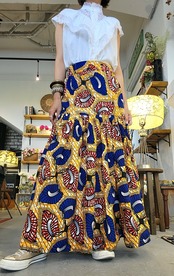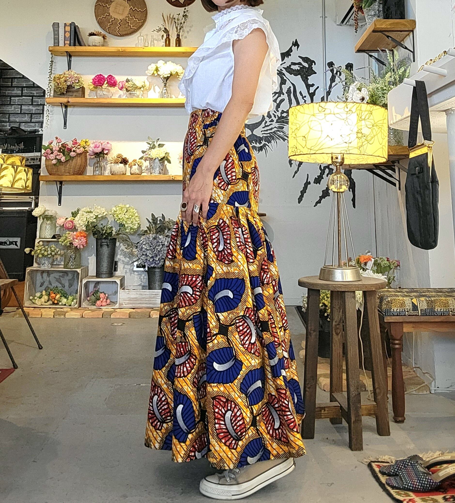 ヴィンテージのアフリカンバティックリメイクスカート。素材表記はありませんがコットンです。ウエストはバックがゴム仕様。しっかり張りのあるコットンのため着用持にもふんわりシルエットがキープできます。