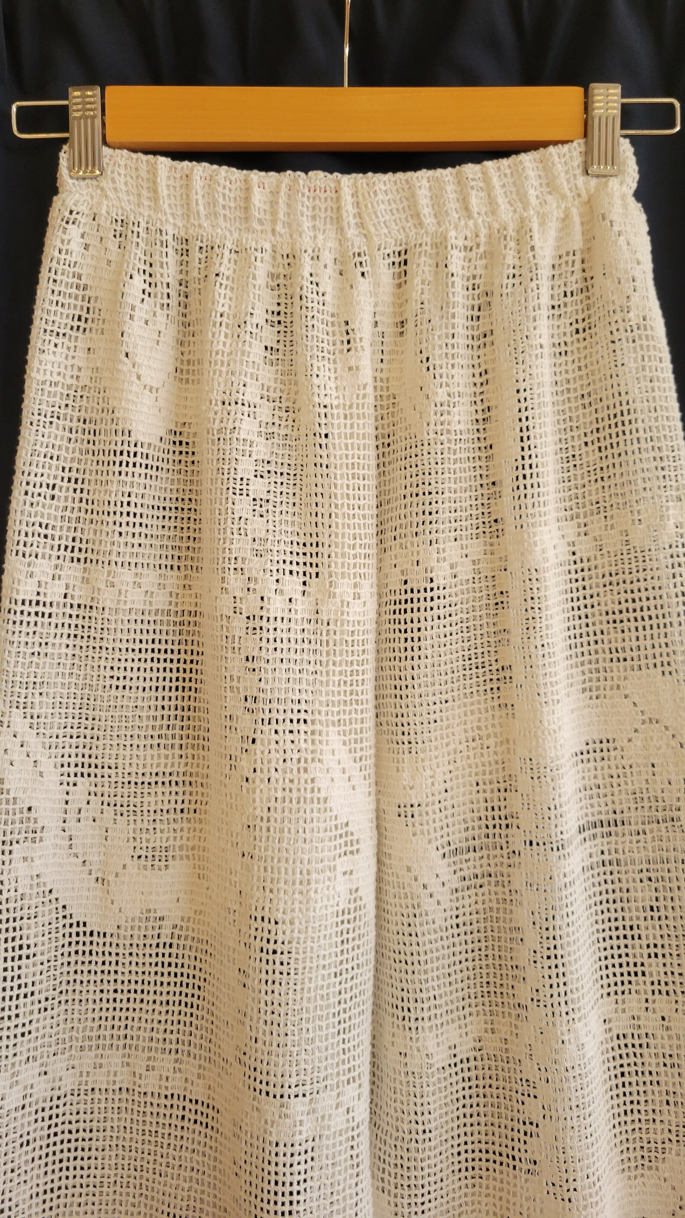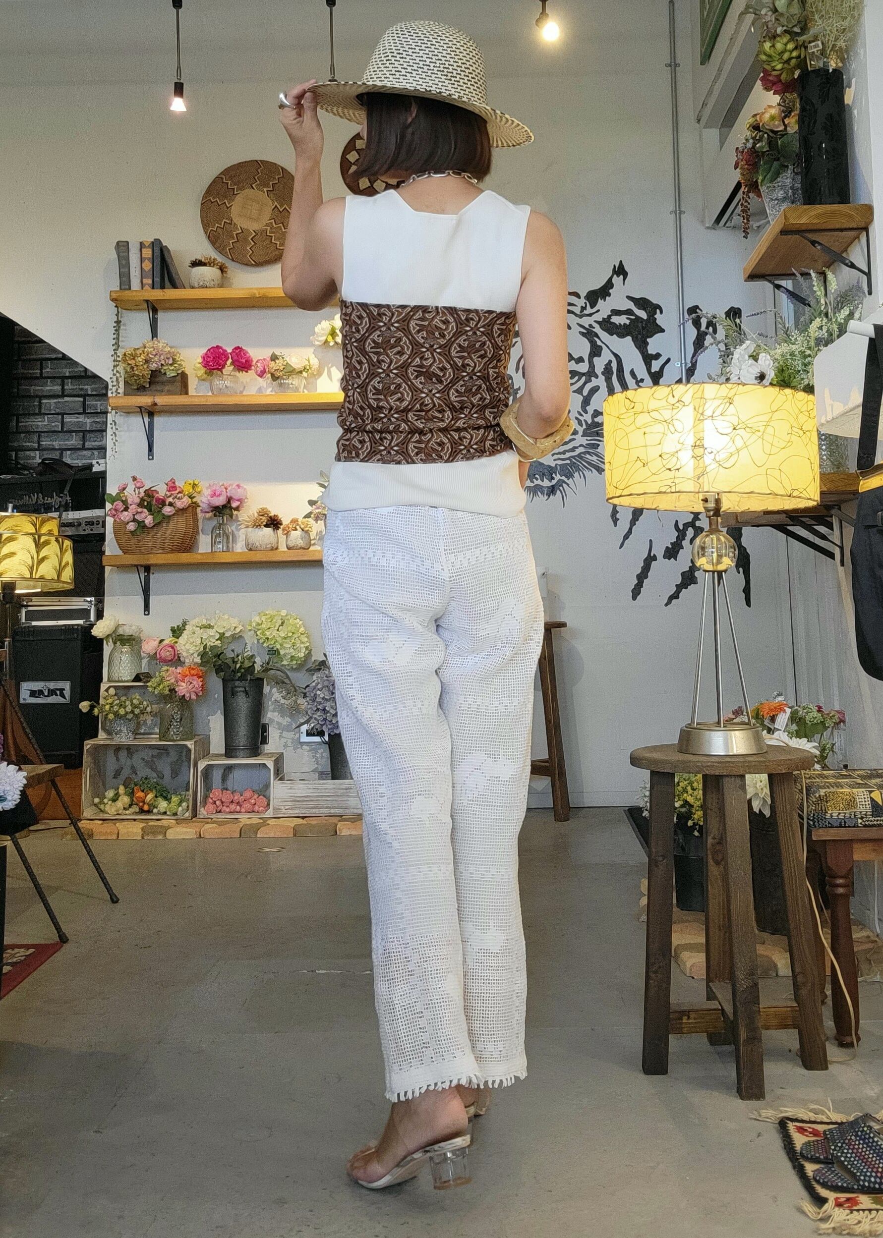 ヴィンテージのコットンクロシェ生地を使用したリメイクイージーパンツ。ウエストはゴム仕様です。裏地は付いていませんのでペチコートパンツやレギンス等の着用が必要です。軽量で見た目にも涼しく水着の上に合わせるのもおすすめです。