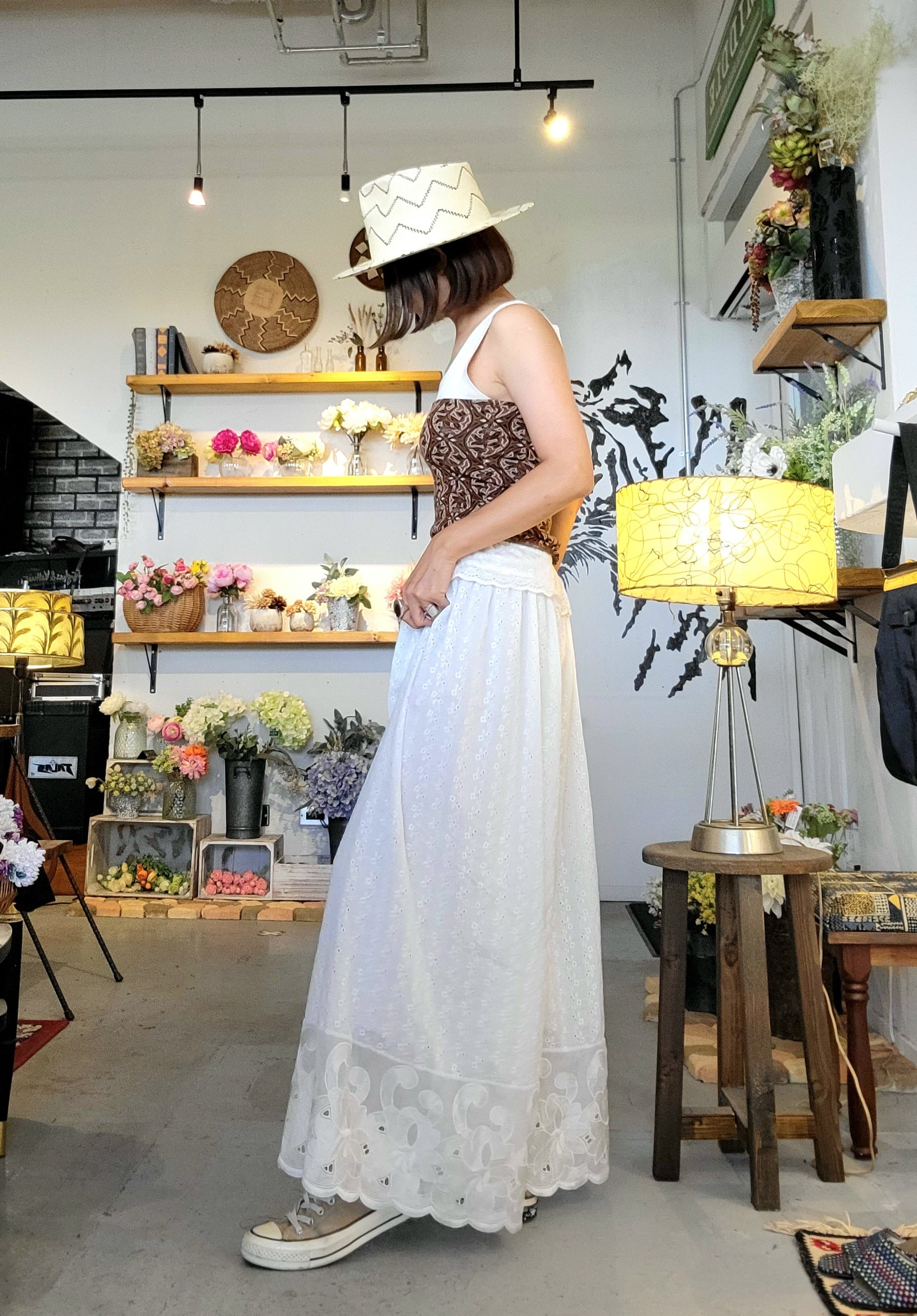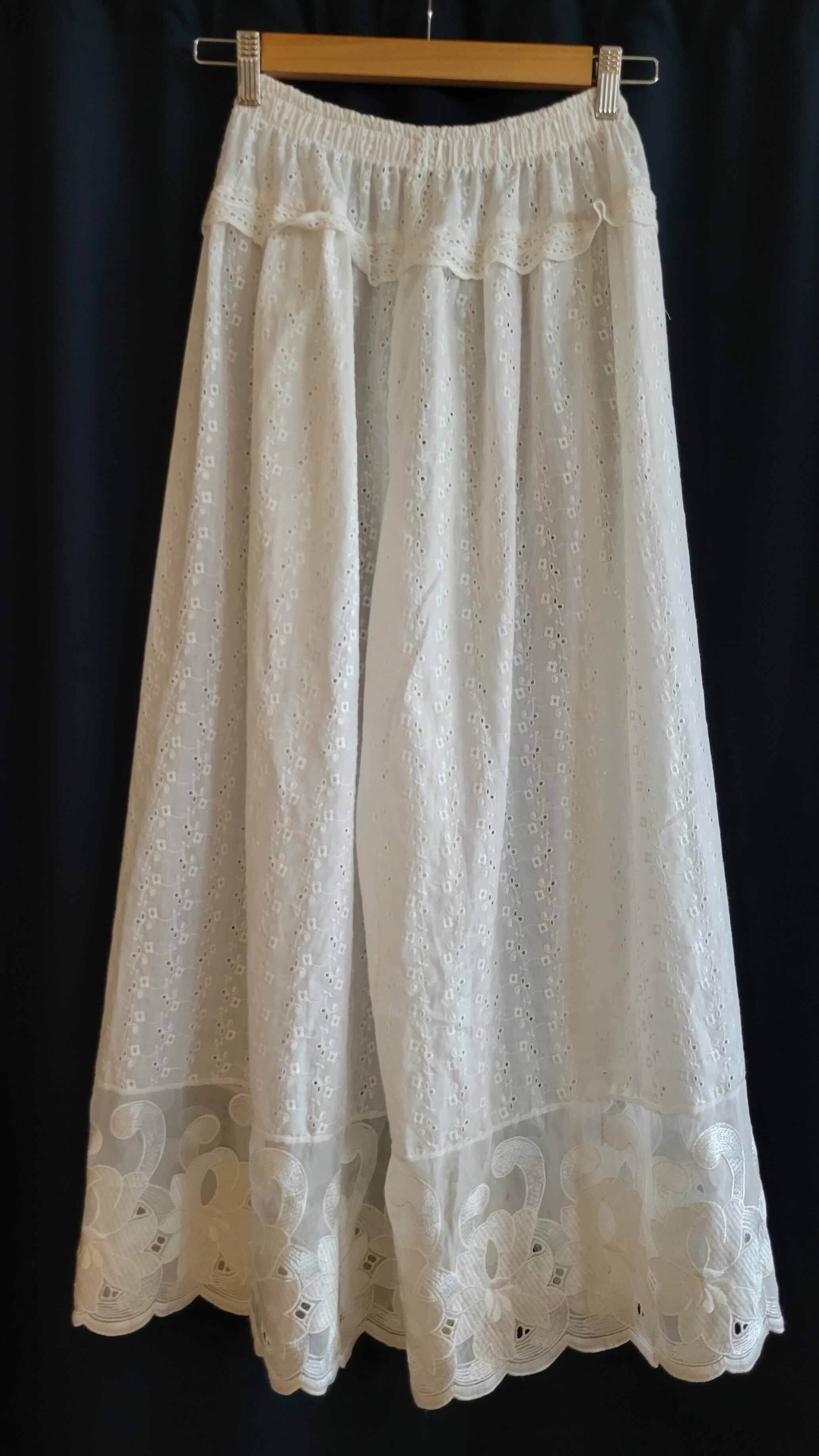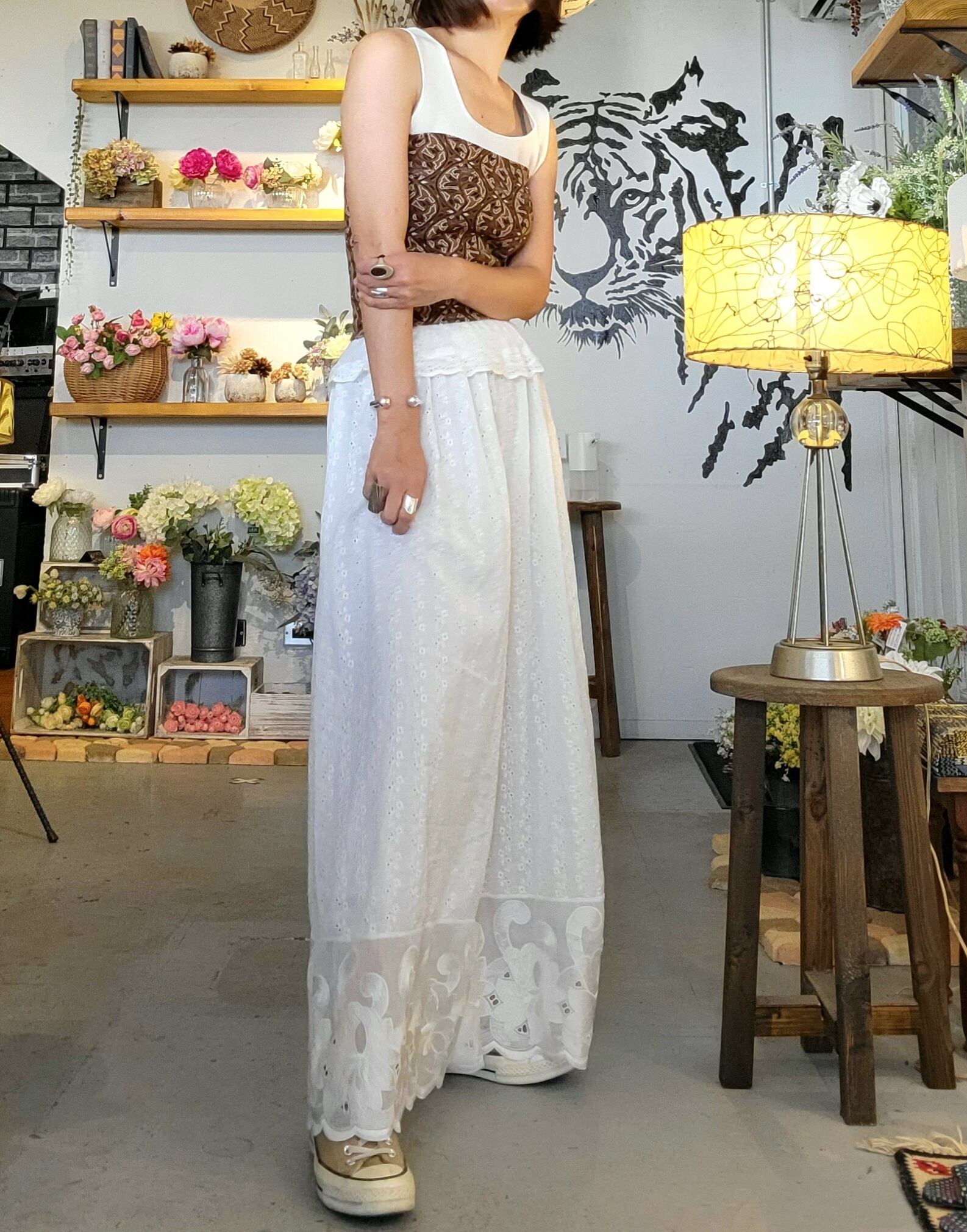 ヴィンテージのワイドパンツ。素材表記はありませんがコットンのようです。ウエストはゴム仕様。全体がアイレットレース、裾は切り替えで異なるレースがあしらわれています。