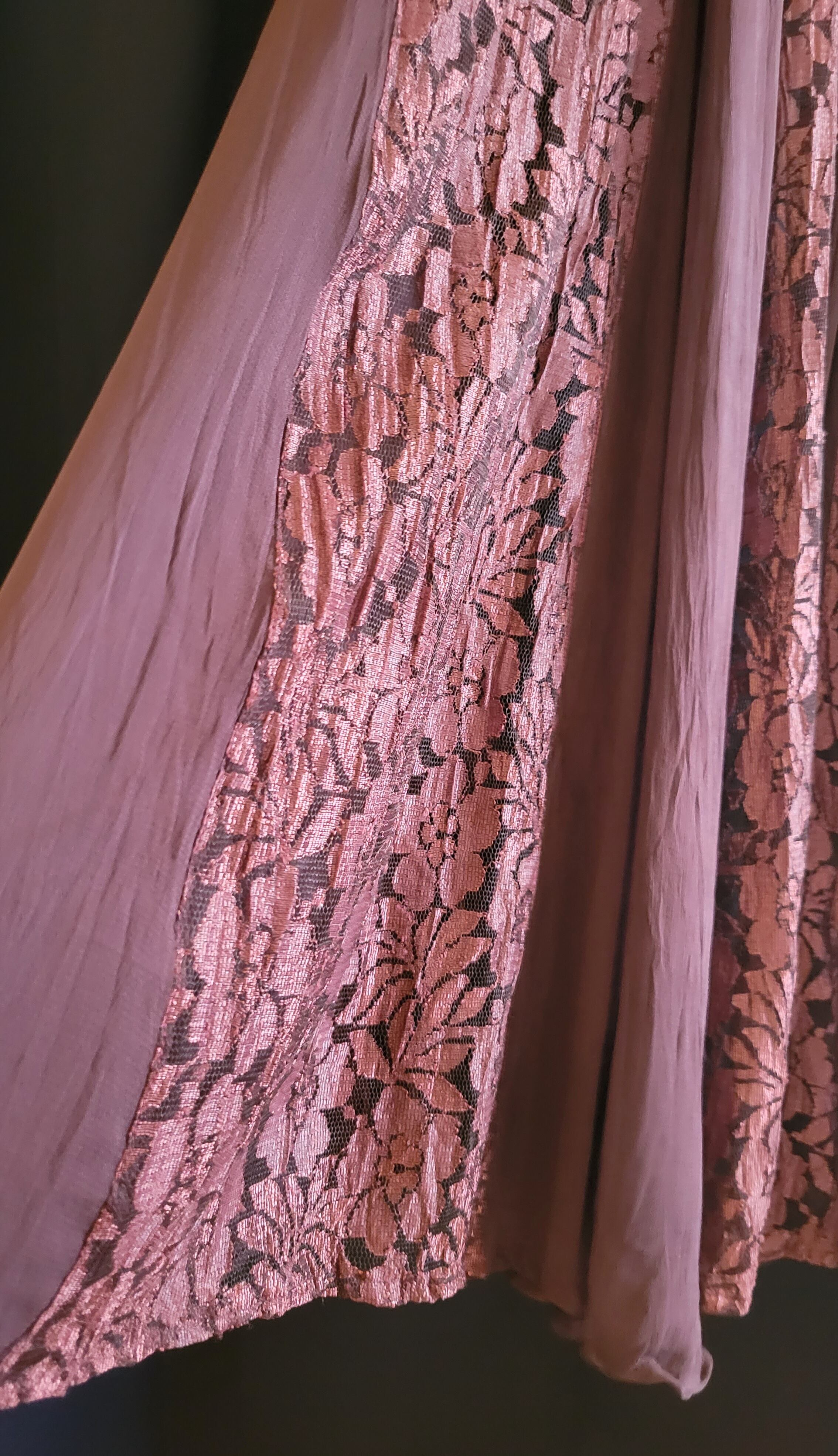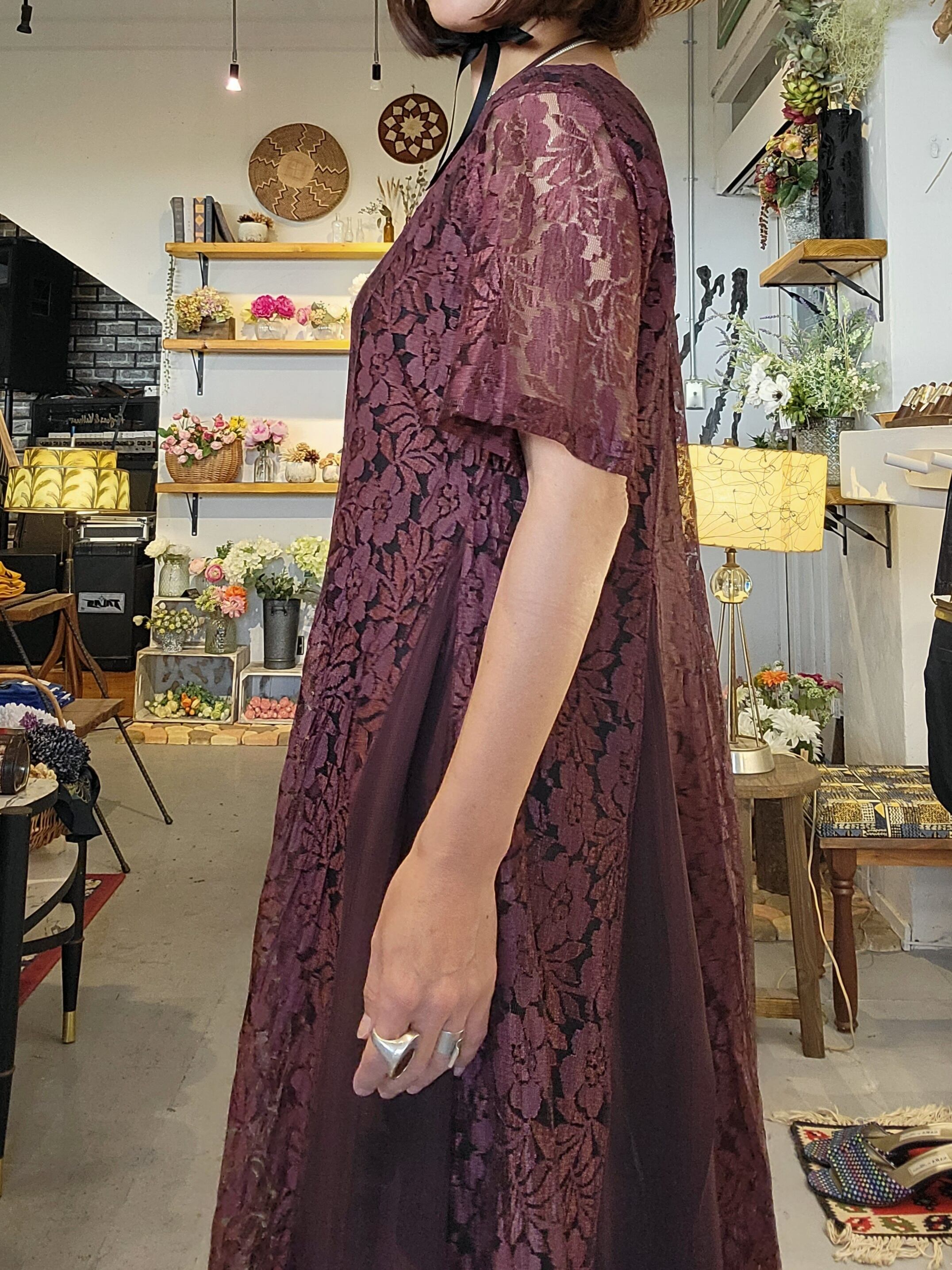 インド製のヴィンテージ総レースワンピース。素材表記はありませんがレーヨンのようです。コットンの裏地付きで1枚で着られます。光沢のある総レースですがスニーカーに合わせてカジュアルにも着られます。
