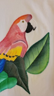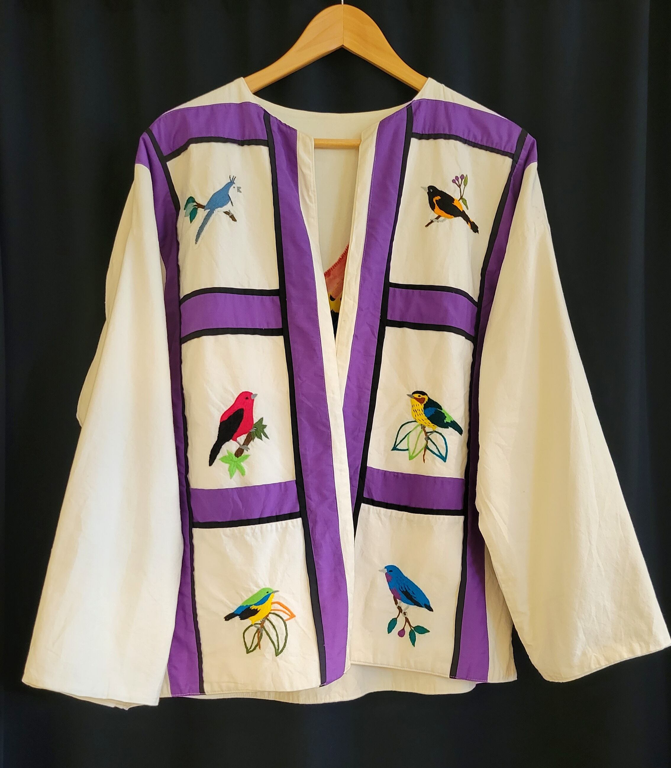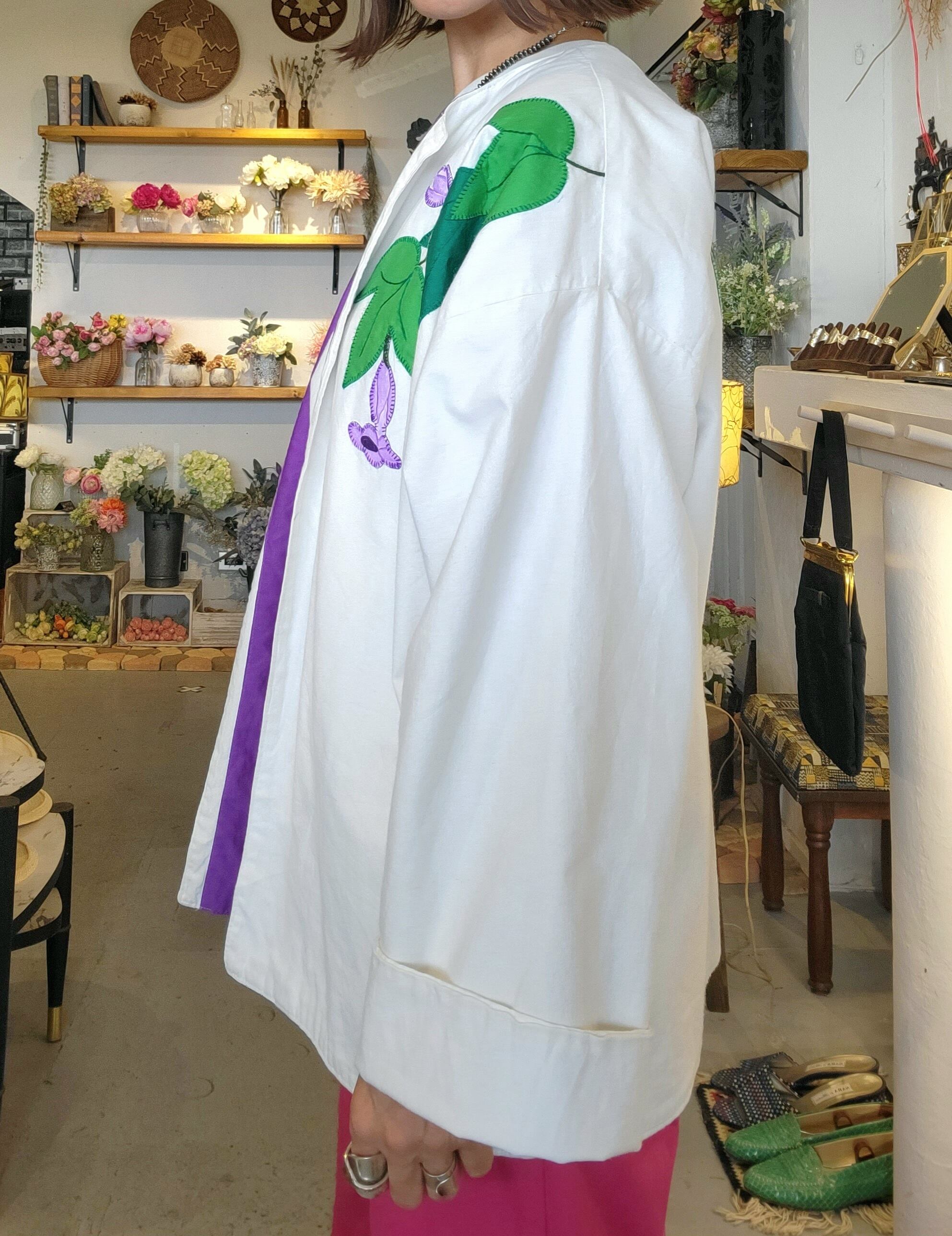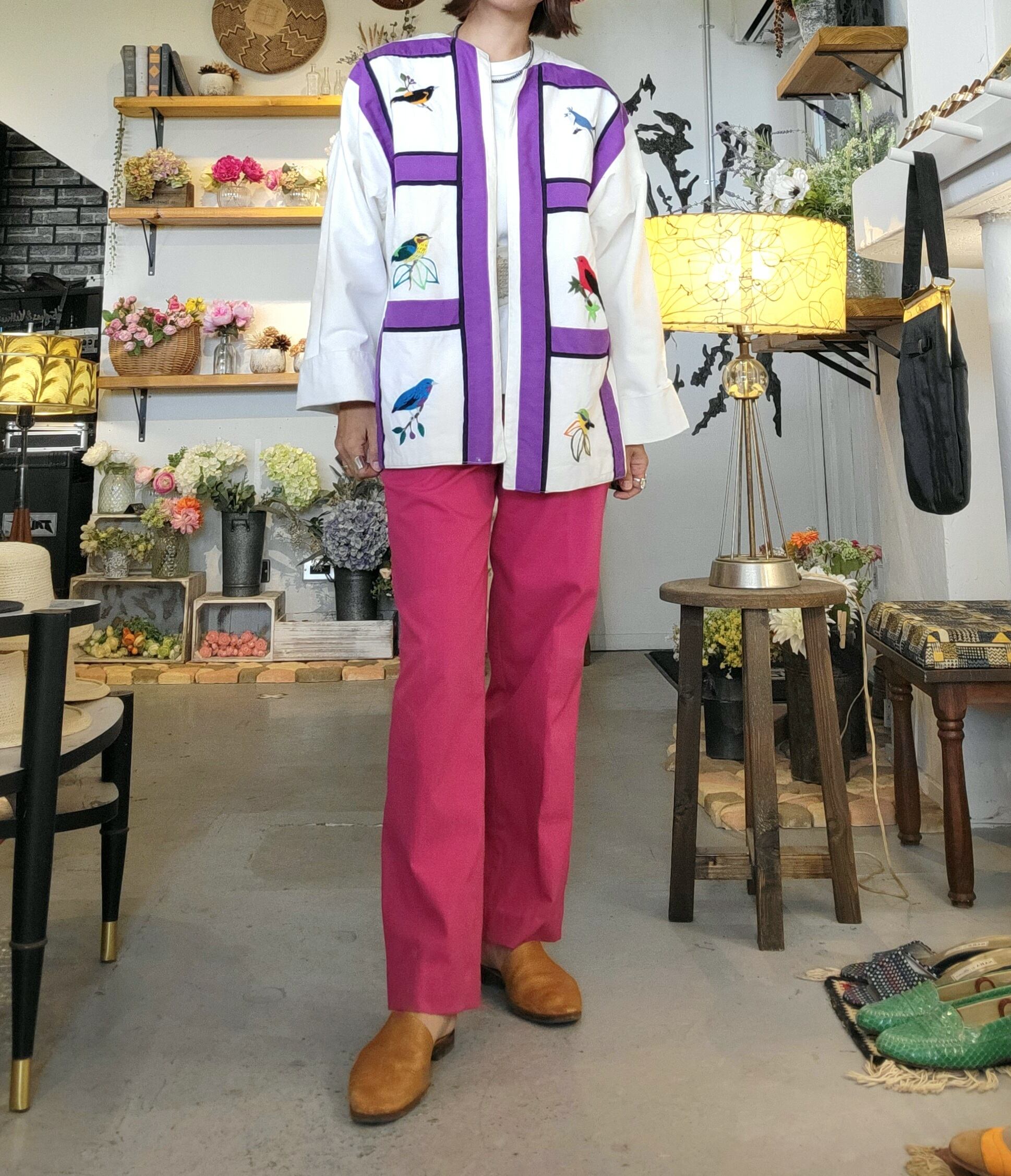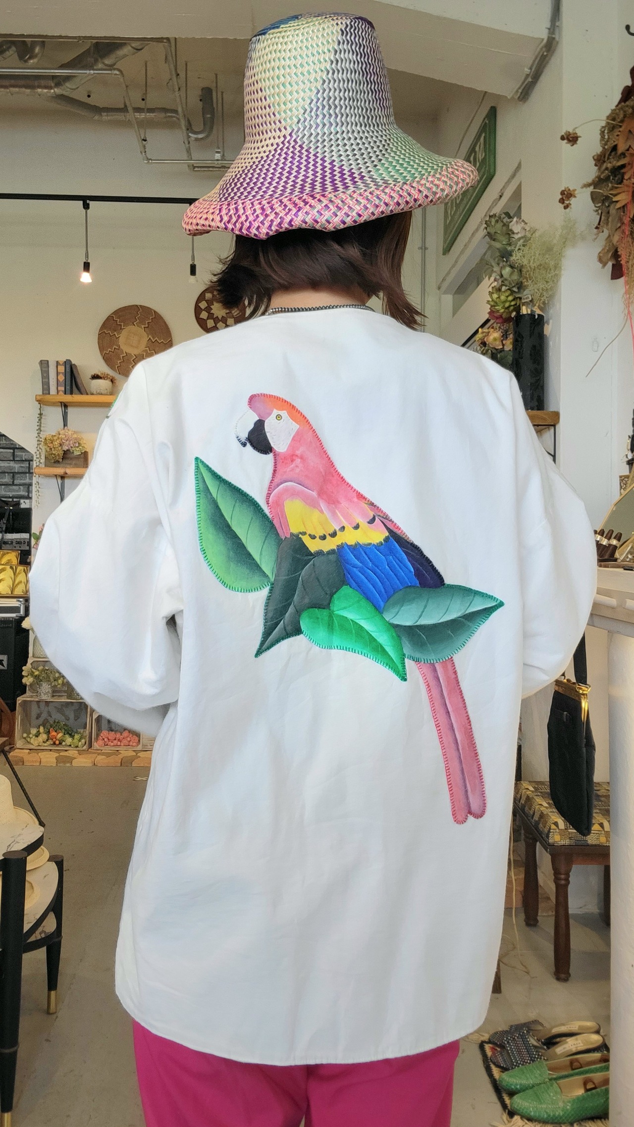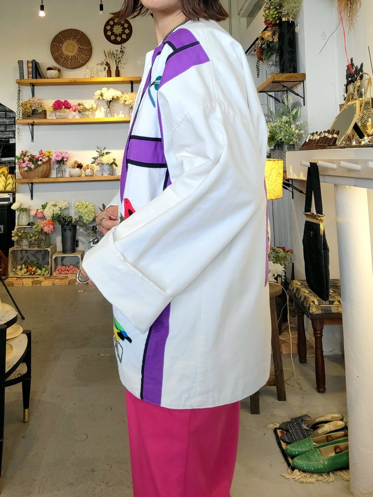 ヴィンテージのフロントオープンのコットンジャケット。リバーシブル仕様です。鳥のモチーフがアップリケや刺繍で施されたユニークな1枚。幅広いサイズに対応できユニセックスで着用できます。