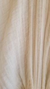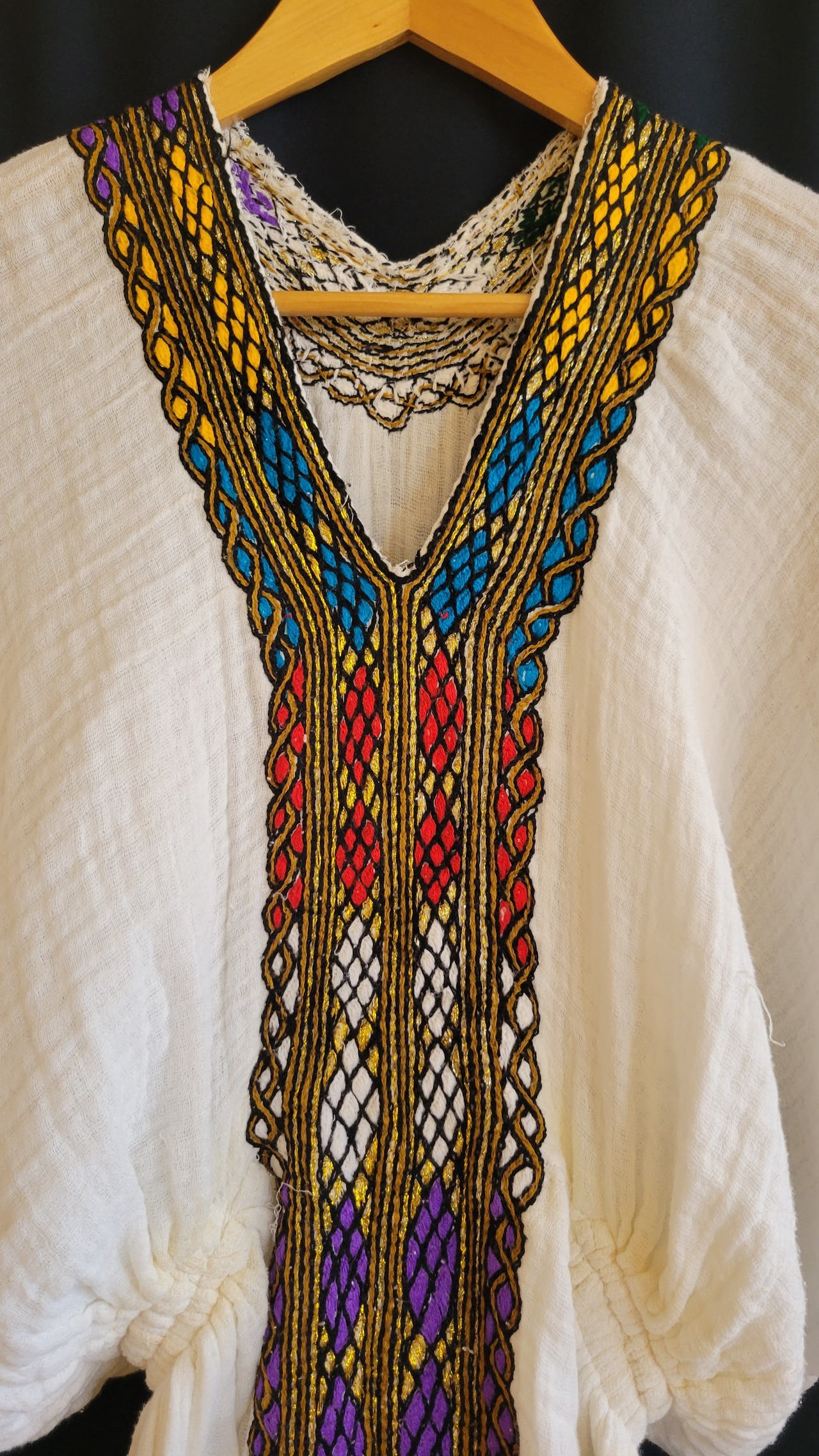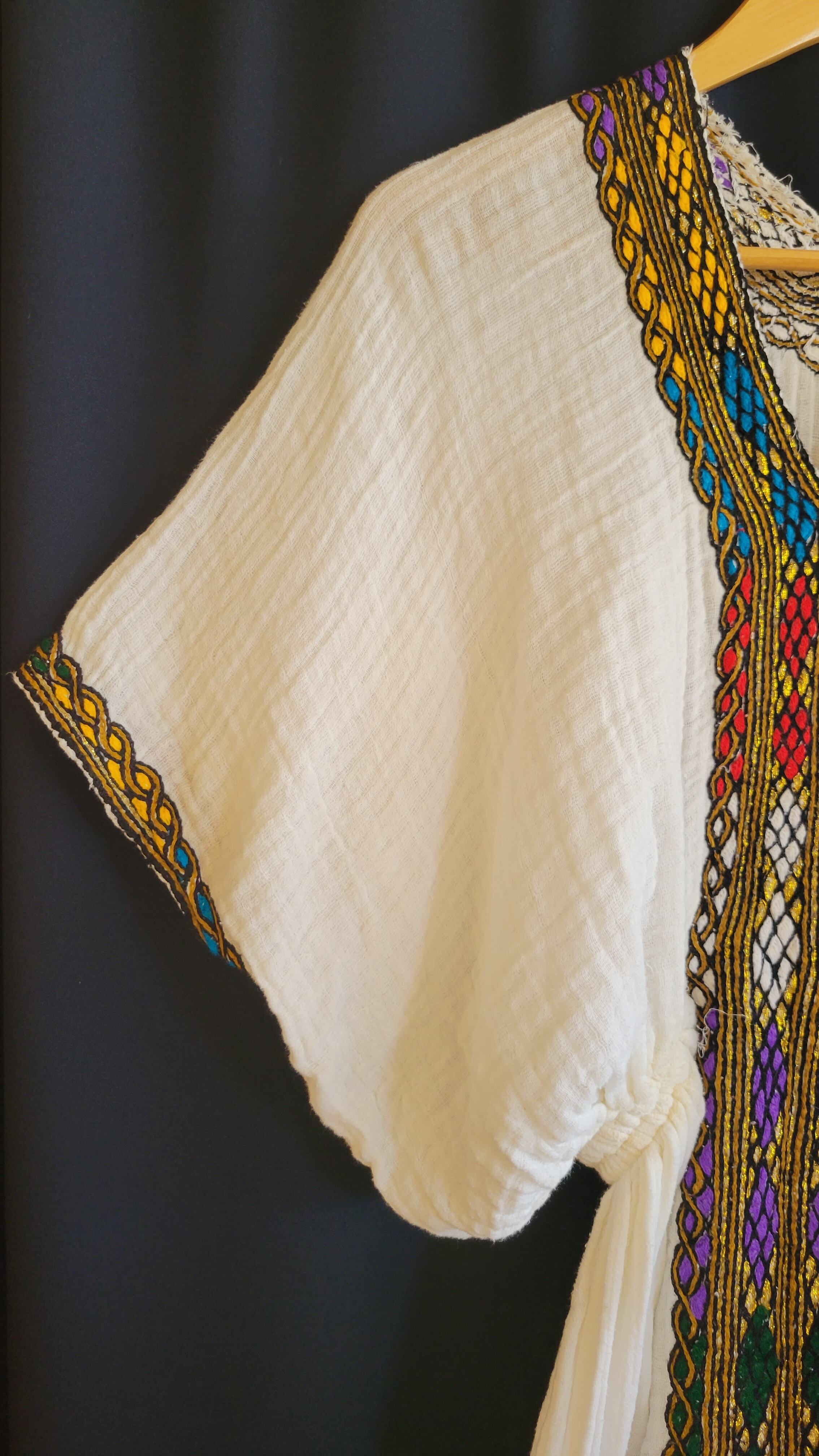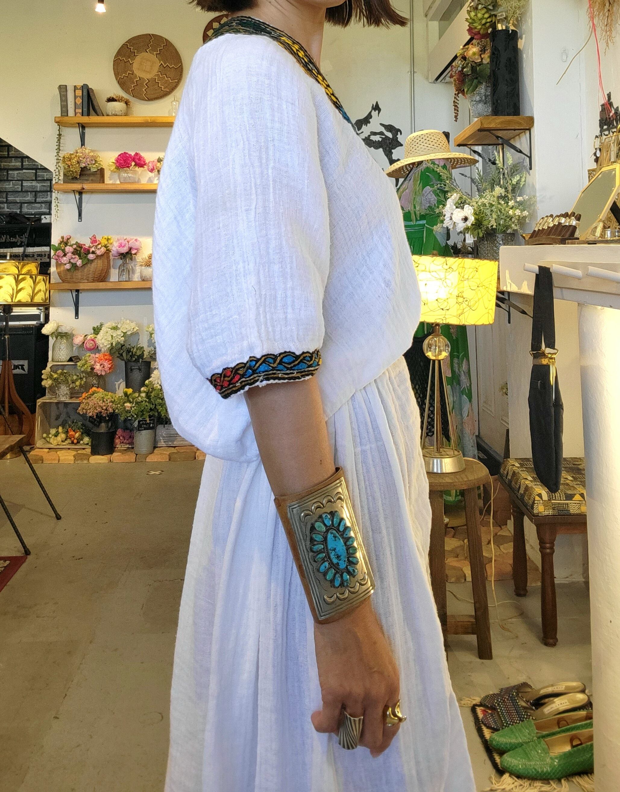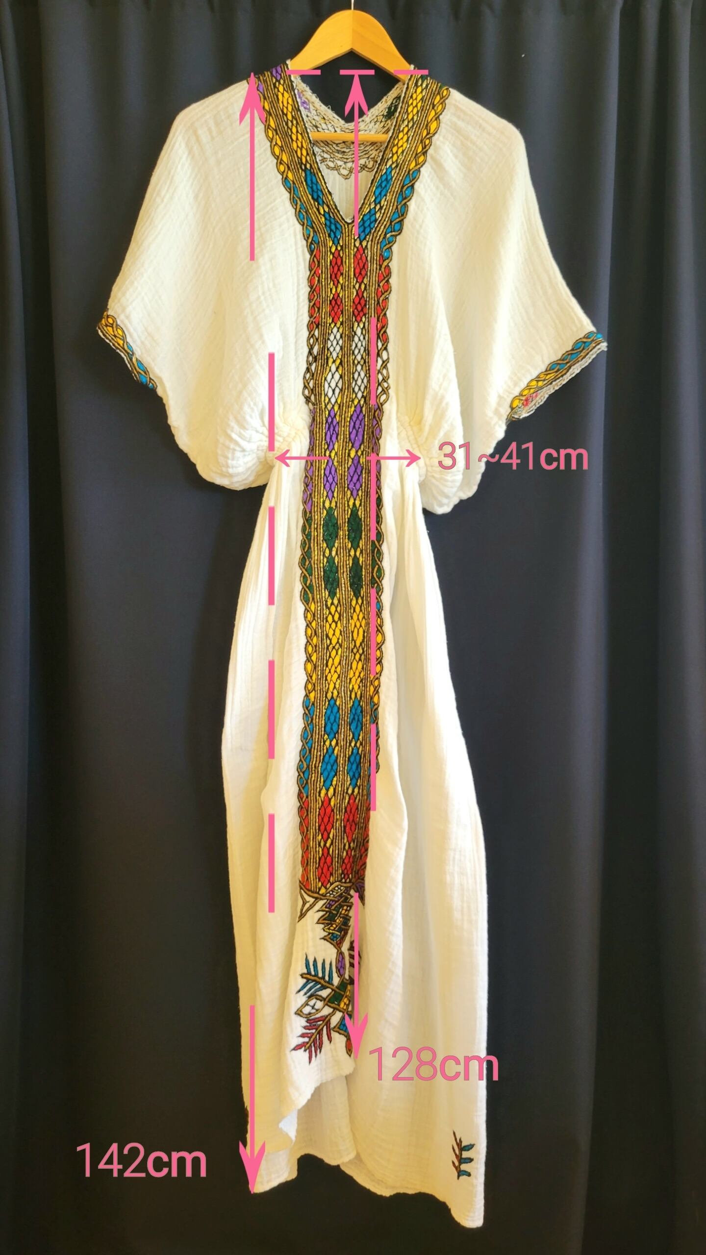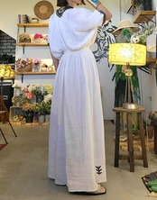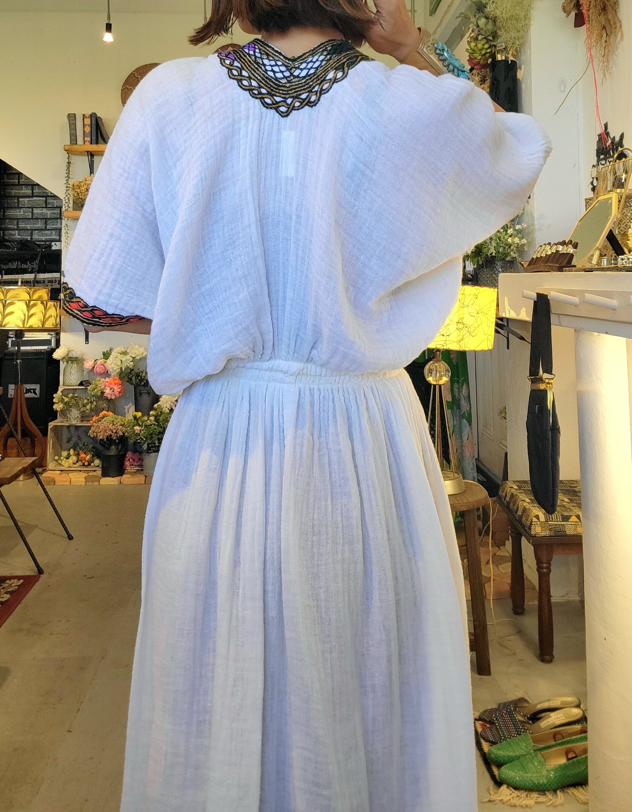 ヴィンテージの刺繍カフタンマキシワンピース。素材表記はありませんがコットンガーゼ。ふんわり柔らかな肌触りです。ウエストはゴム仕様で着用時に自然なブラウジングになります。フロント中央の着丈が、サイド・バックに比べ短くなっています。