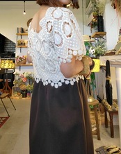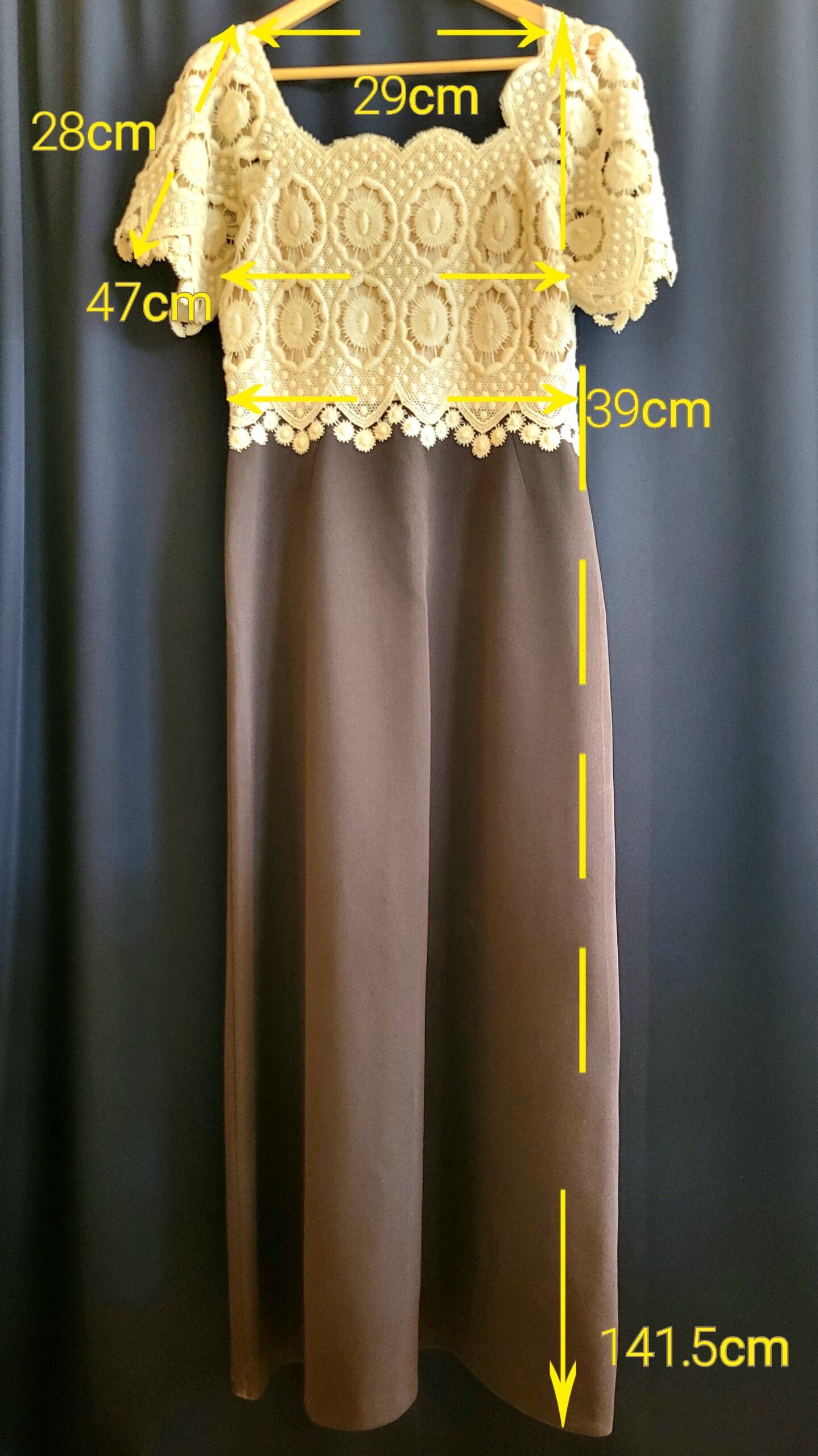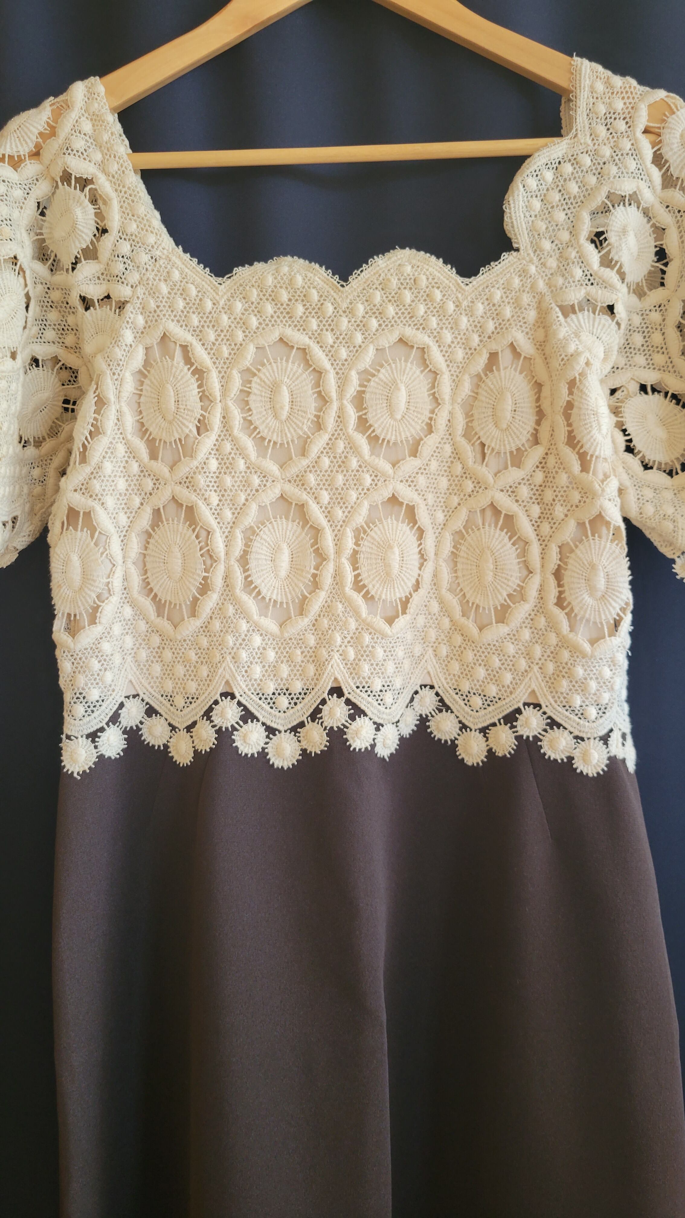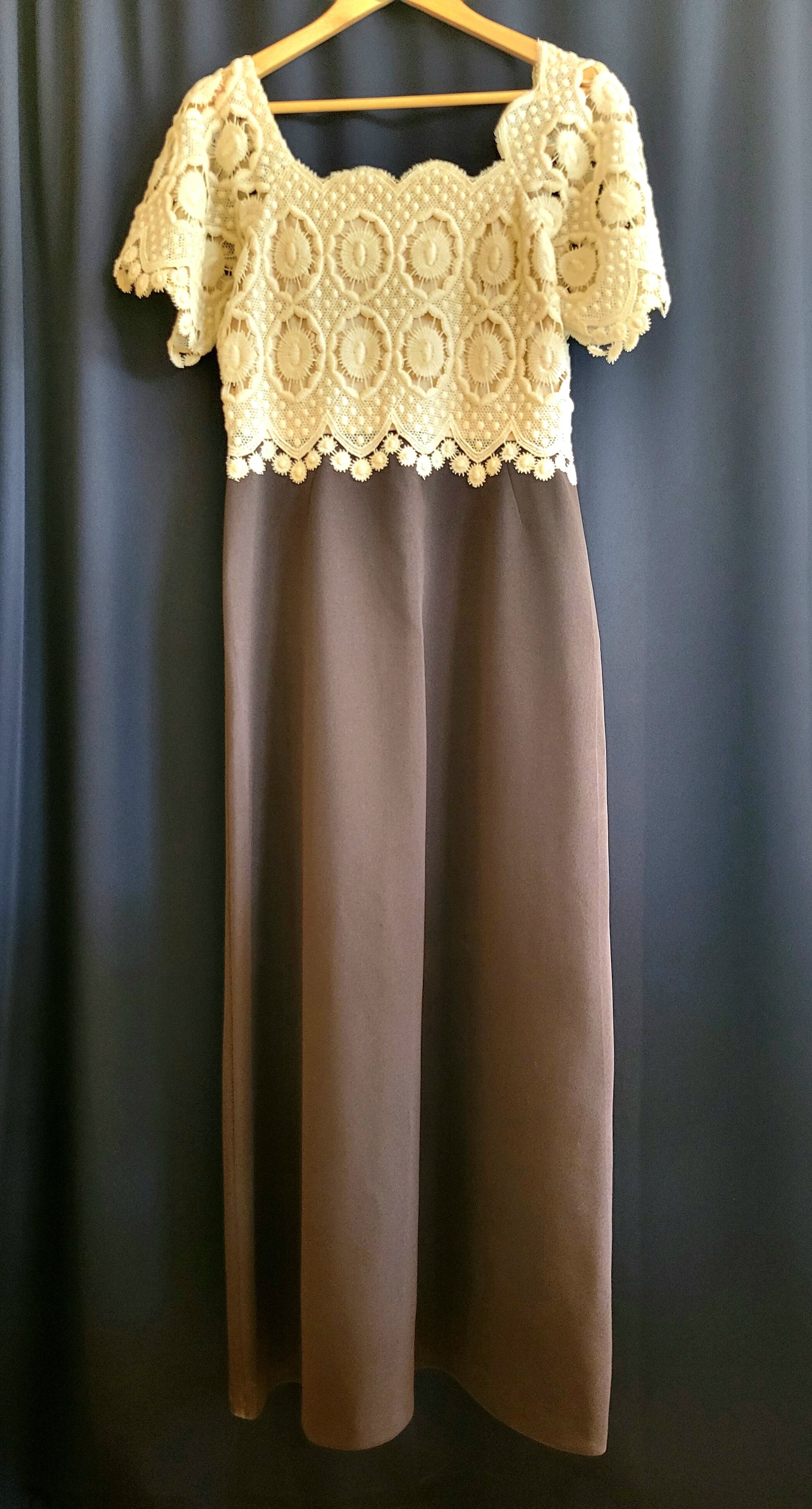 Made in Spain のヴィンテージのマキシドレス。素材表記はありませんがやや厚みのあるポリエステルのような素材感です。バックファスナー付き。大きく開いたデコルテ&背中のスカラップレースが華やか。広がりすぎないAラインシルエットがシックです。