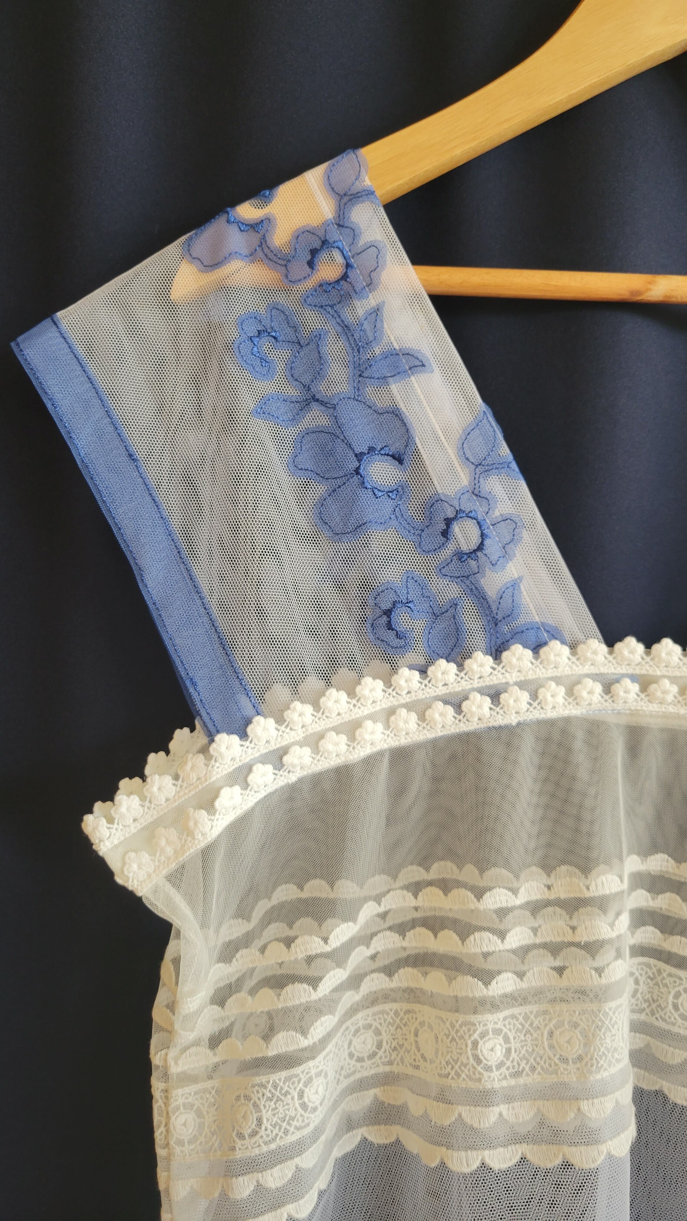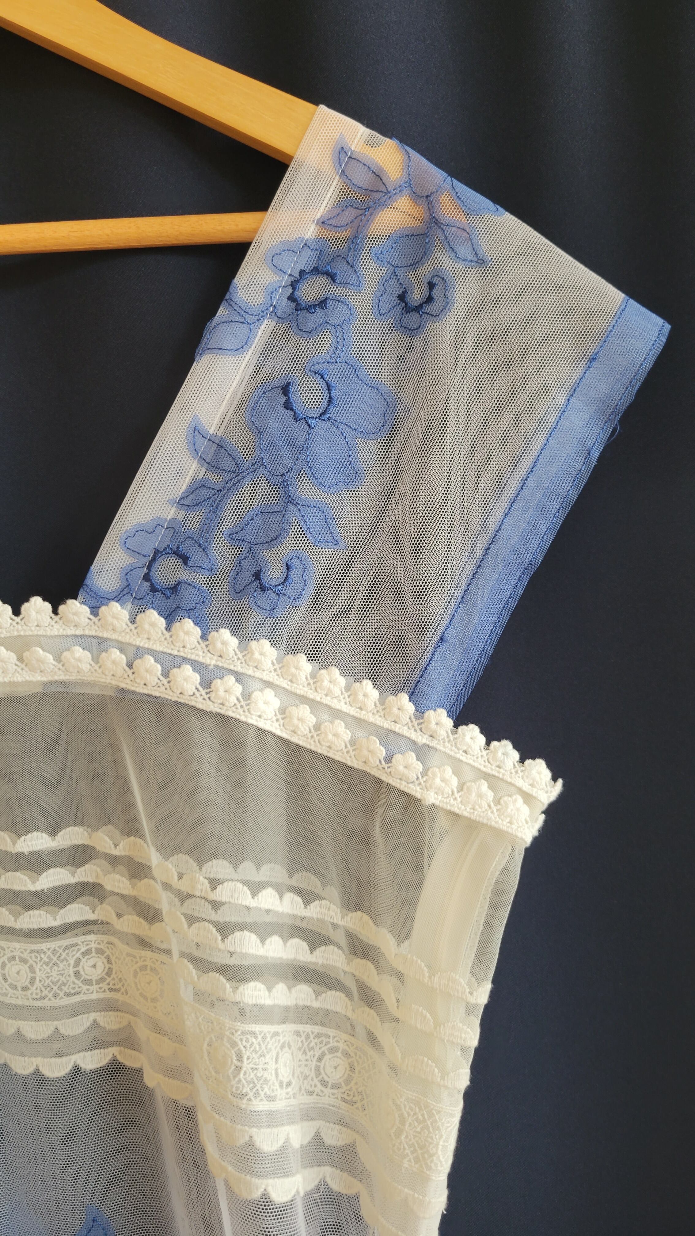 ヴィンテージのチュールレースを使用したリメイクワンピース。左脇下にジッパー付き。すとんと落ちるシルエットとシアー感が素敵なワンピースです。