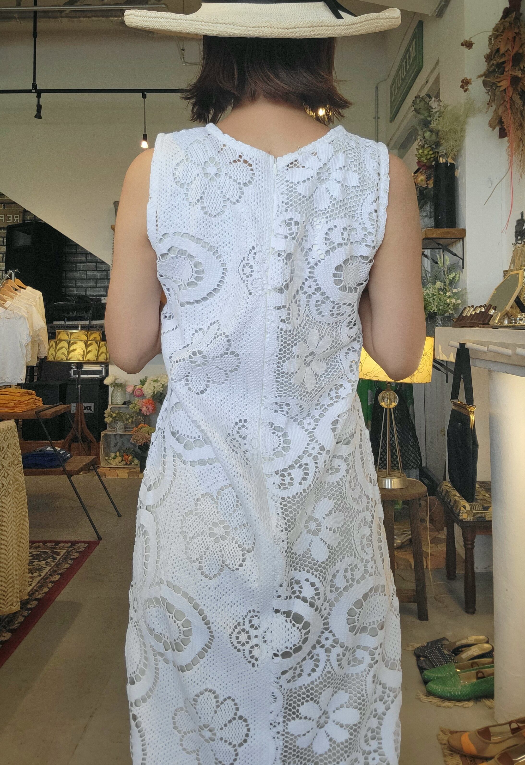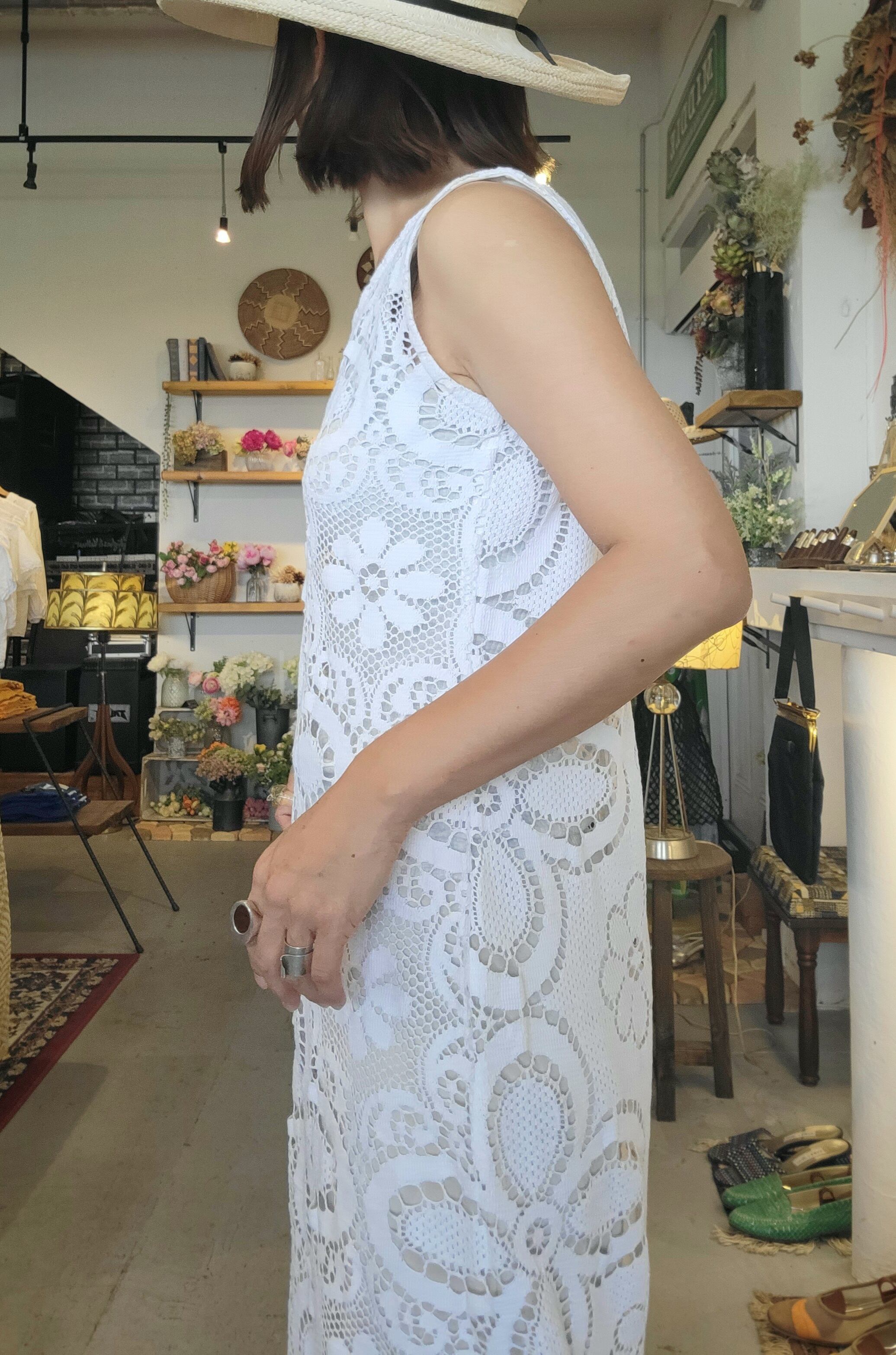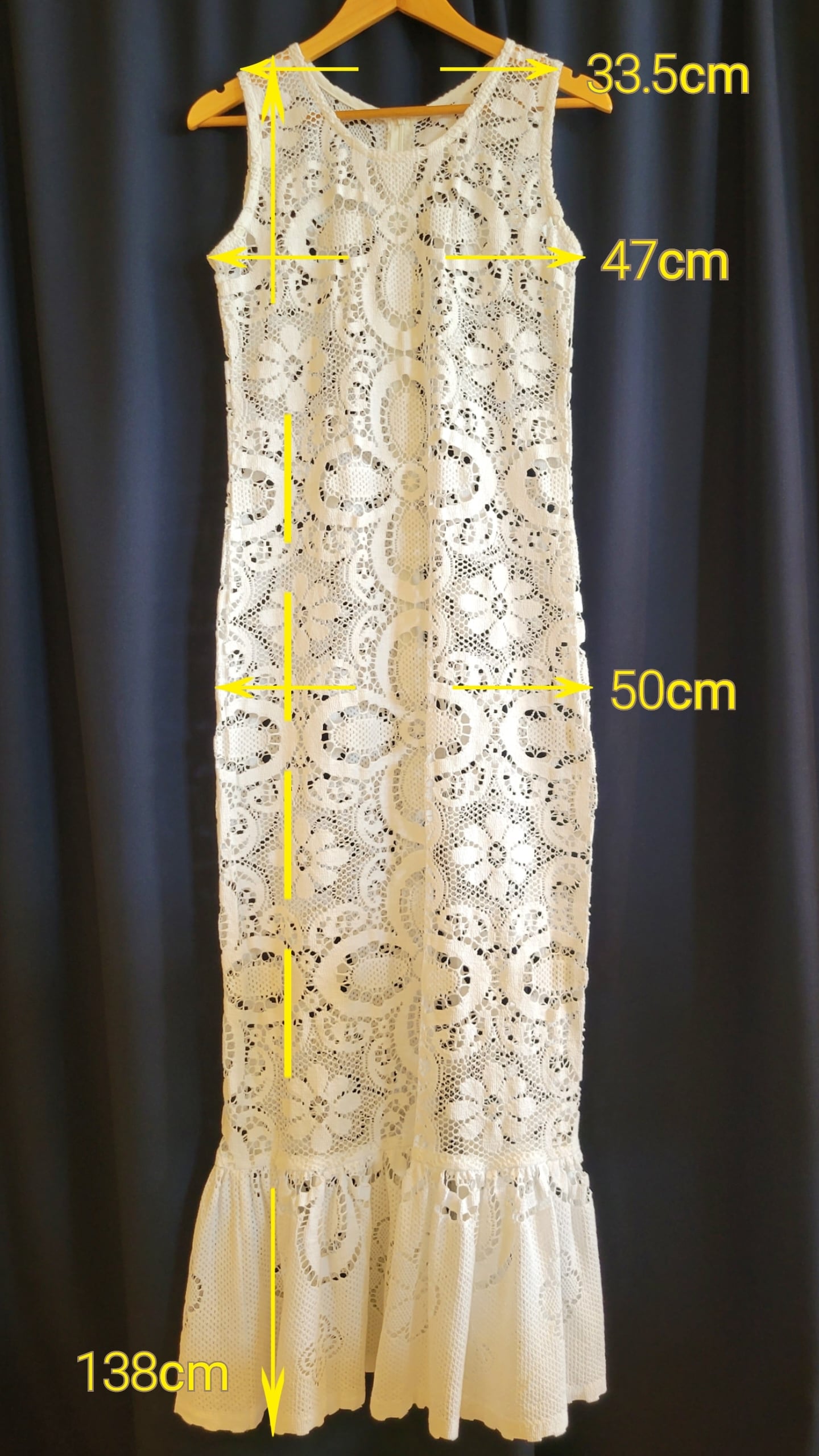 ヴィンテージレースたっぷり使用したリメイクマキシドレス。素材はおそらくコットンです。バックファスナー付き。すっきりシルエットにボリュームのある裾フリルが良いアクセントに。