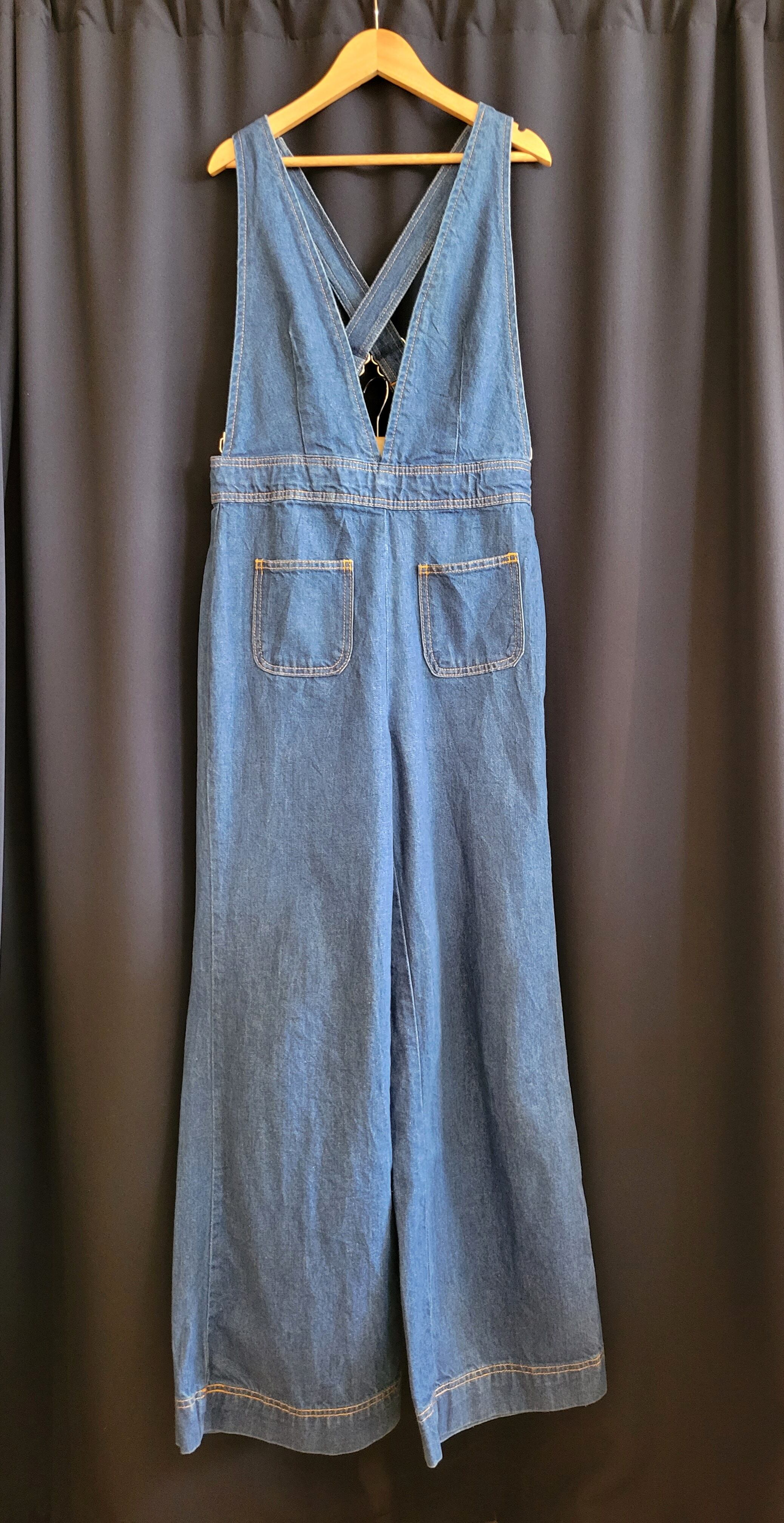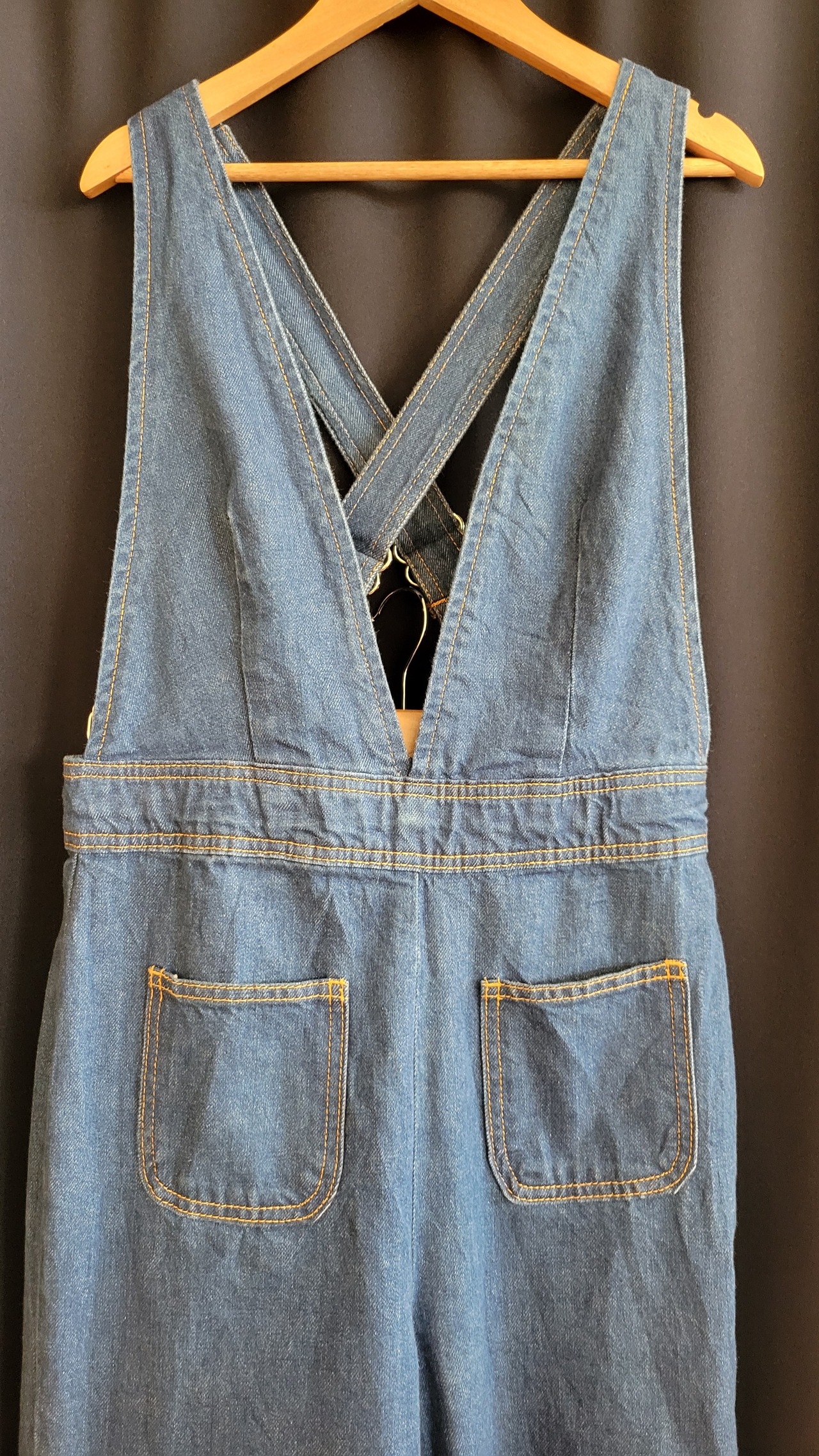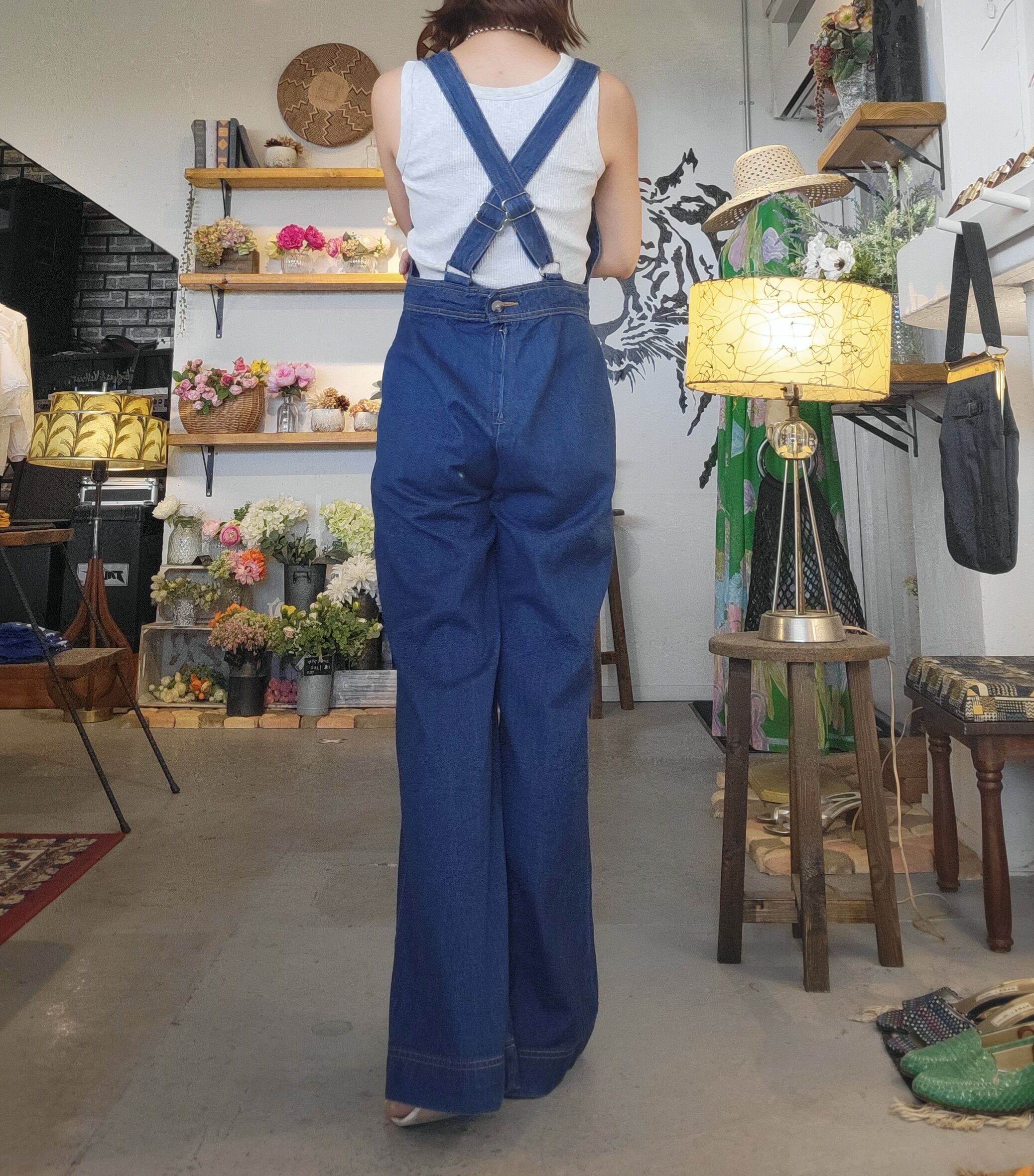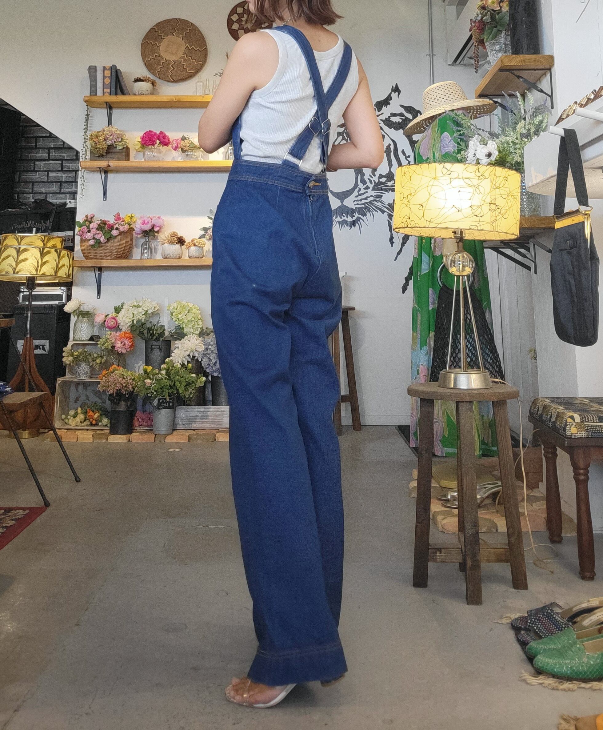 ヴィンテージのデニムサロペット。素材表記はありませんがコットンです。バックにボタンが一つとジッパーが付いています。前後どこから見ても可愛いこだわりのデザインとコンディションの良さが魅力です。