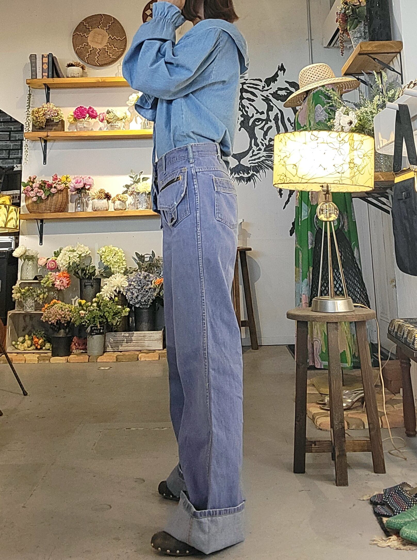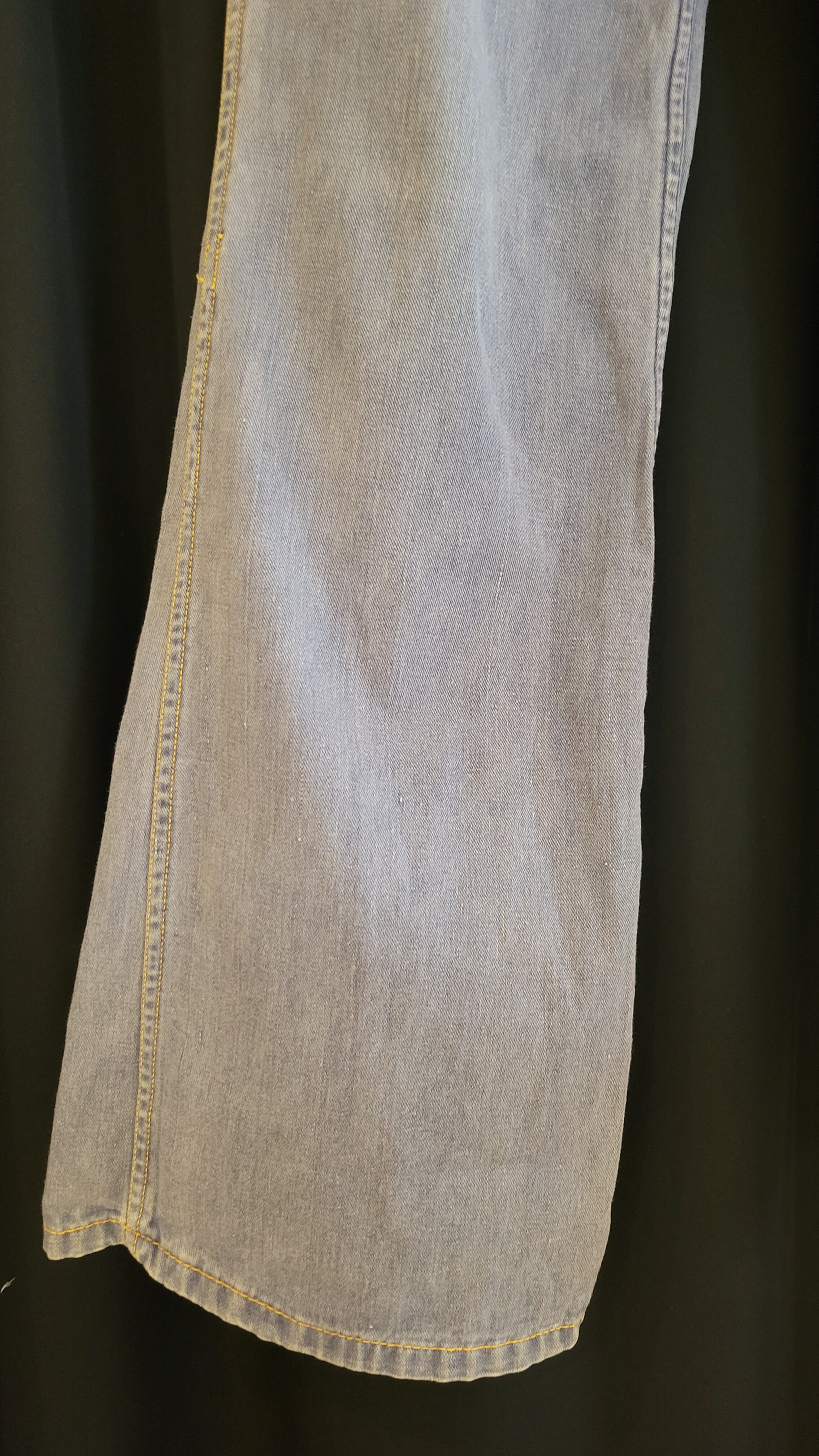 ヴィンテージのデニムフレアパンツ。ほどよく馴染んだくたっとしたデニムです。デザインポケットに広がりすぎないフレアシルエットが大人っぽい雰囲気です。男性にもおすすめのサイズ感です。