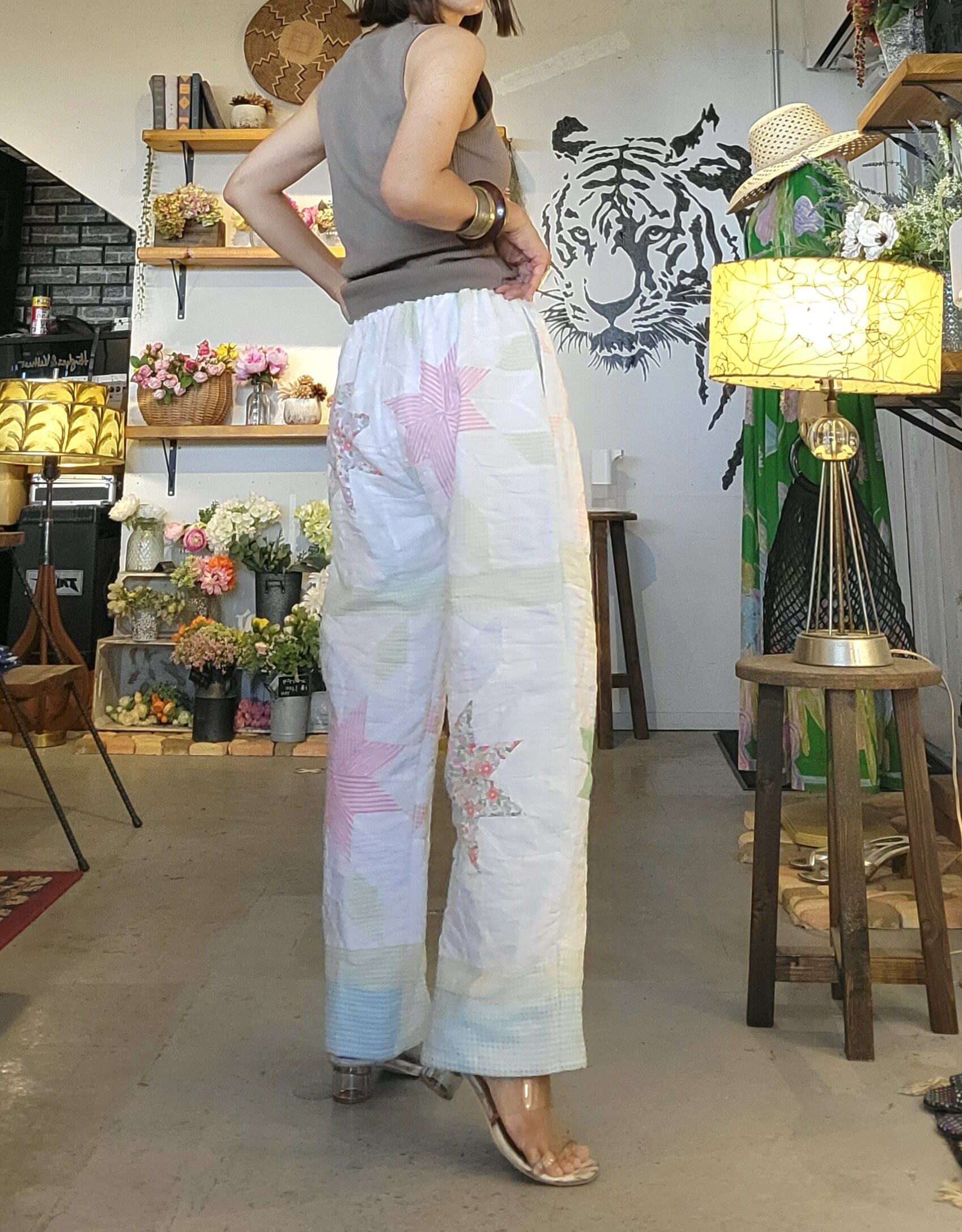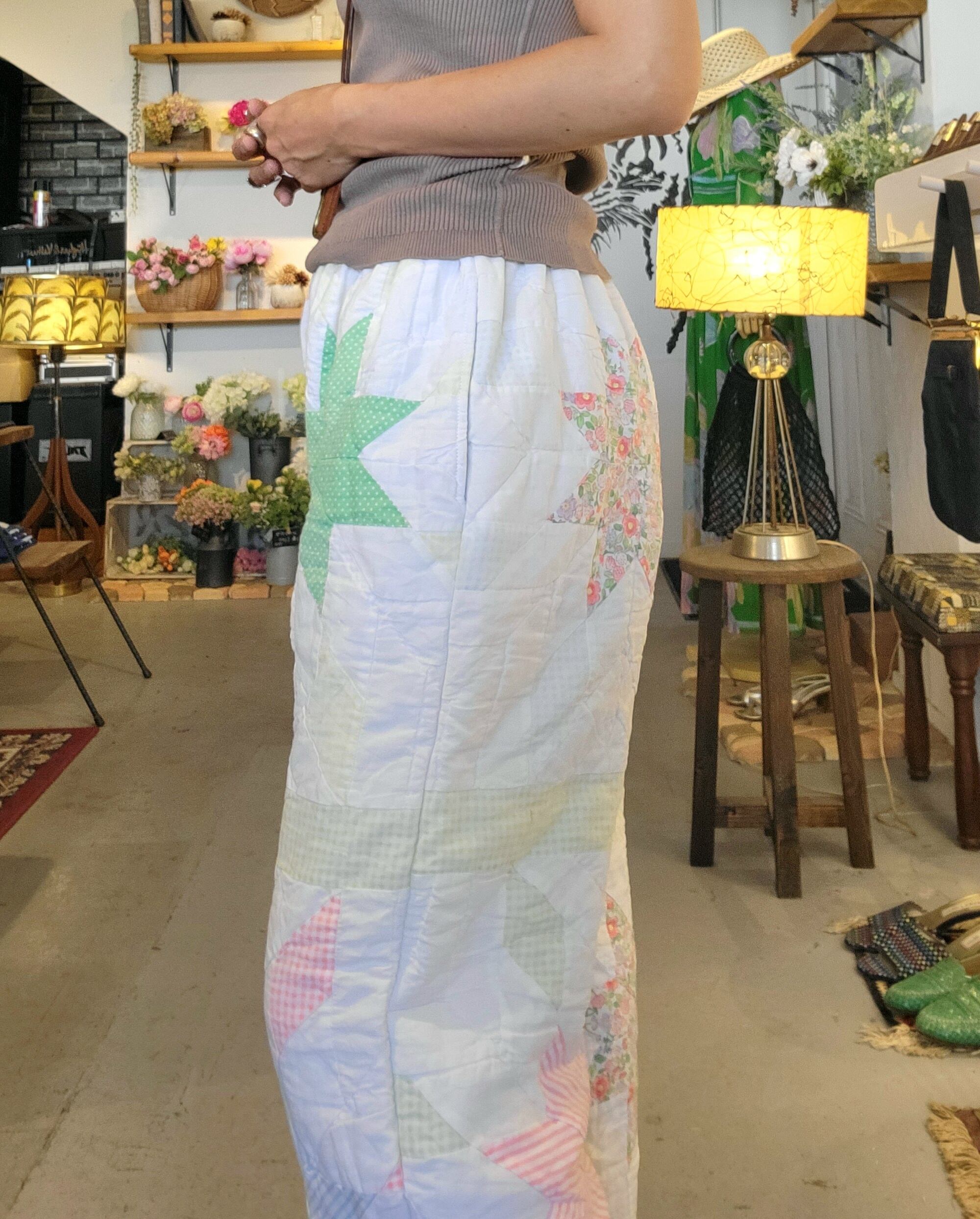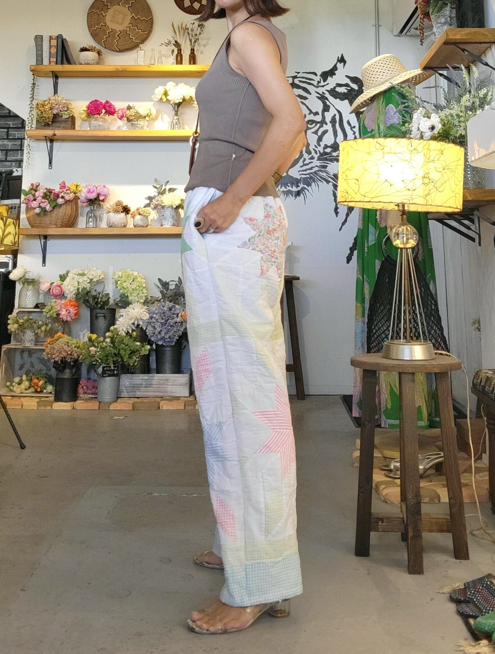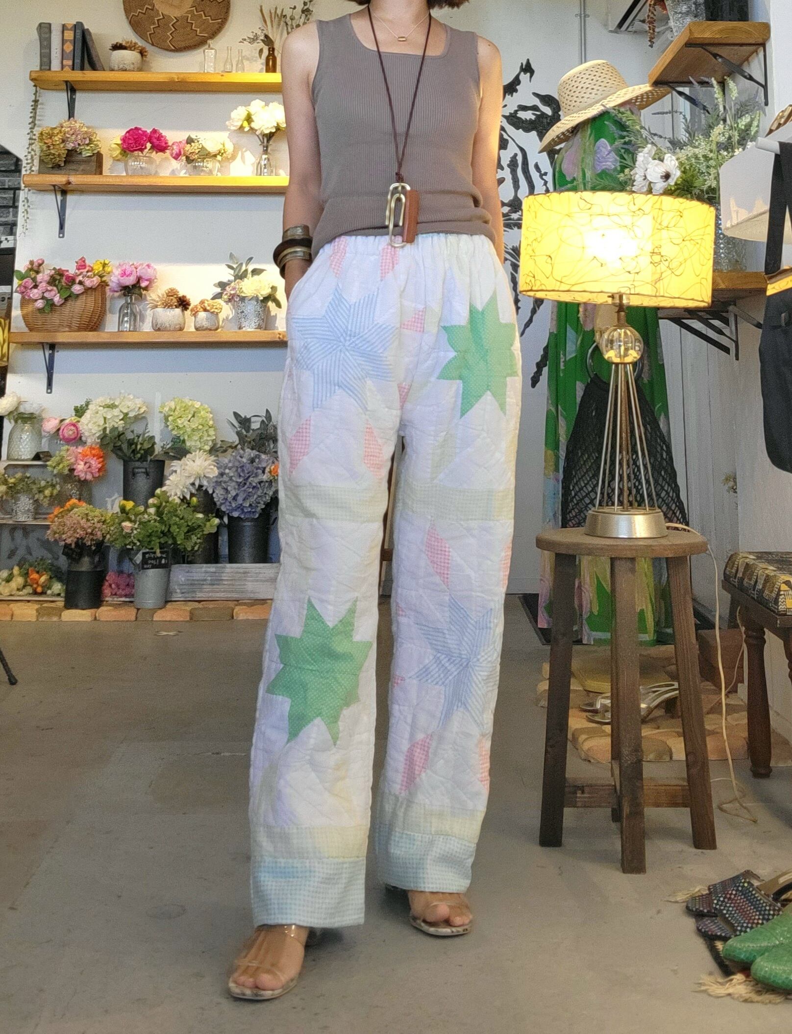 ヴィンテージのパッチワークキルト生地を使用したリメイクイージーパンツ。素材はコットンです。左右にポケット付き。淡いパステルカラーが素敵な一本。
