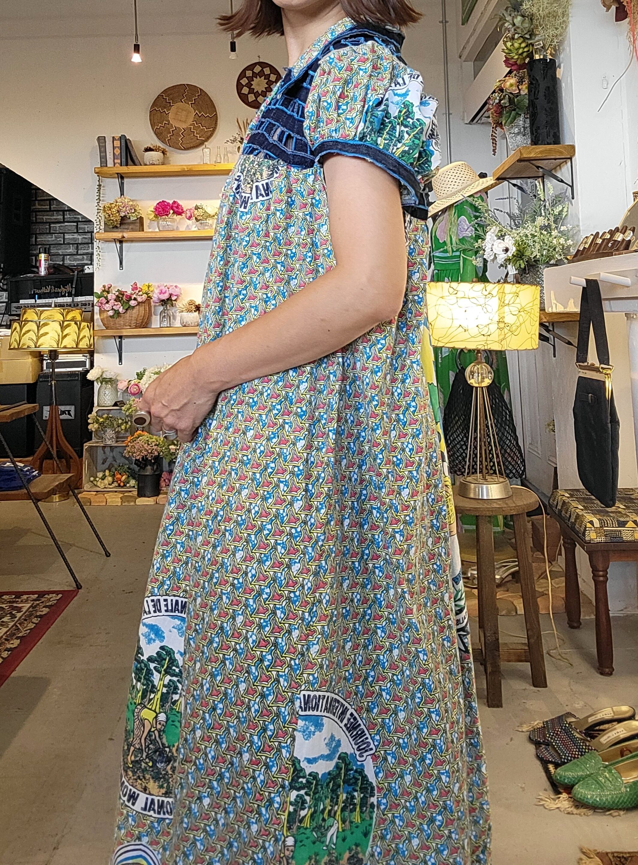 デニム×アフリカンプリントのコットンワンピース。ユニークなプリントは世界女性デー(2012.3.8)のものです。締め付け感の無いゆったりしたデザインで風通し良く涼しく着られます。