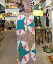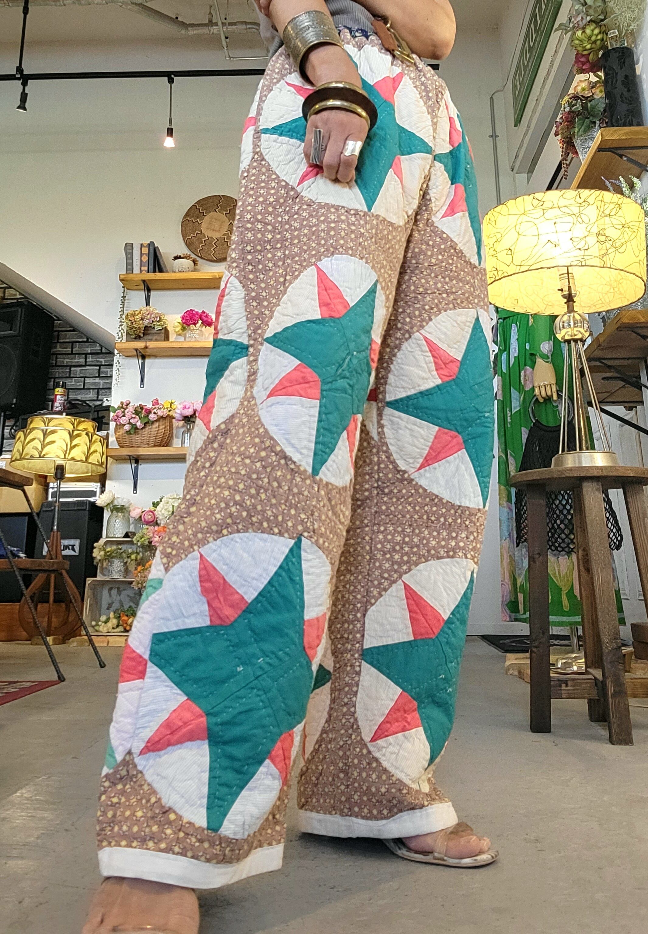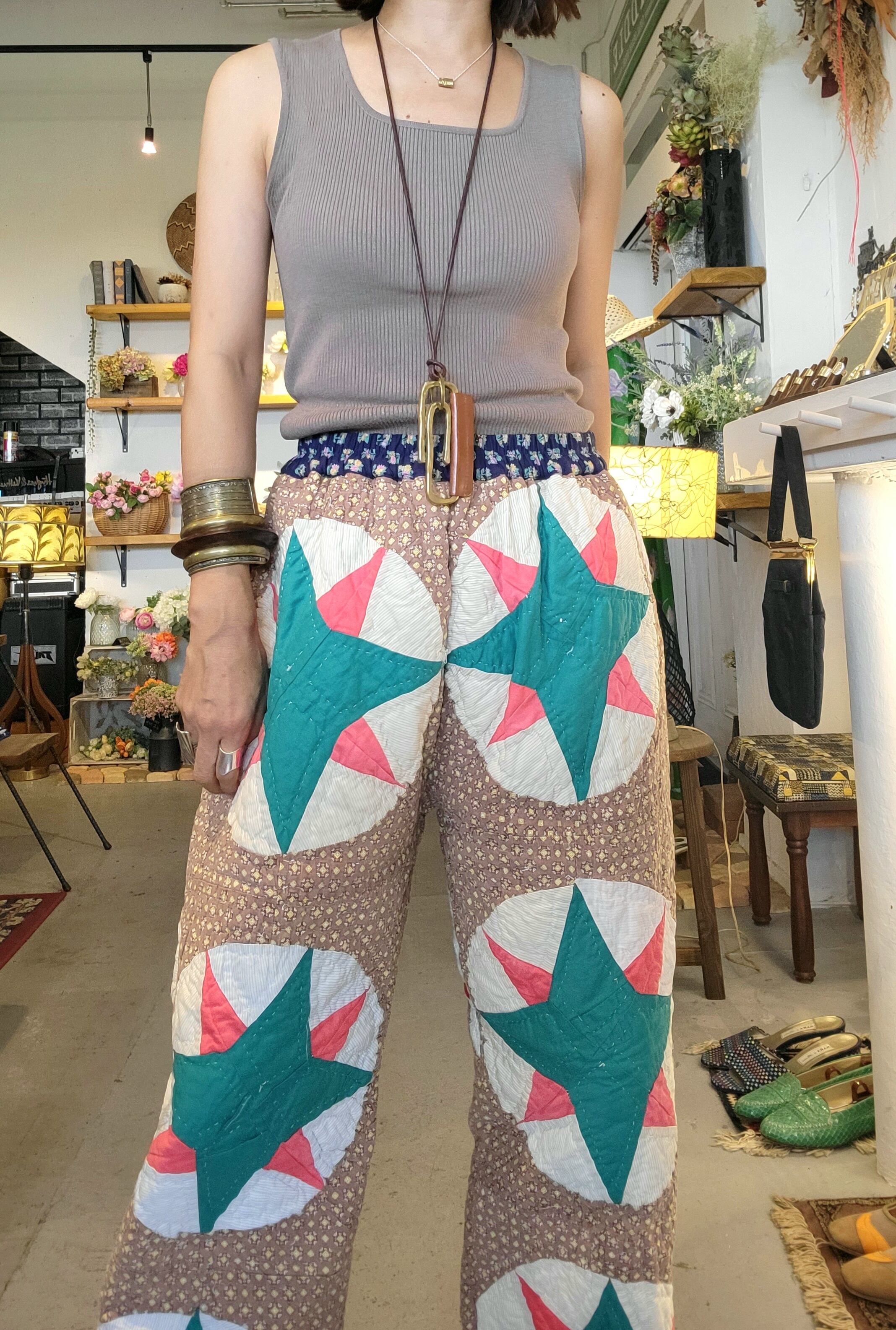 ヴィンテージのパッチワークキルト生地を使用したリメイクパンツ。素材はコットンです。ウエストはゴム仕様、左右にポケット付きです。ゆるやかなテーパードシルエットでこなれた雰囲気。古いハンドキルトならではの温かみのある一本です。