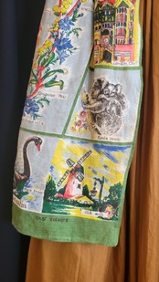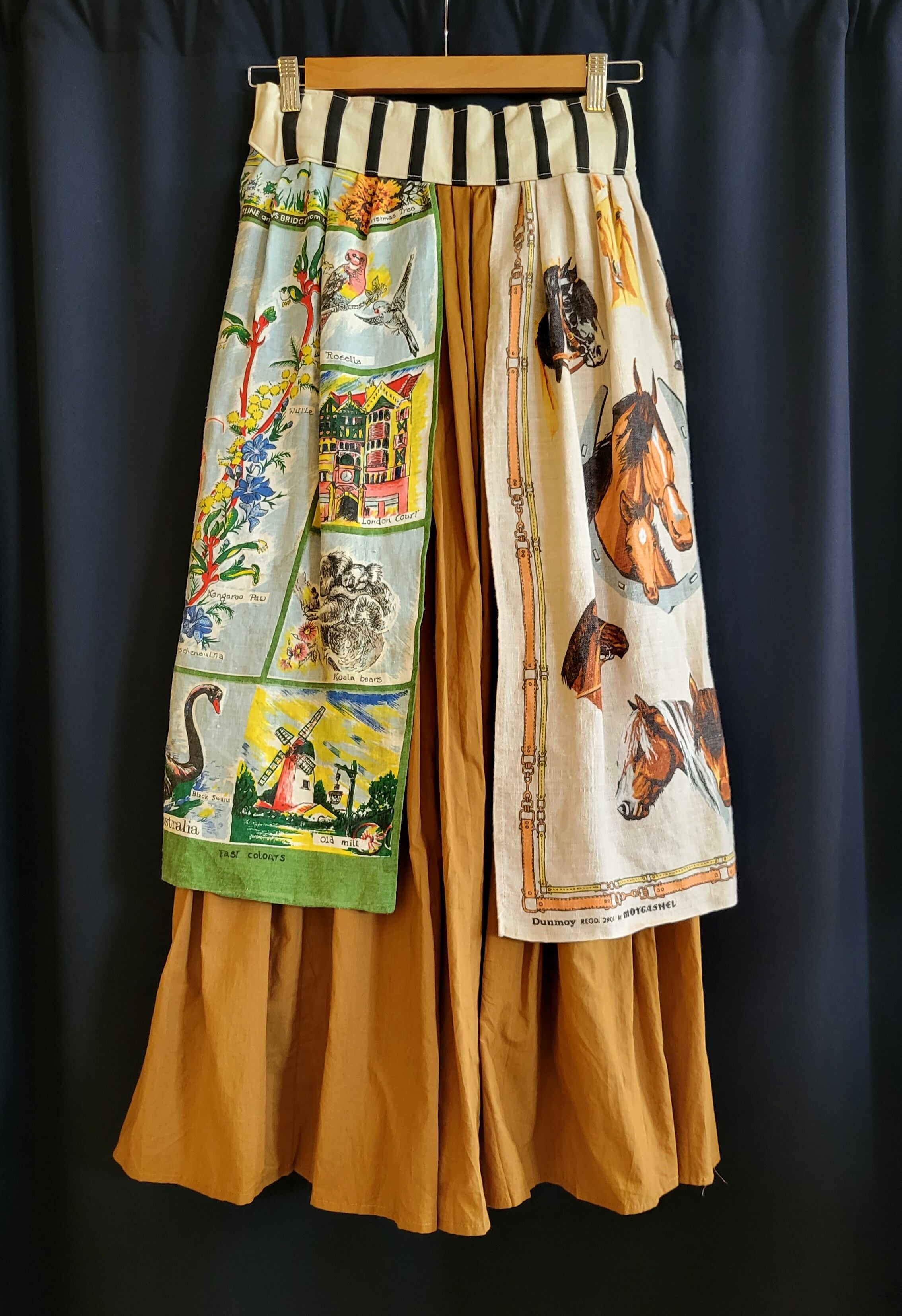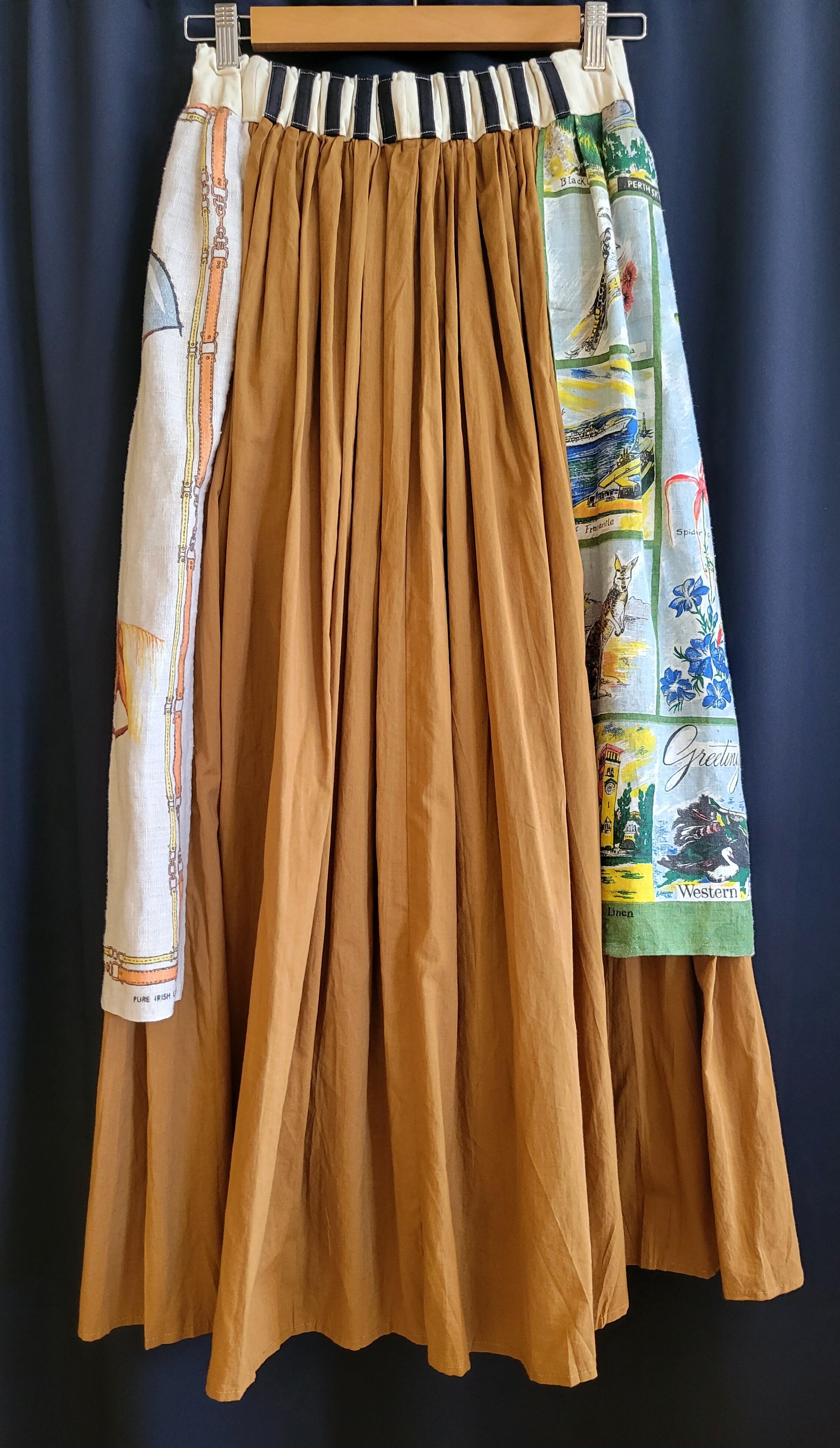 ヴィンテージのティータオルをエプロン風にあしらったアロカシアオリジナルのリメイクスカート。素材はスカートがコットン、ティータオルは素材表記はありませんがコットンリネンのようです。ウエストはバックがゴム仕様。ウエストヨークのストライプ柄がアクセントになり全体のバランスを引き締めています。