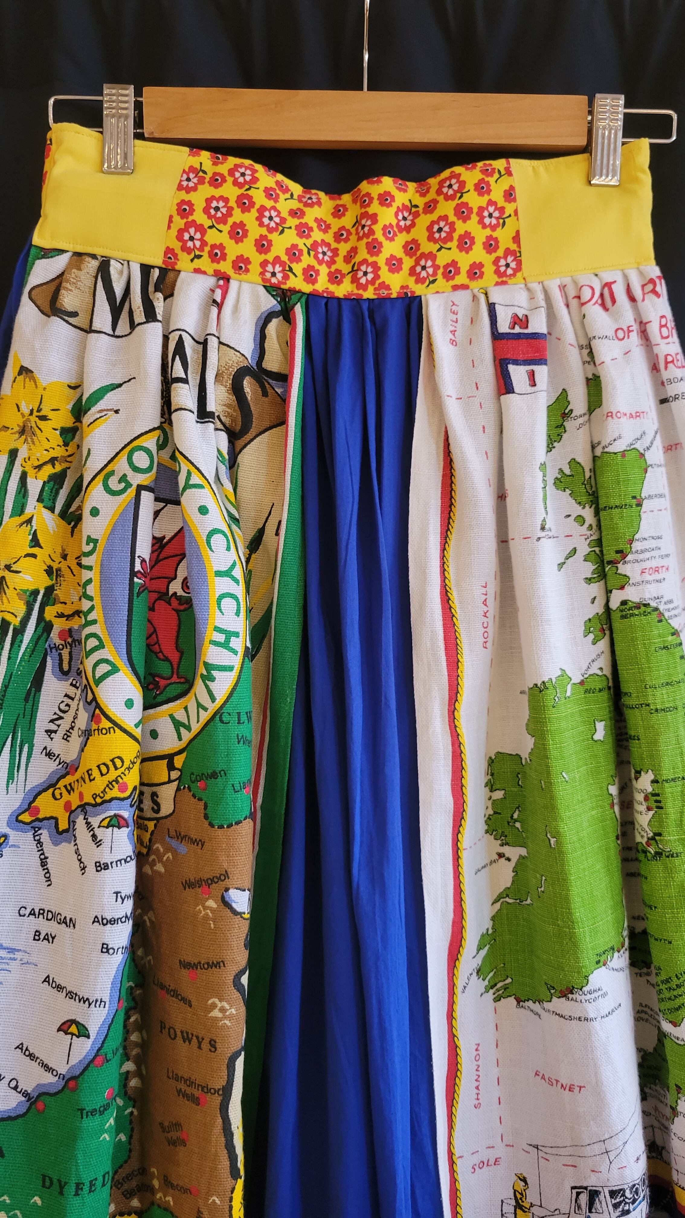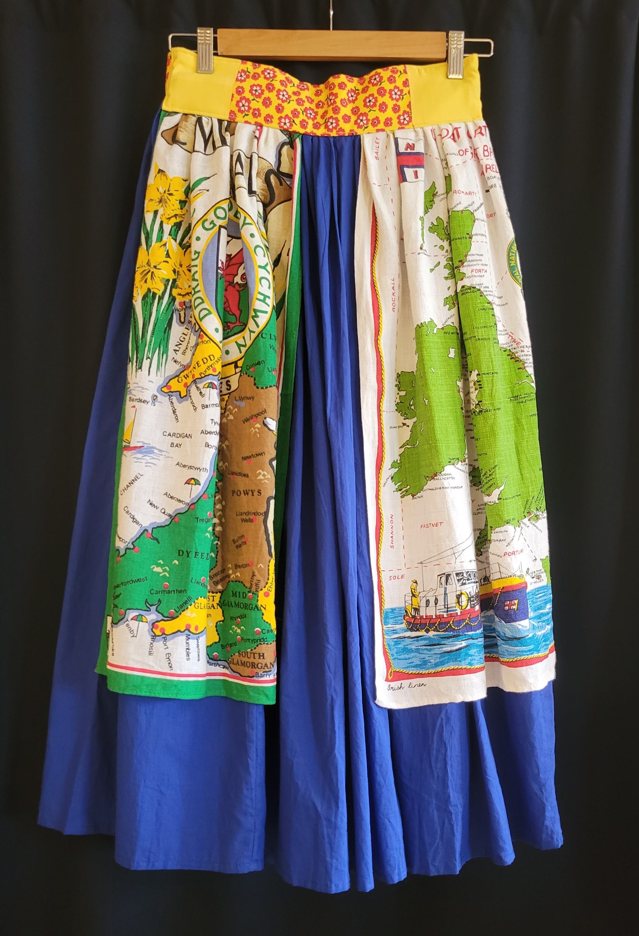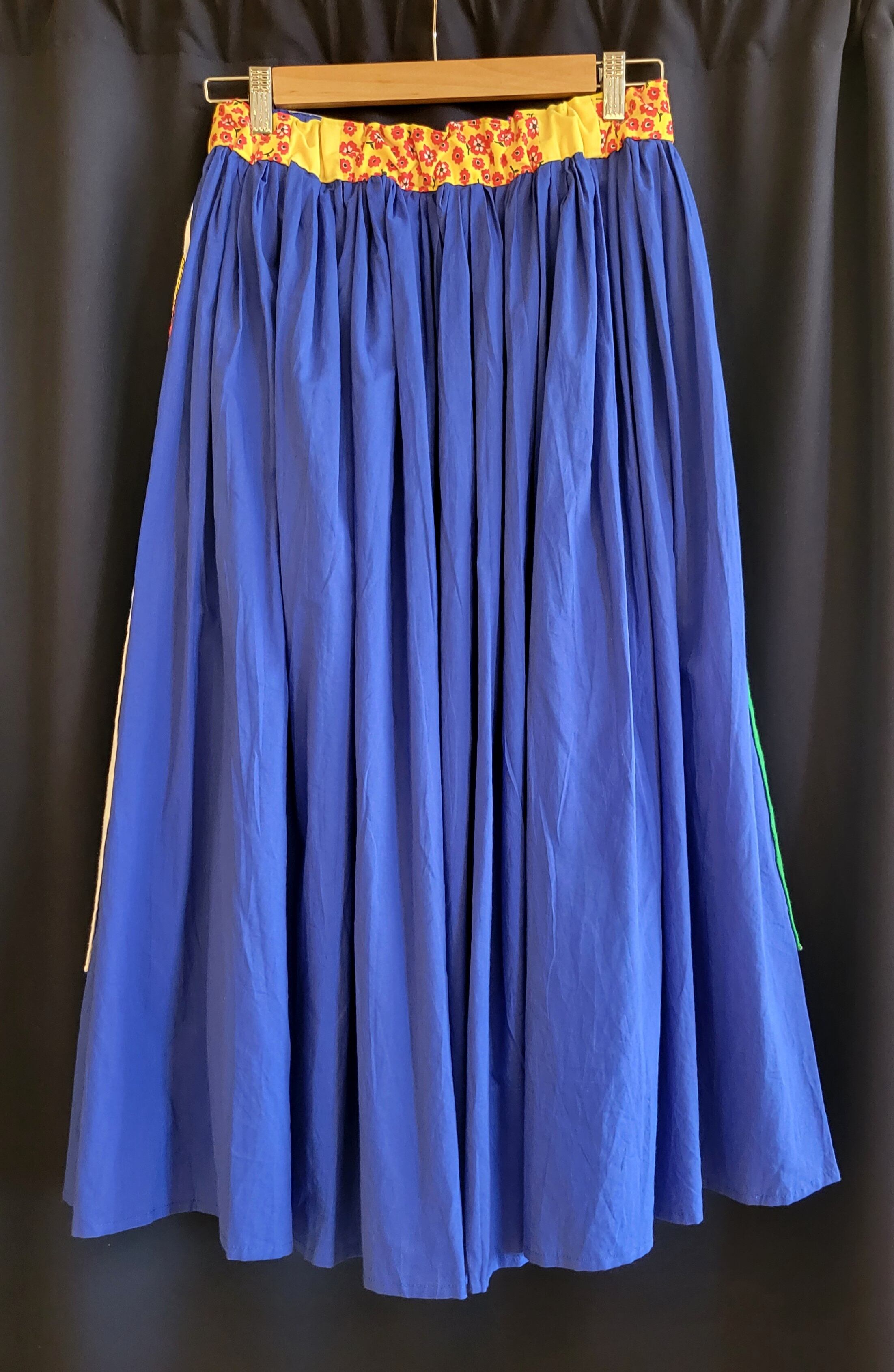 ヴィンテージのティータオルをエプロン風にあしらったアロカシアオリジナルのリメイクスカート。素材はスカートがコットン、ティータオルは素材表記はありませんがコットンリネンのようです。ウエストはバックがゴム仕様。ウエストヨークの花柄が良いアクセントになっています。