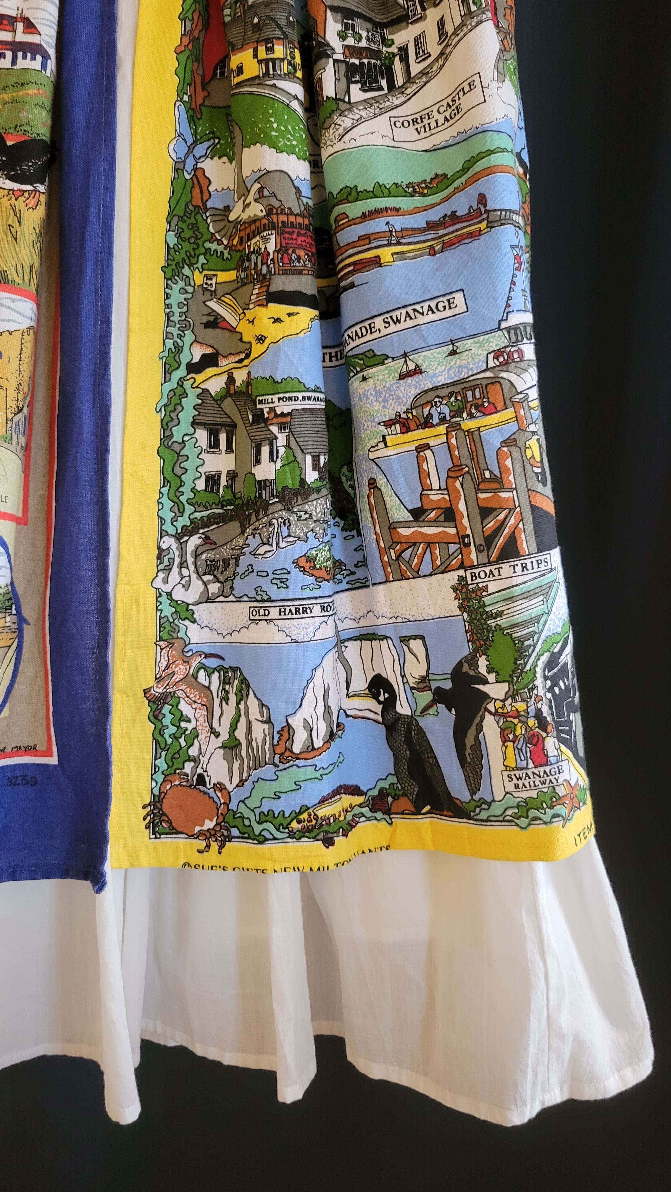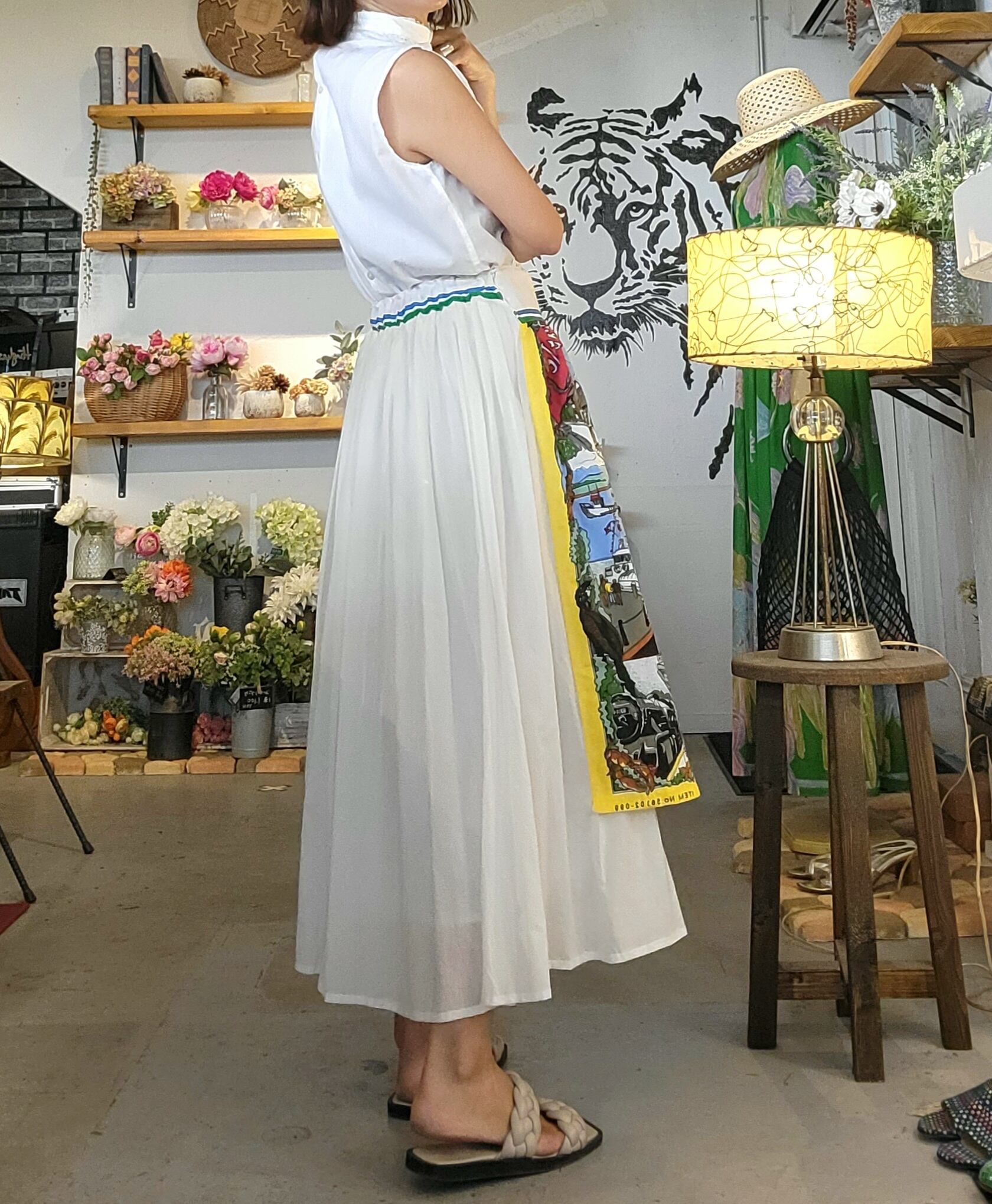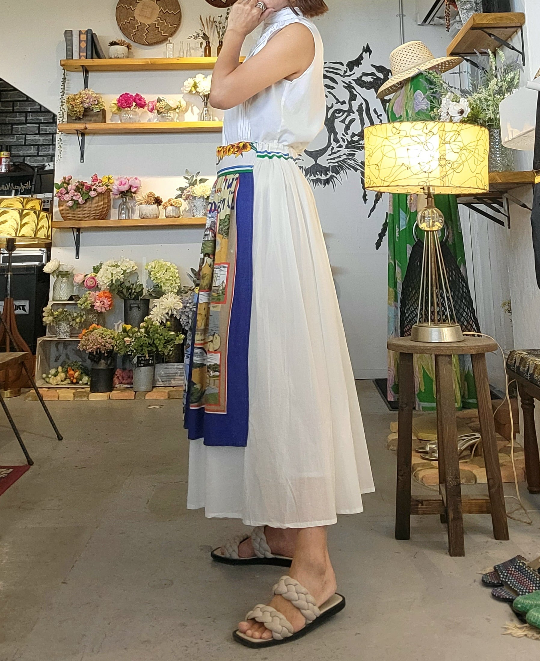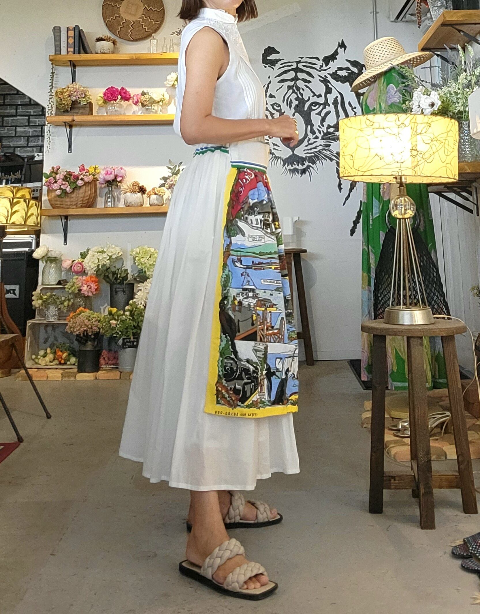 ヴィンテージのティータオルをエプロン風にあしらったアロカシアオリジナルのリメイクスカート。素材はスカートがコットン、ティータオルは素材表記はありませんがコットンリネンのようです。ウエストはバックがゴム仕様。ティータオルの鮮やかなカラーが目を引きます。