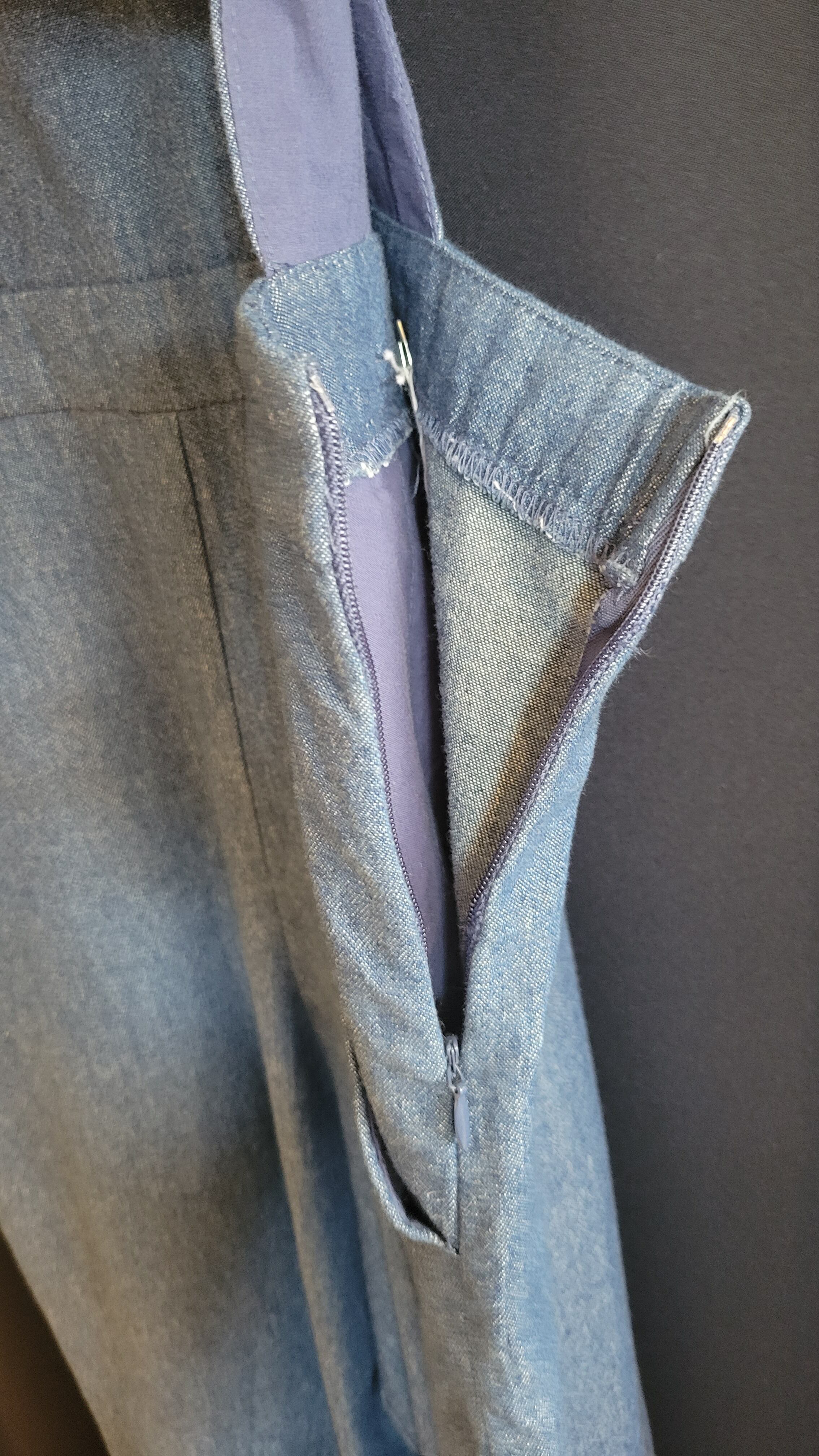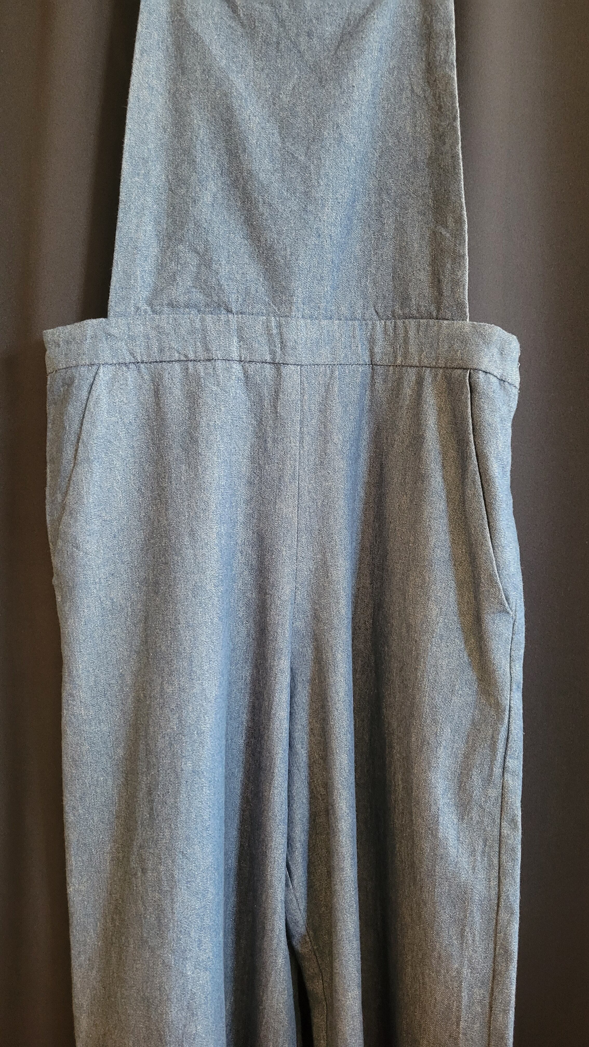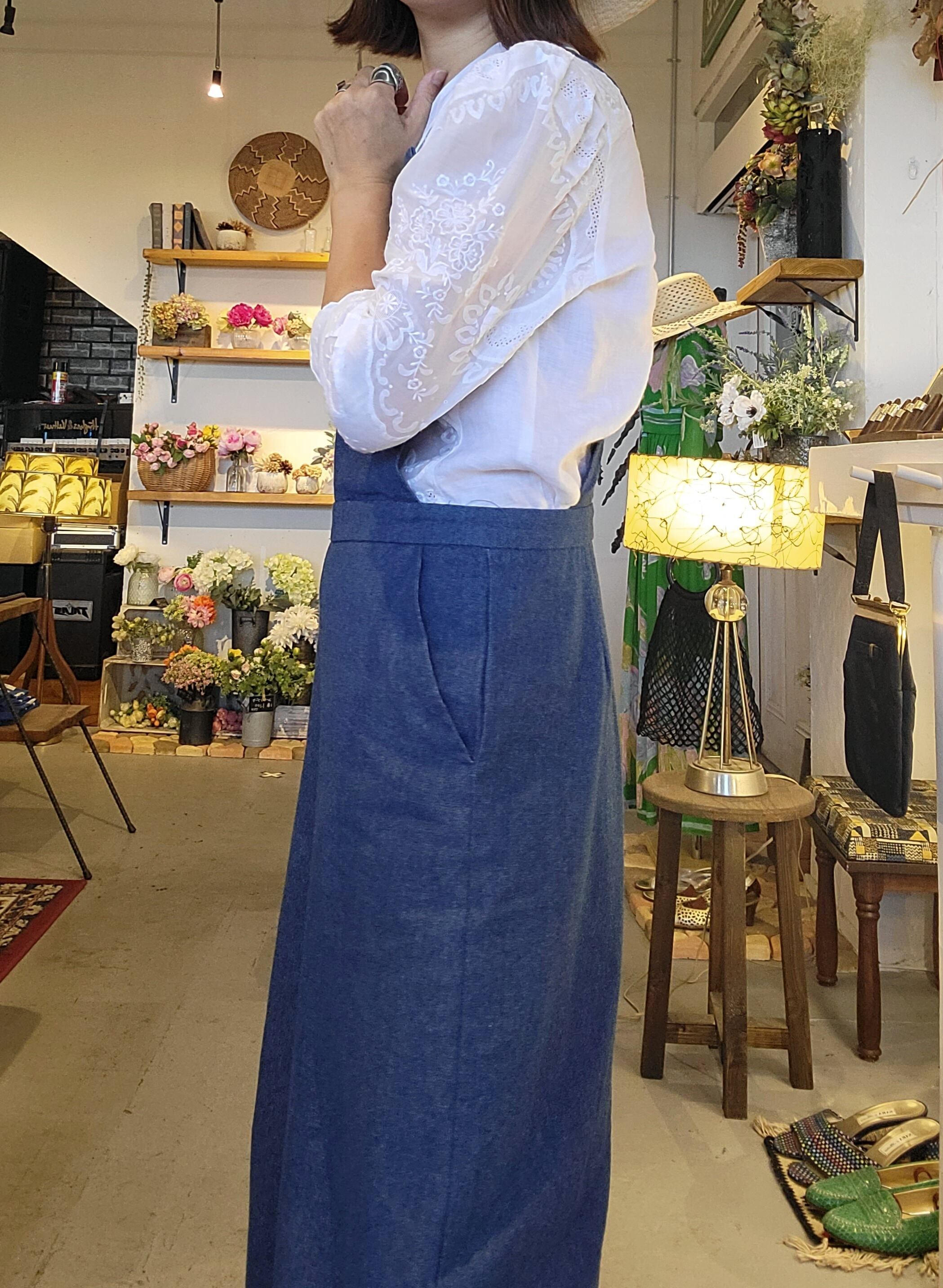 ヴィンテージのデニムサロペット。素材は薄手の軽いデニムです。ショルダーストラップにボタンホールが2つ付いており長さの調整が可能です。左サイドにファスナー付き。すっきりシンプルな大人のサロペットです。