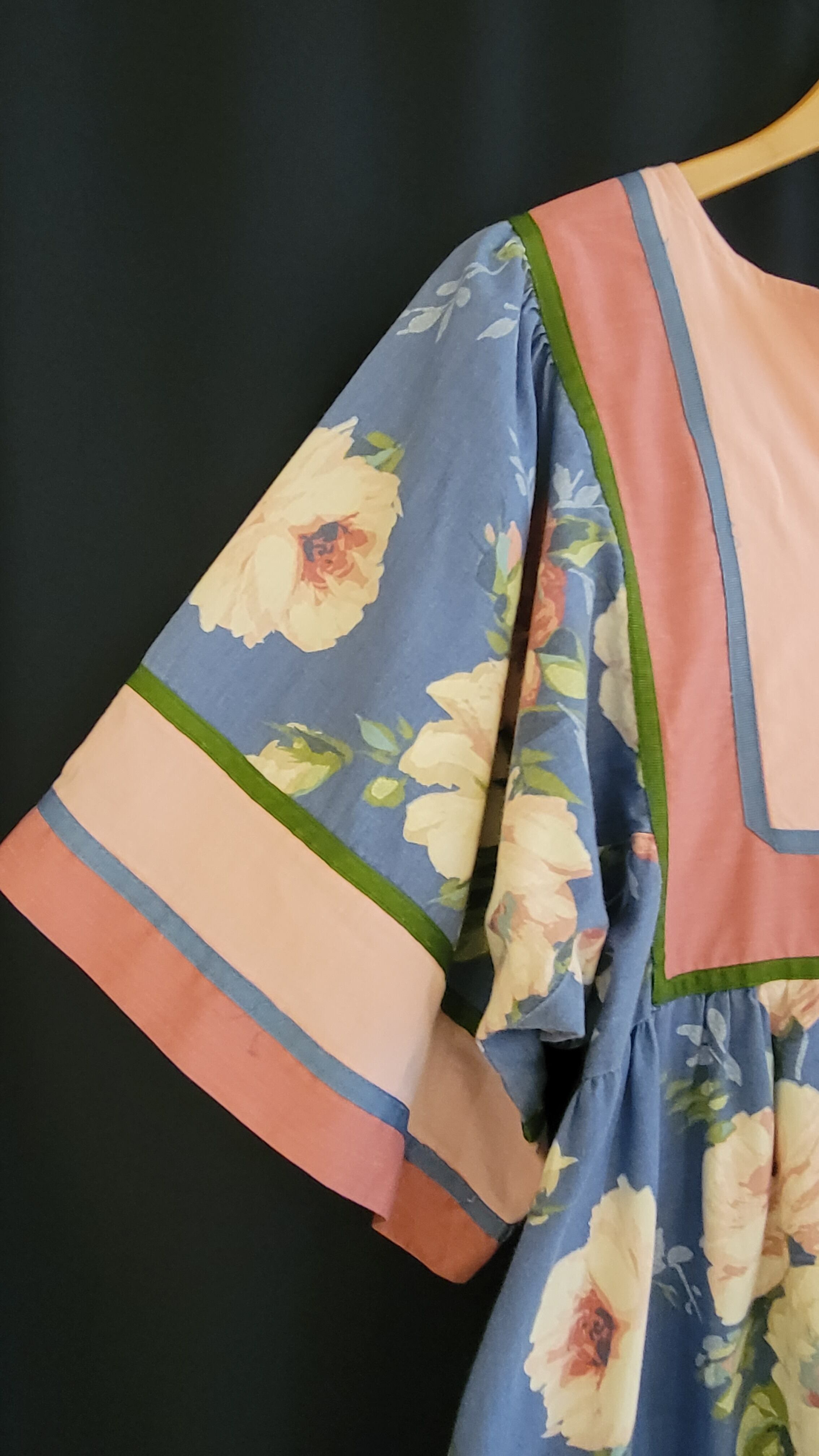 ヴィンテージのコットンマキシワンピース。バックファスナーは付いていません。後ろ身ごろ両サイドに紐が付いています。全体的にふんわり通気の良いシルエットで涼しく着られます。柔らかなピンクとブルーに大柄のお花が優しい印象です。