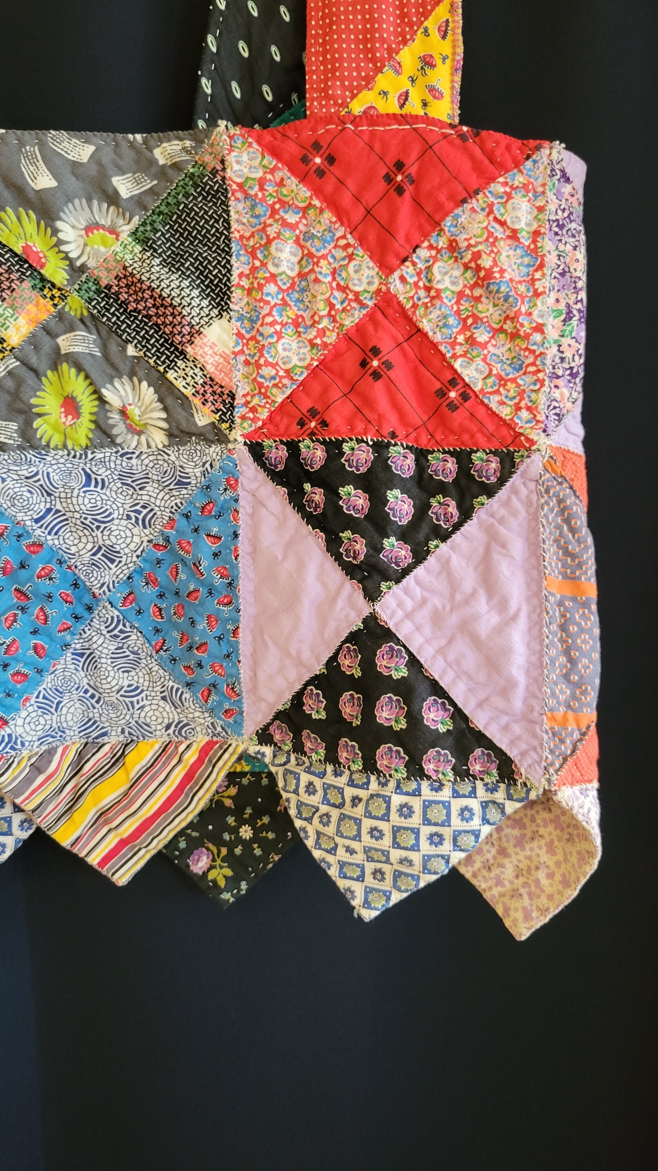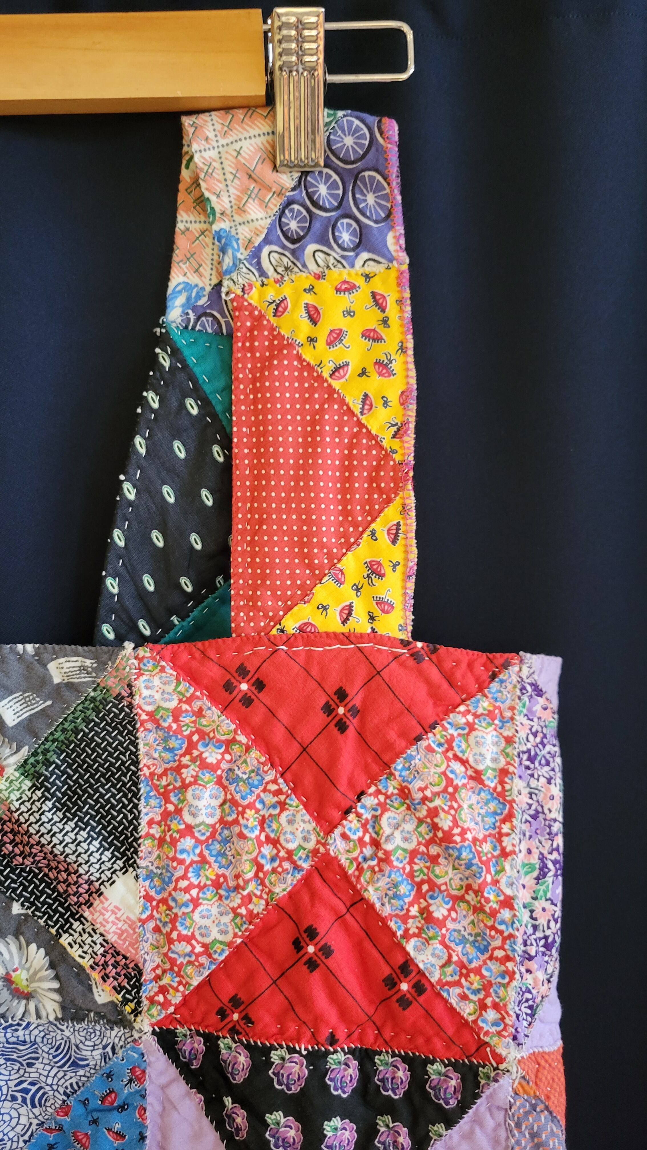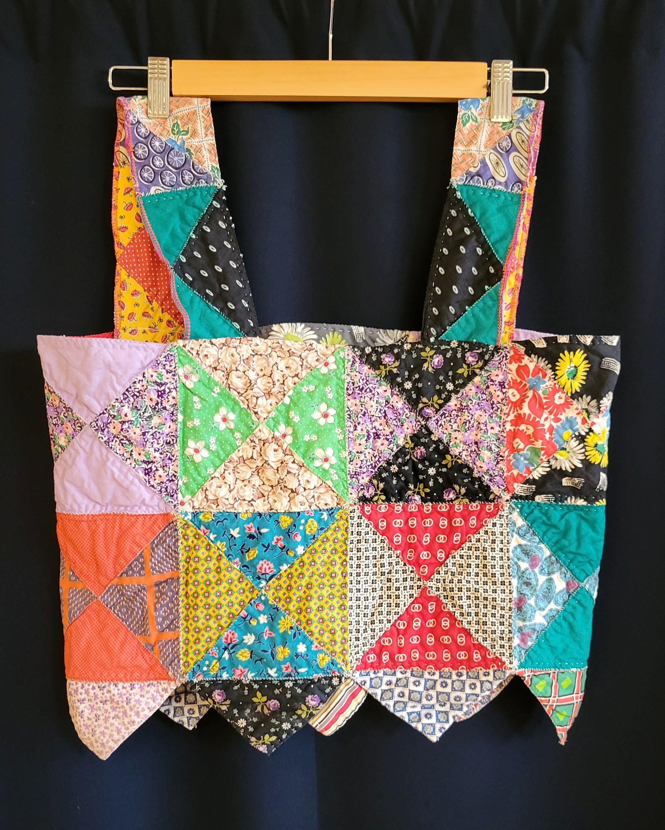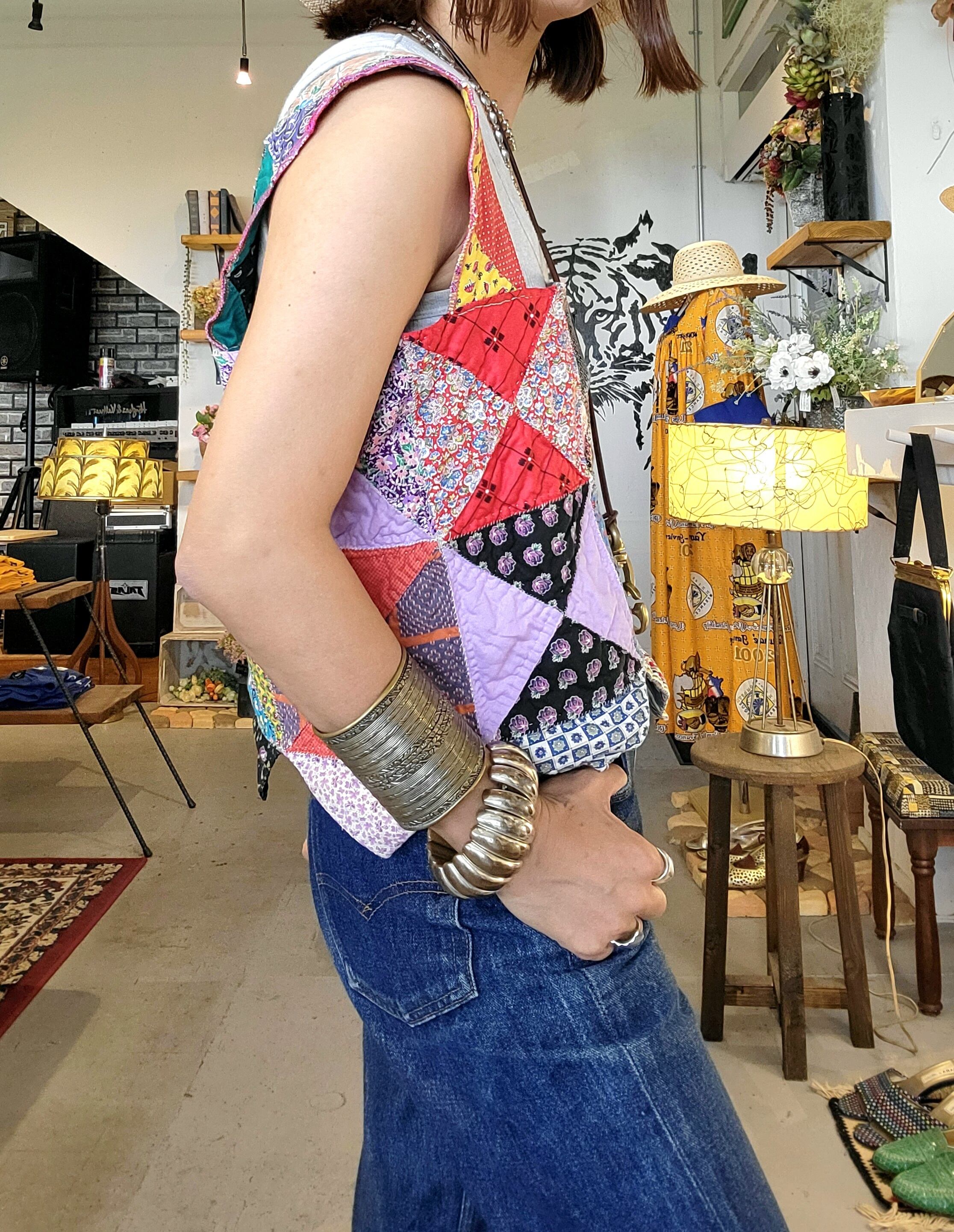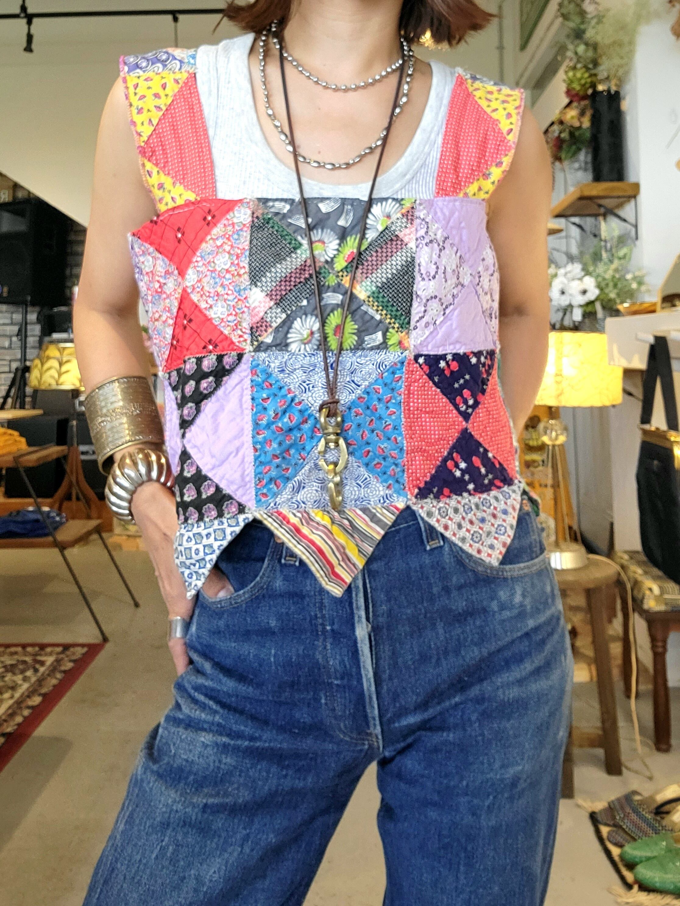 ヴィンテージのパッチワークキルト生地を使用したリメイクトップス。素材はコットンです。前後どちらでも着ていただけます。秋冬は薄手のタートルニットに重ねて、通年でお楽しみいただけます。