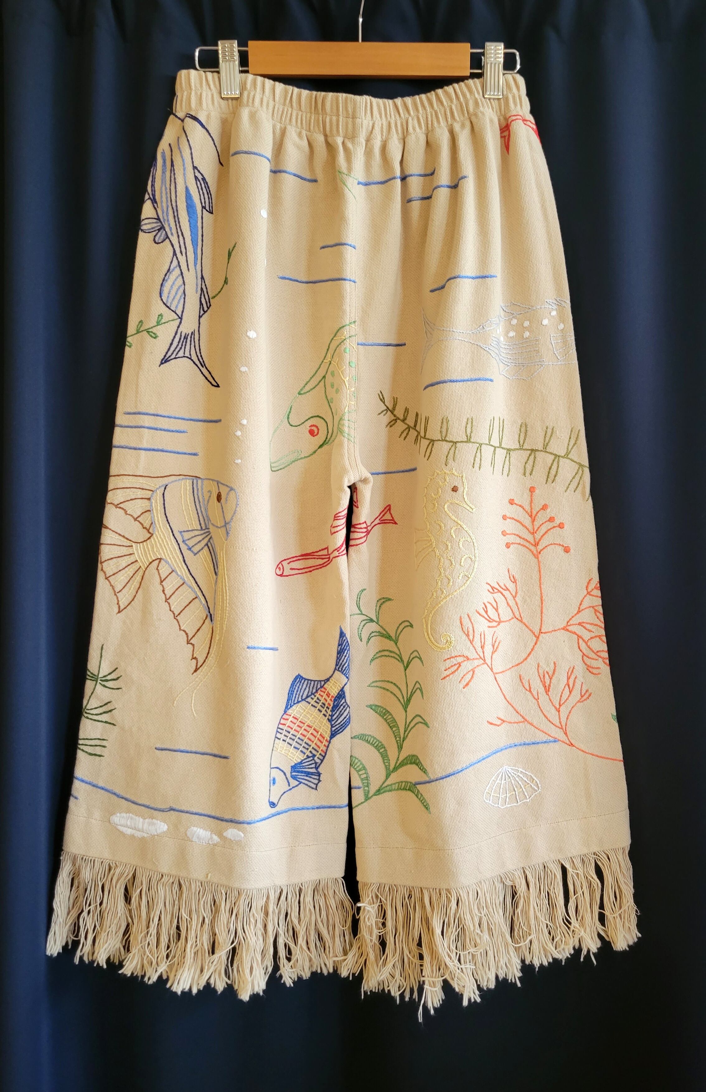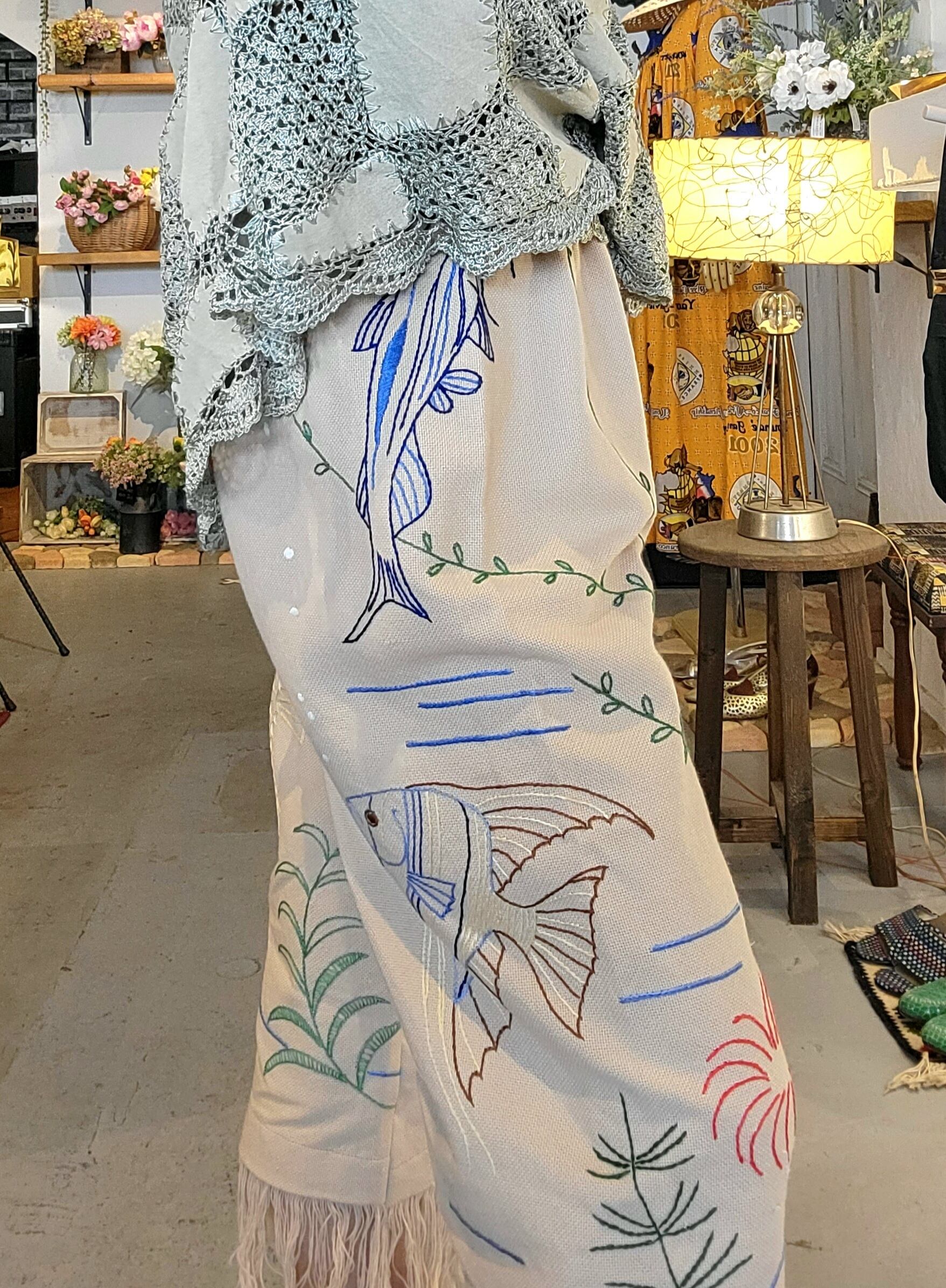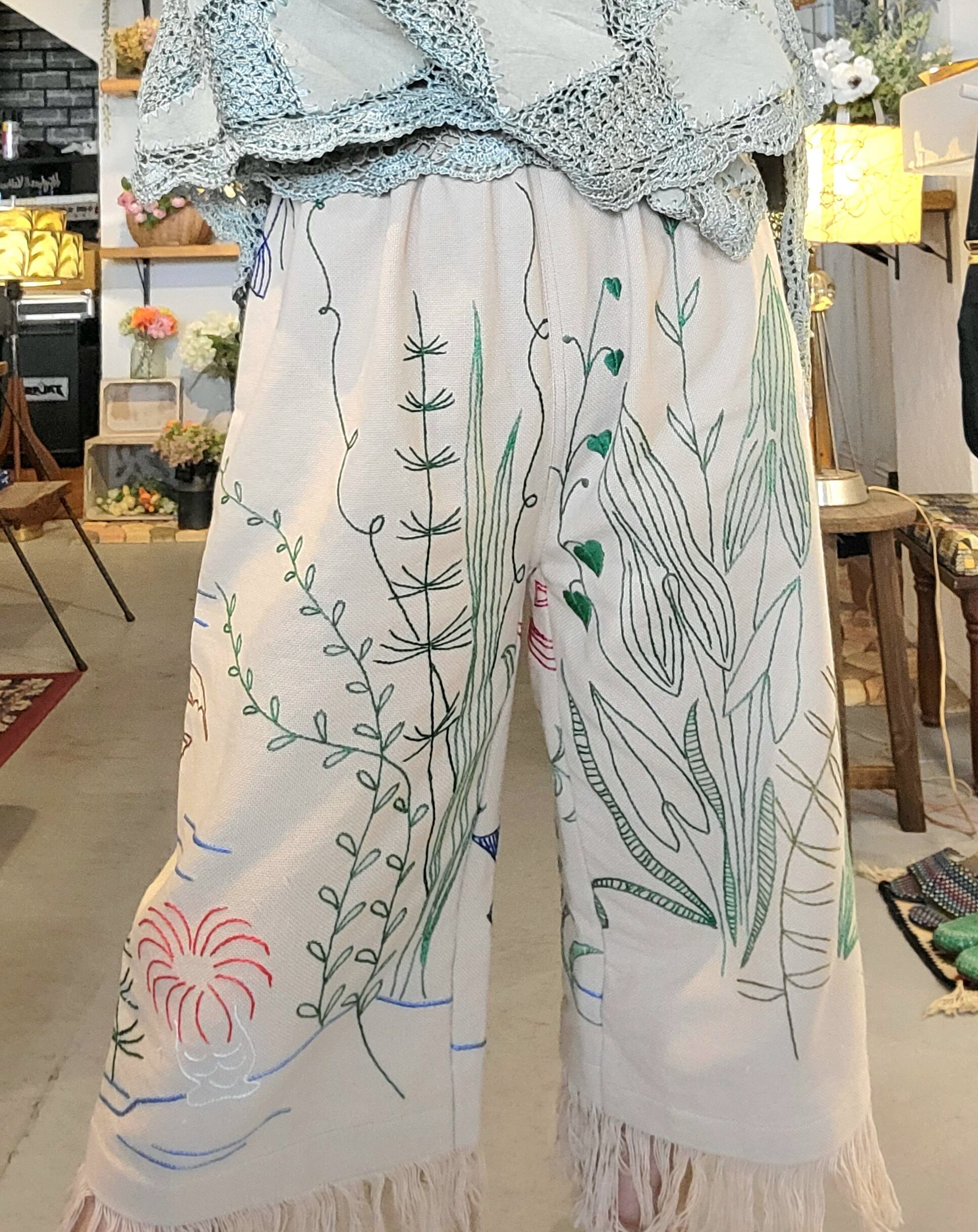 ヴィンテージのリネンクロスを使用したリメイクイージーパンツ。ウエストはゴム仕様です。短めのクロップト丈に裾フリンジ。海の生き物の刺繍が全体に施されています。希少なヴィンテージテキスタイルの魅力が詰まった1本です。