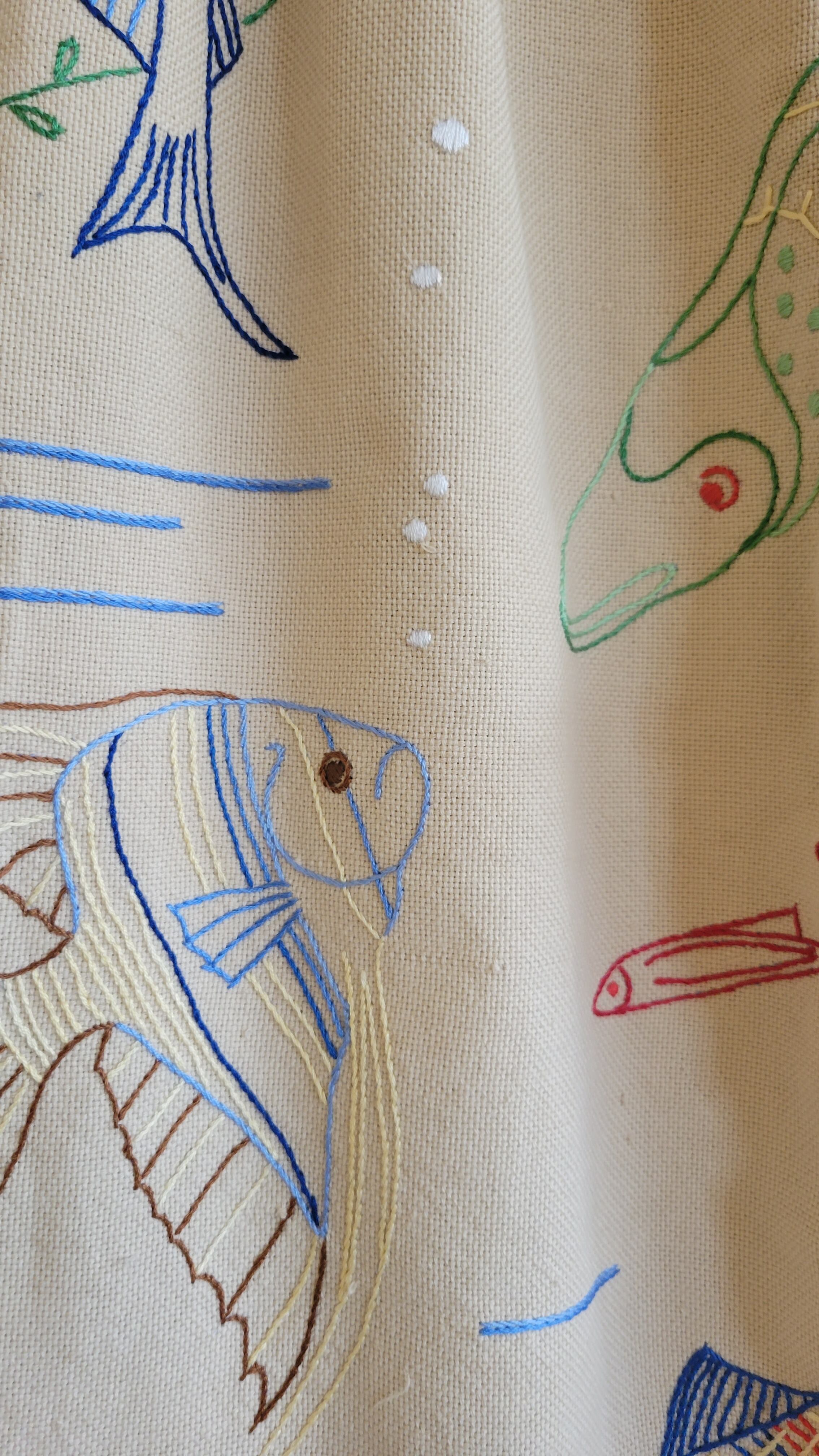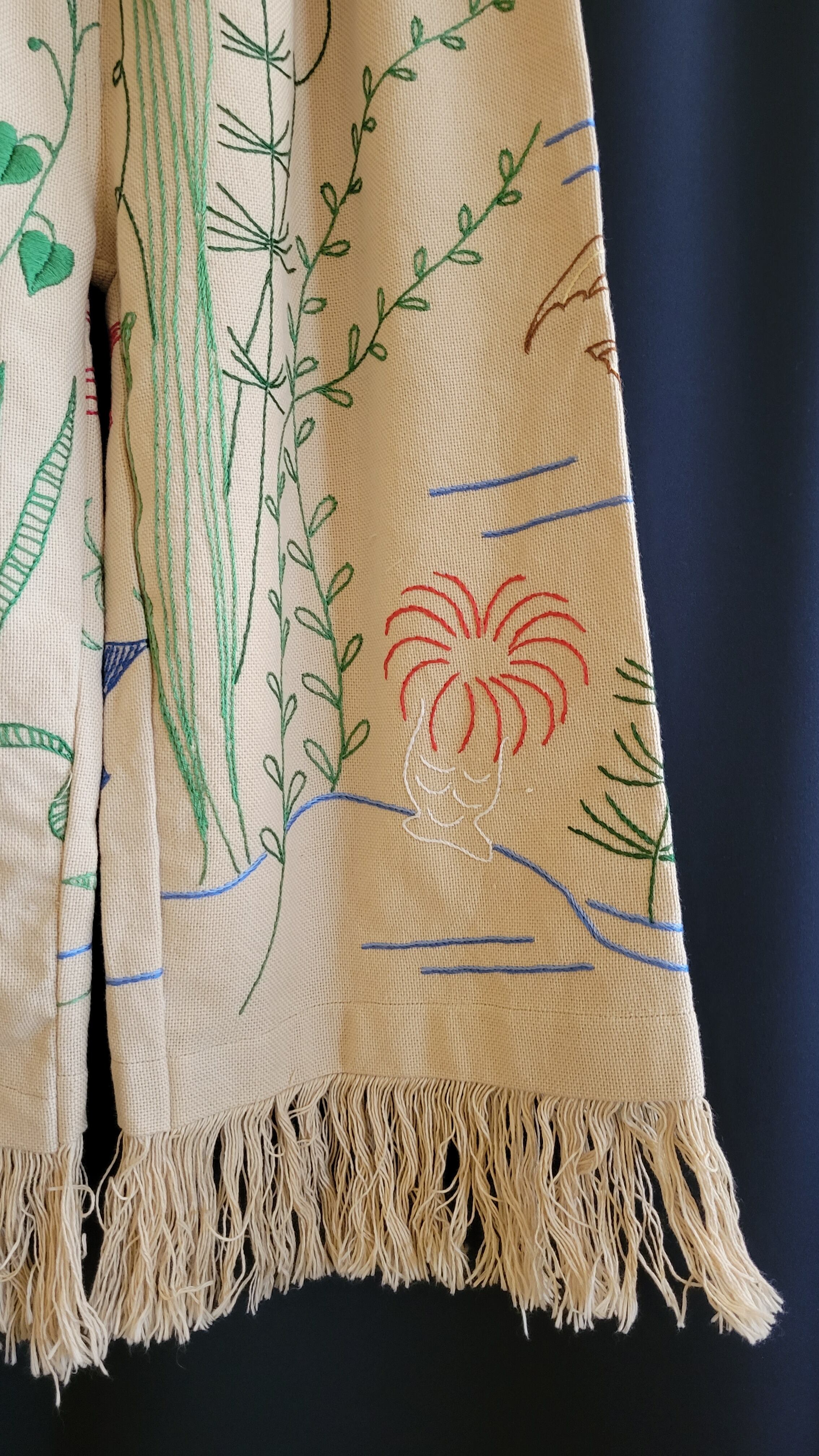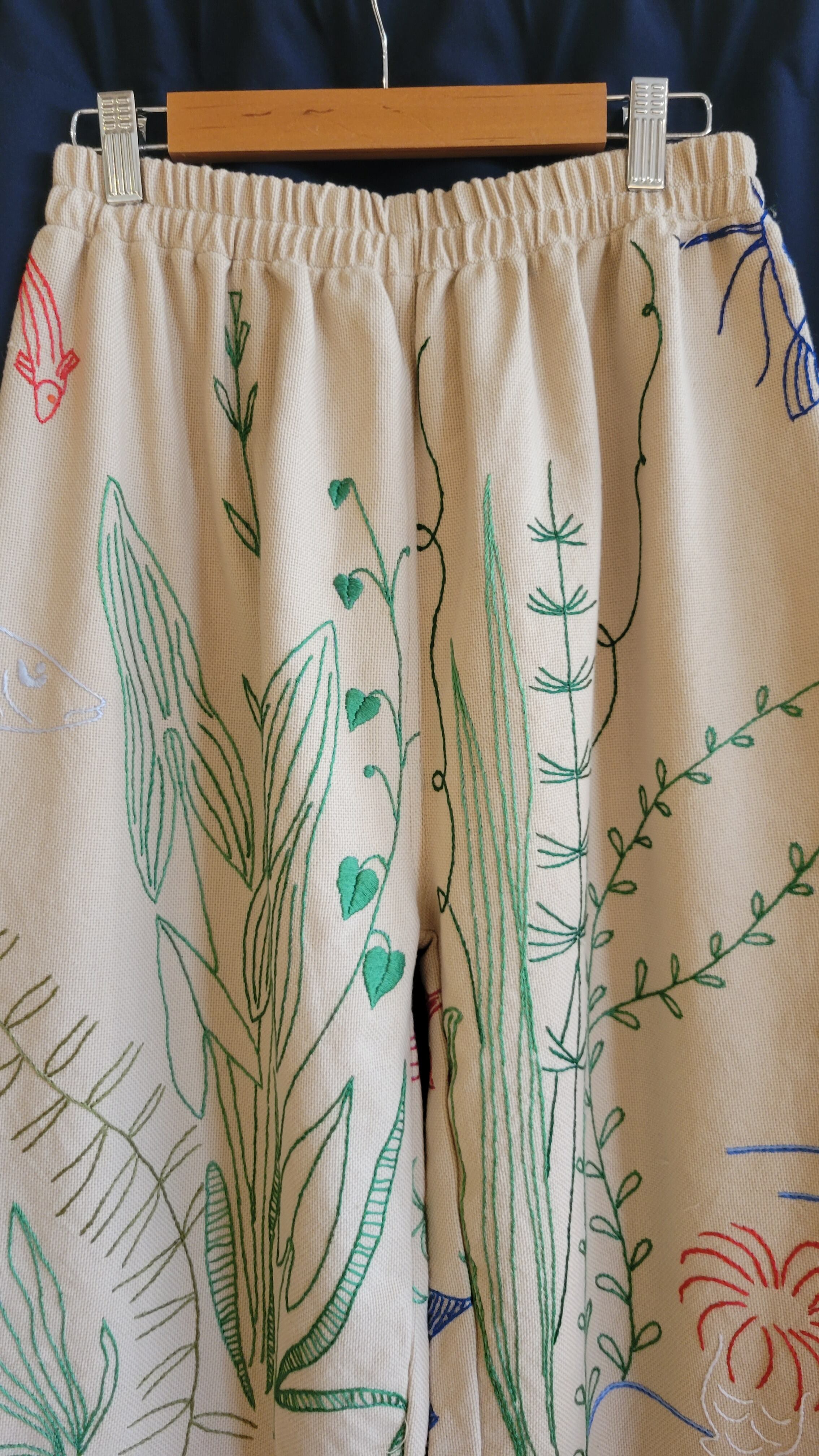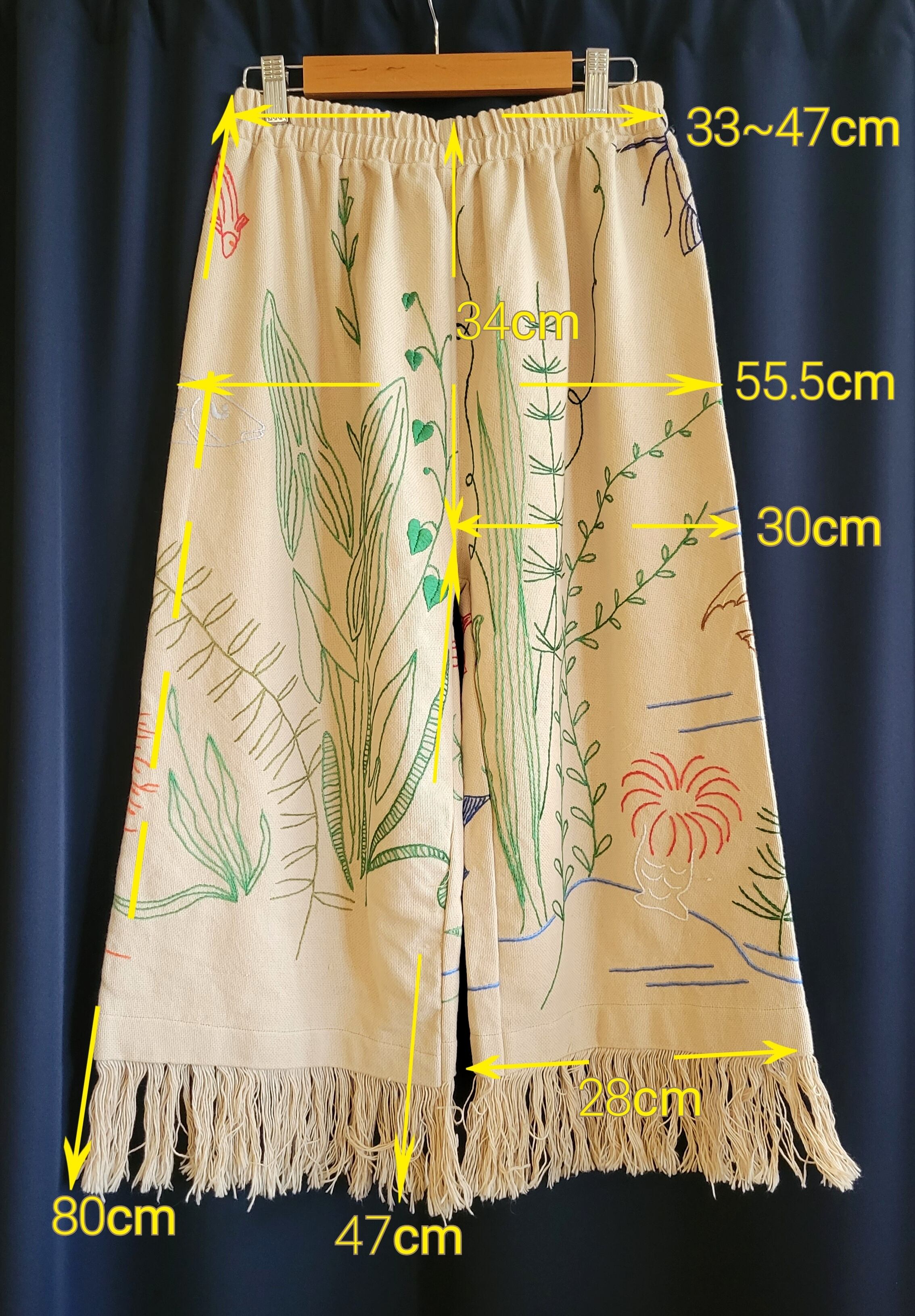 ヴィンテージのリネンクロスを使用したリメイクイージーパンツ。ウエストはゴム仕様です。短めのクロップト丈に裾フリンジ。海の生き物の刺繍が全体に施されています。希少なヴィンテージテキスタイルの魅力が詰まった1本です。