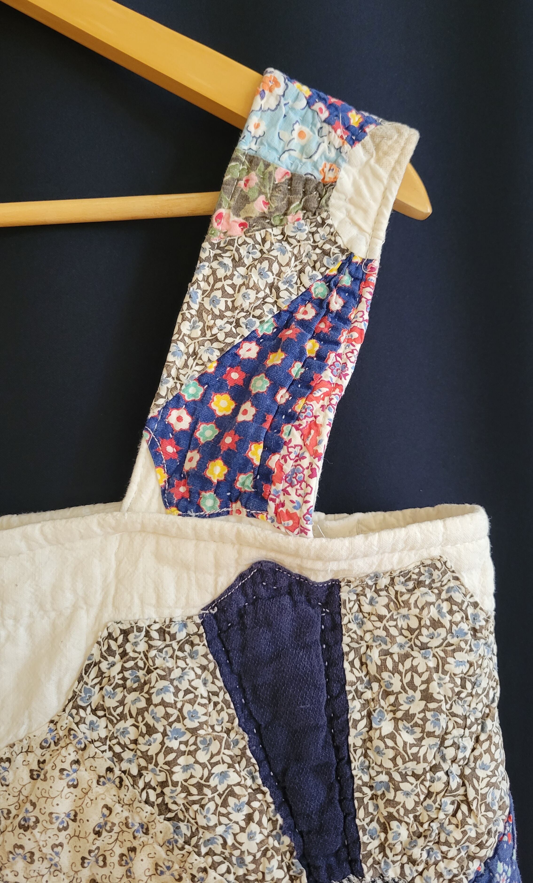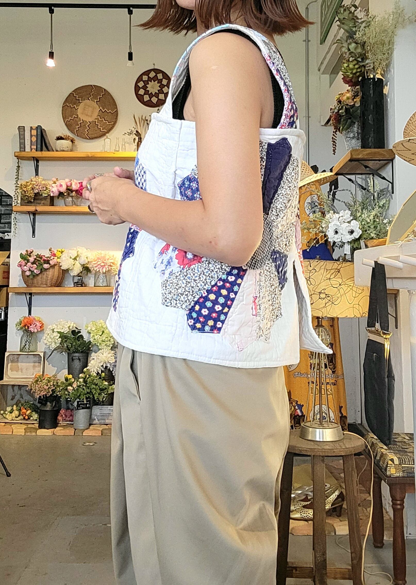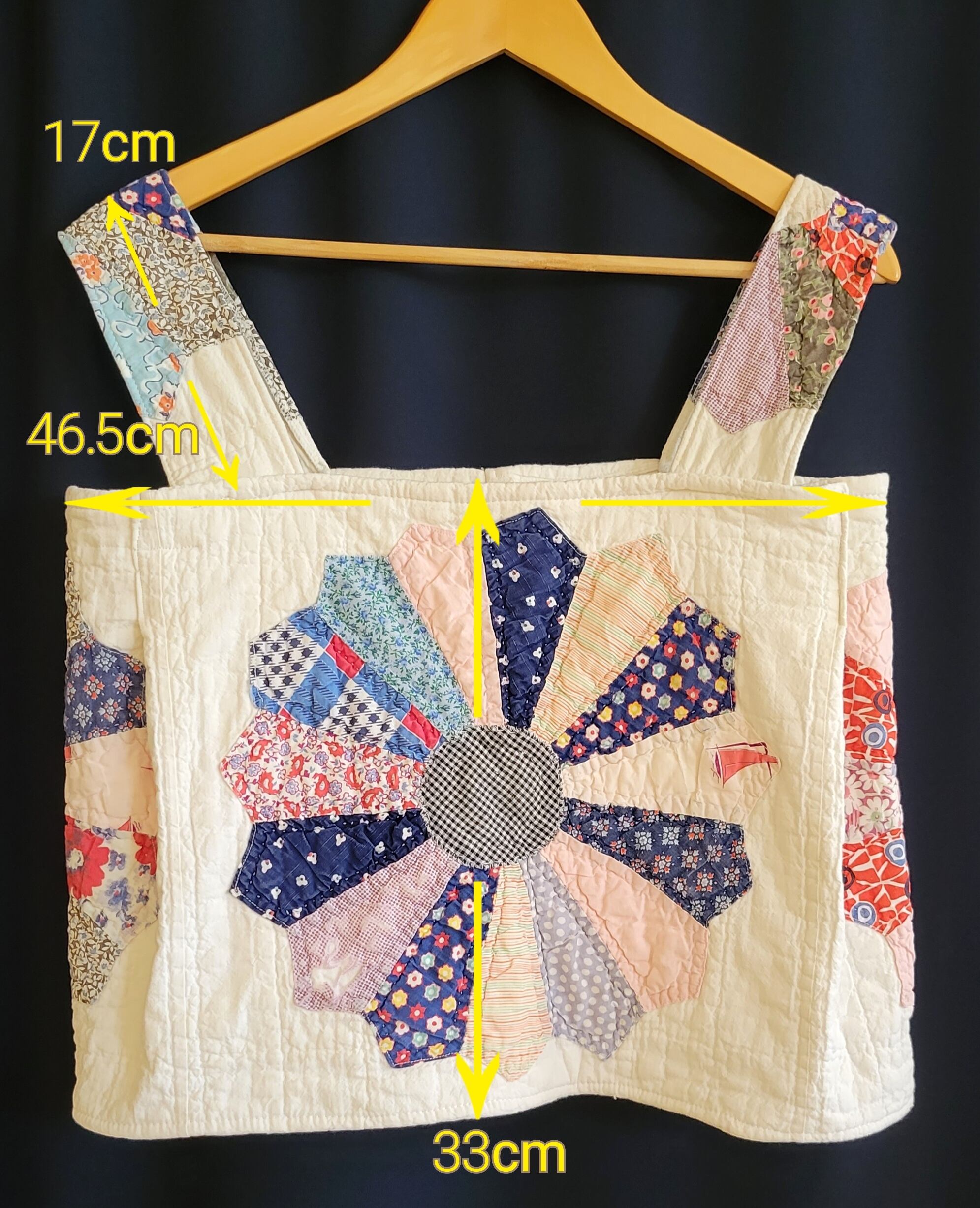 ヴィンテージのパッチワークキルトを使用したリメイクトップス。素材はコットンです。大輪の花のようなドレスデンプレートのモチーフを中央に配置したインパクトのあるトップスです。バックスリットがアクセントに。秋冬はタートルニットに合わせてシーズンレスに着ていただけます。*フロント左下あたりに生地の破れが1ヶ所あります。画像でご確認ください。