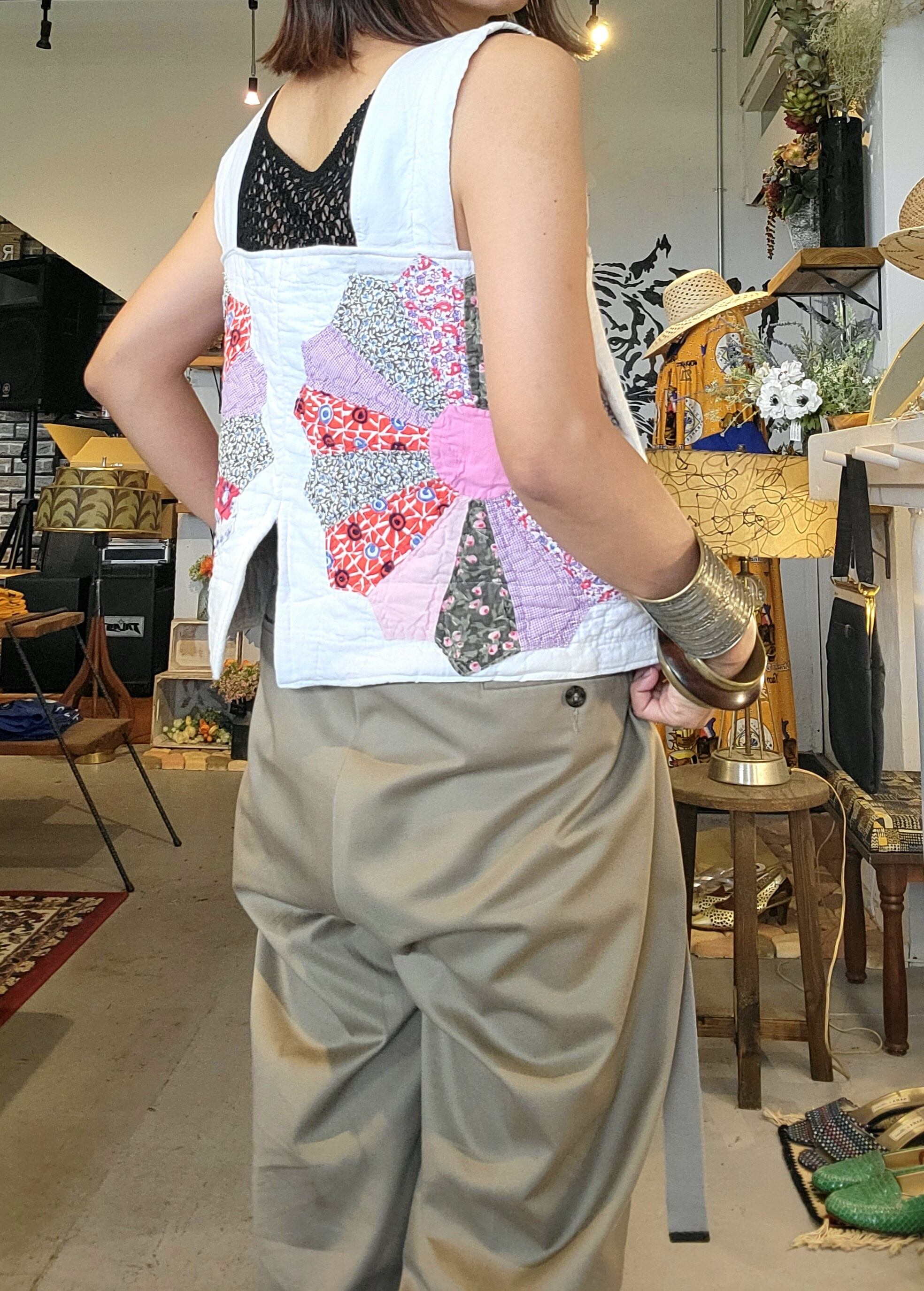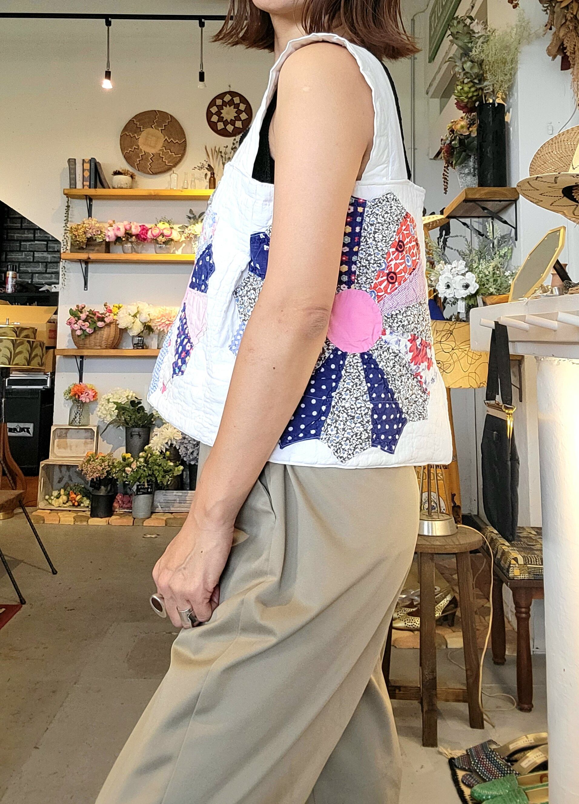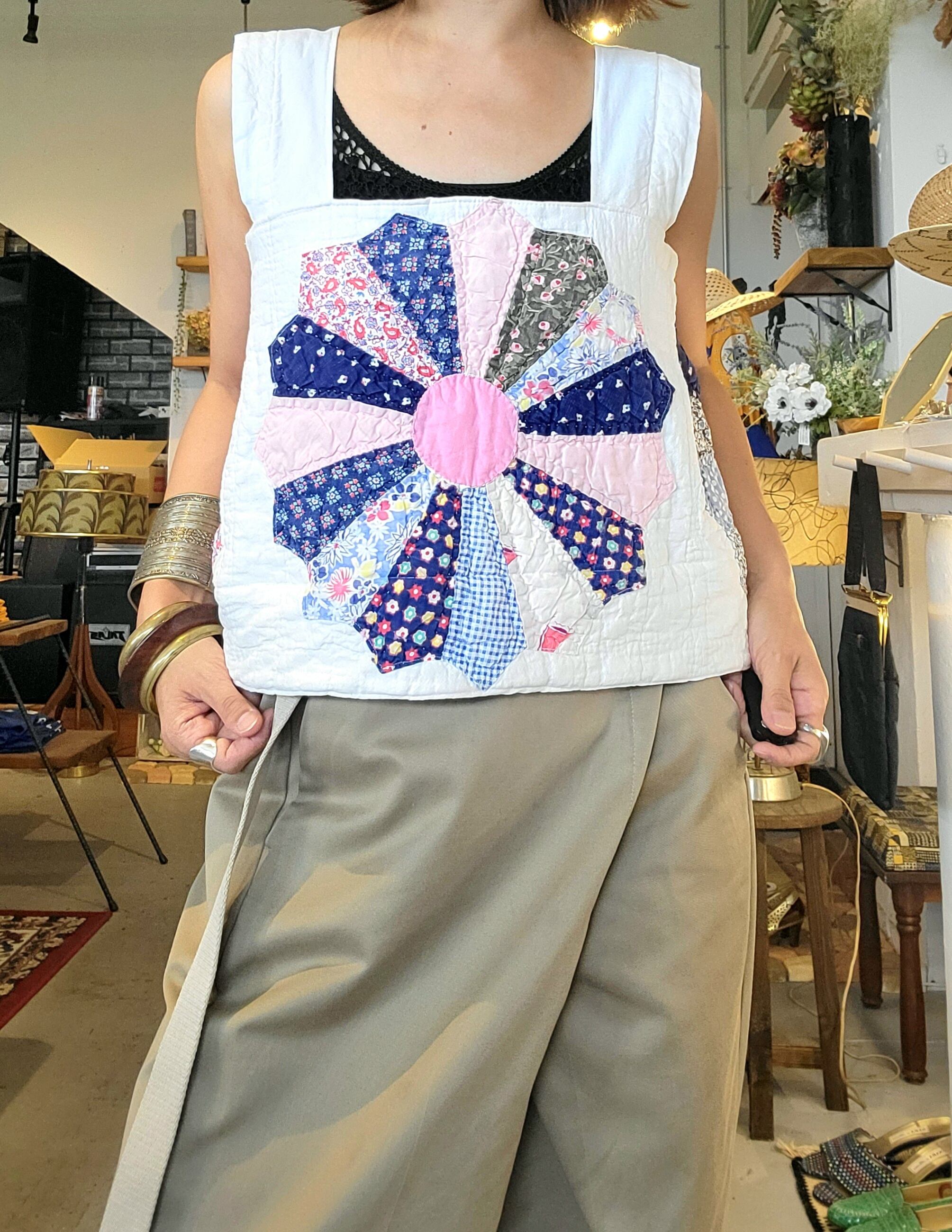 ヴィンテージのパッチワークキルトを使用したリメイクトップス。素材はコットンです。大輪の花のようなドレスデンプレートのモチーフを中央に配置したインパクトのあるトップスです。バックスリットがアクセントに。秋冬はタートルニットに合わせてシーズンレスに着ていただけます。