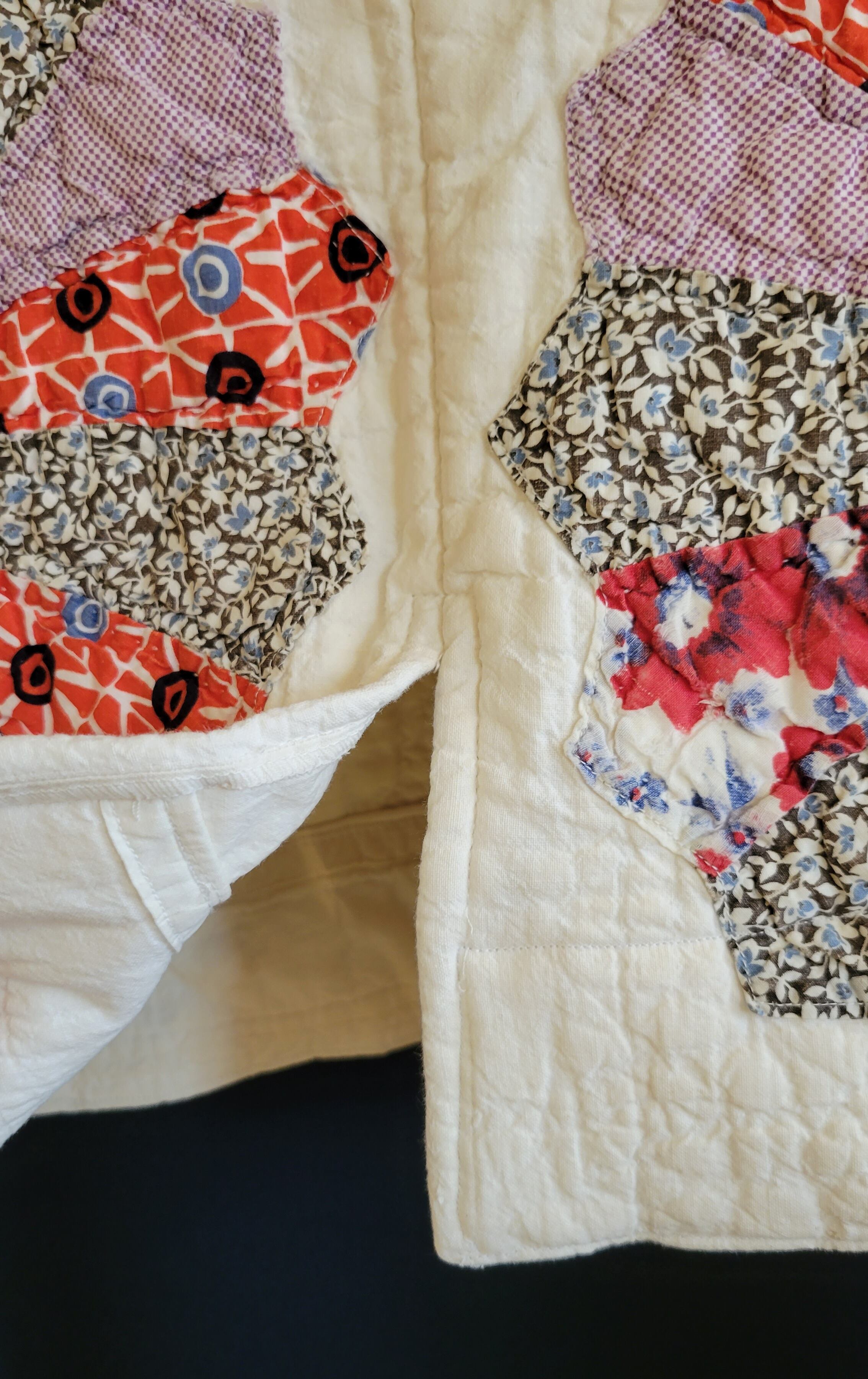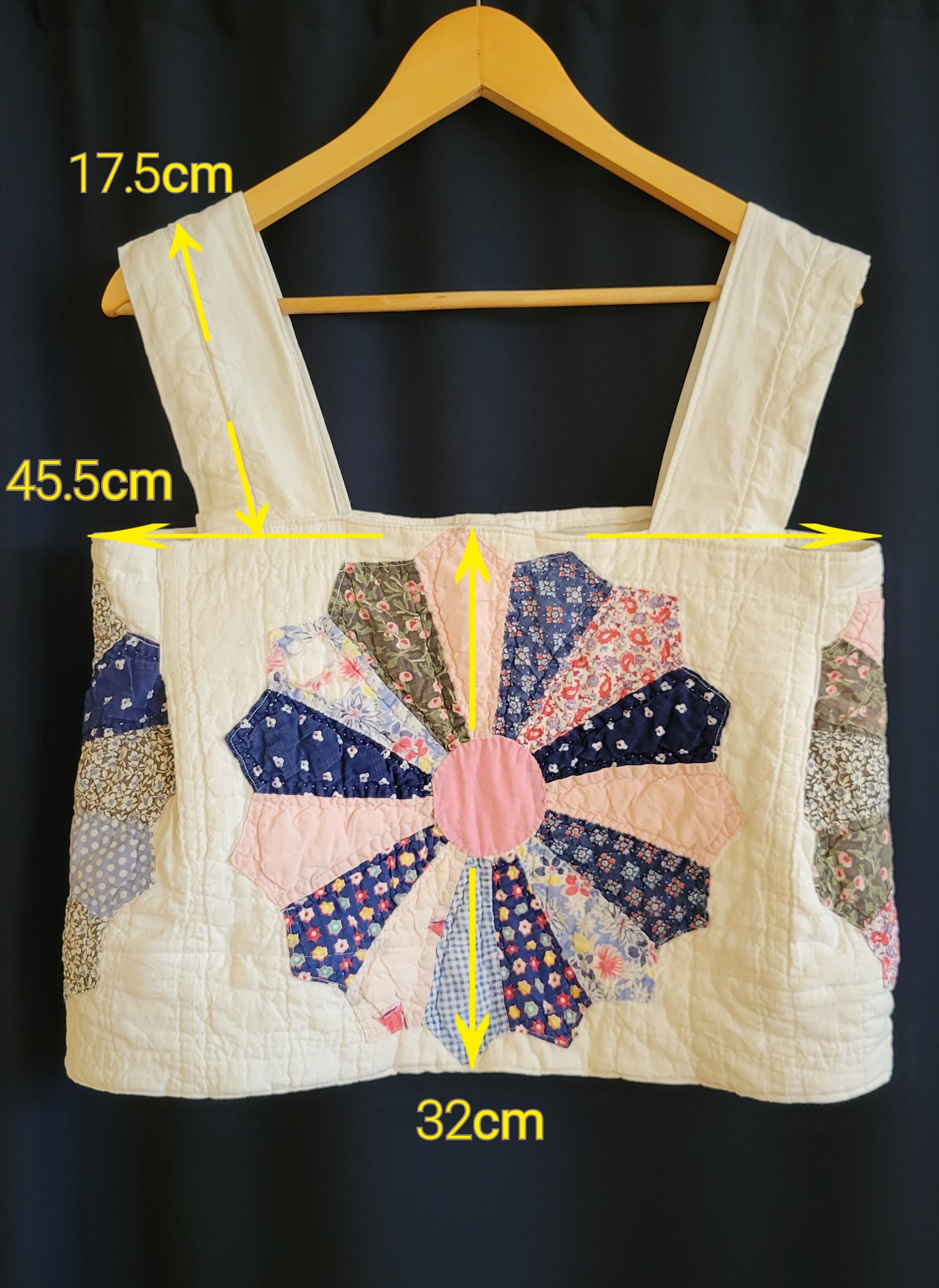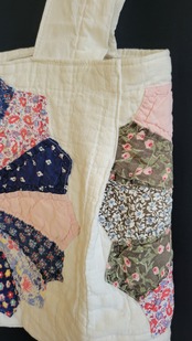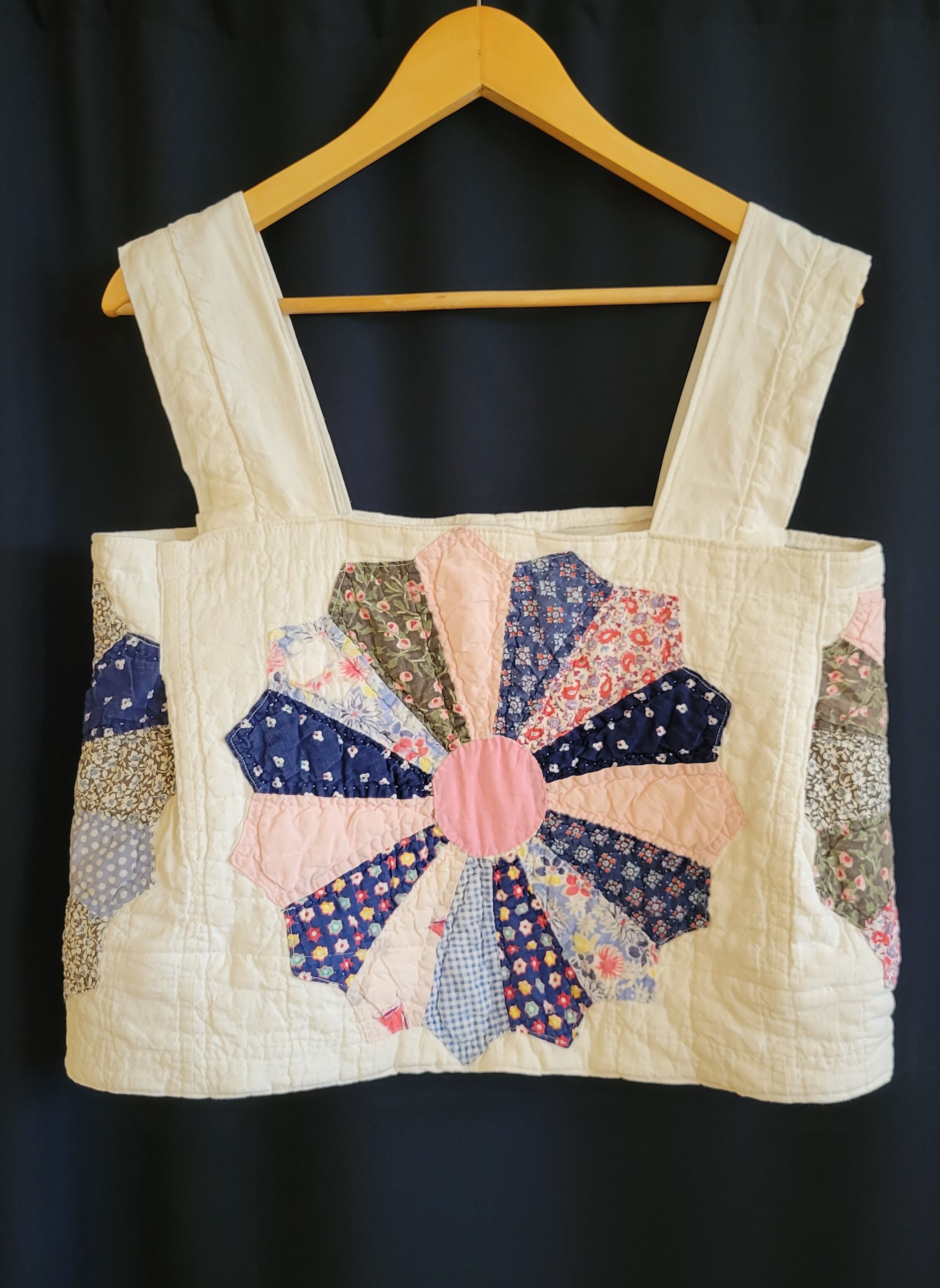 ヴィンテージのパッチワークキルトを使用したリメイクトップス。素材はコットンです。大輪の花のようなドレスデンプレートのモチーフを中央に配置したインパクトのあるトップスです。バックスリットがアクセントに。秋冬はタートルニットに合わせてシーズンレスに着ていただけます。