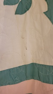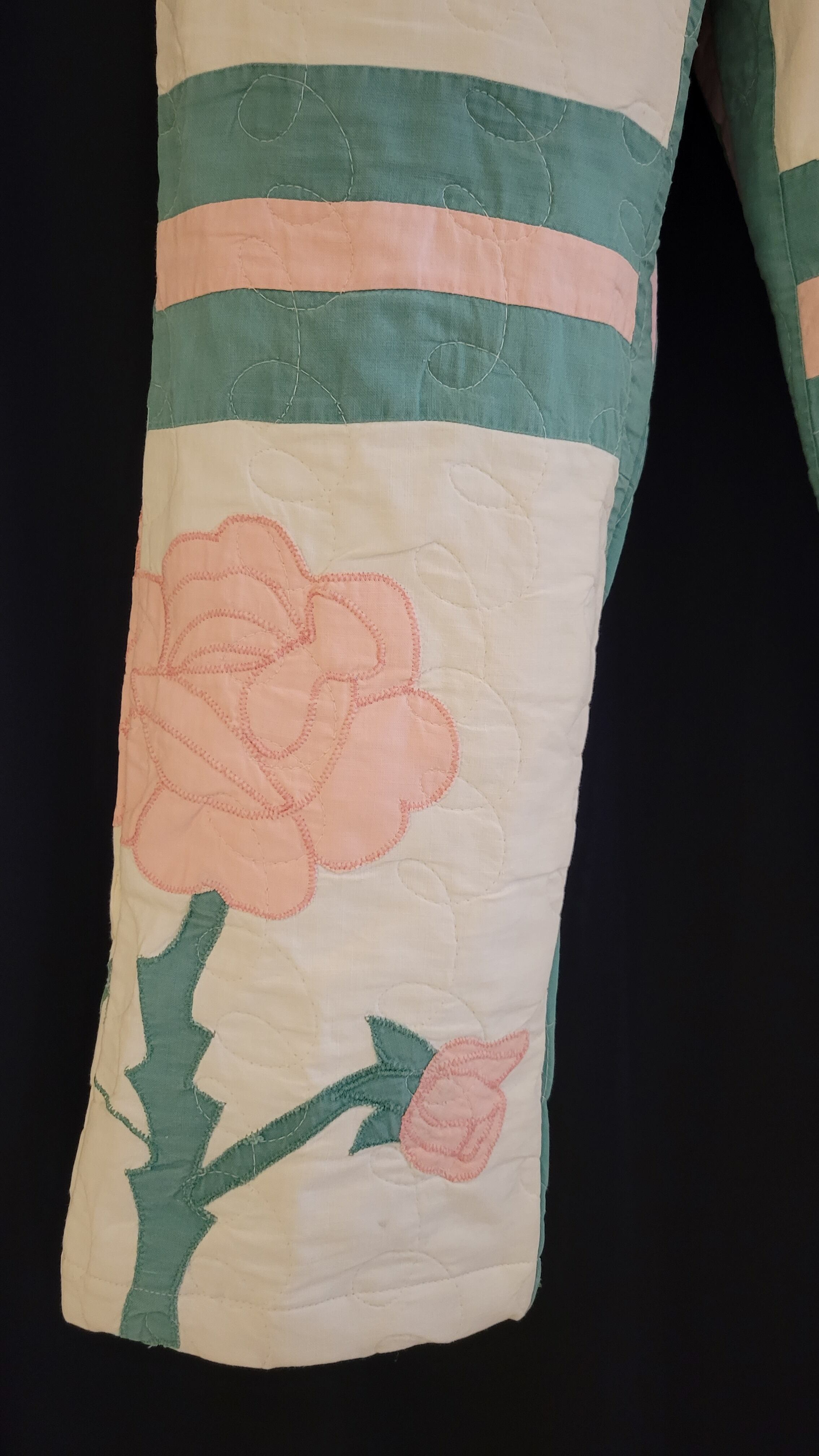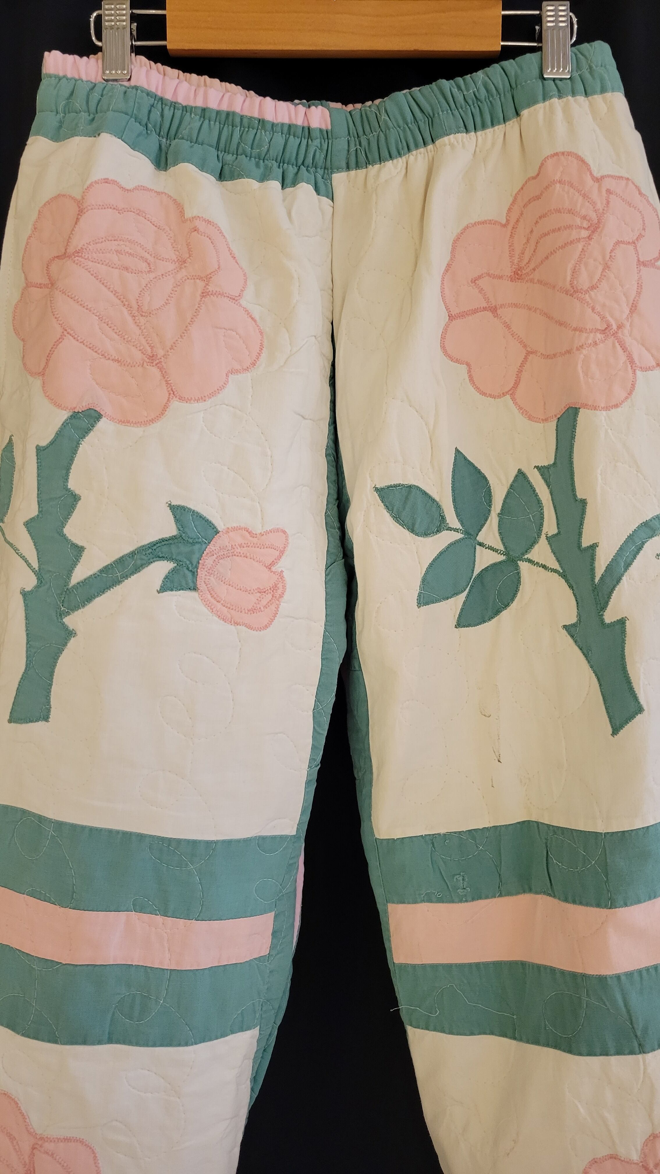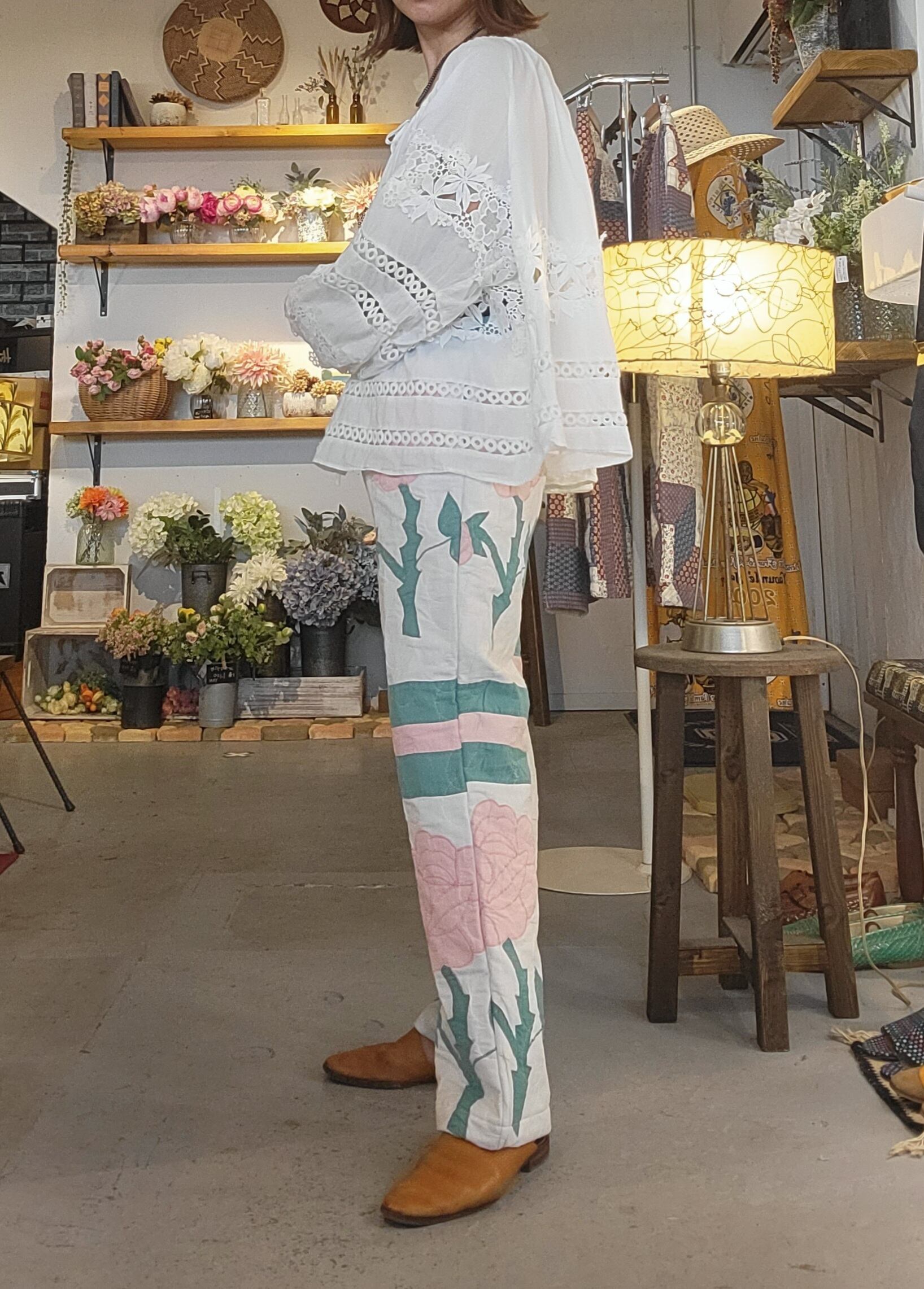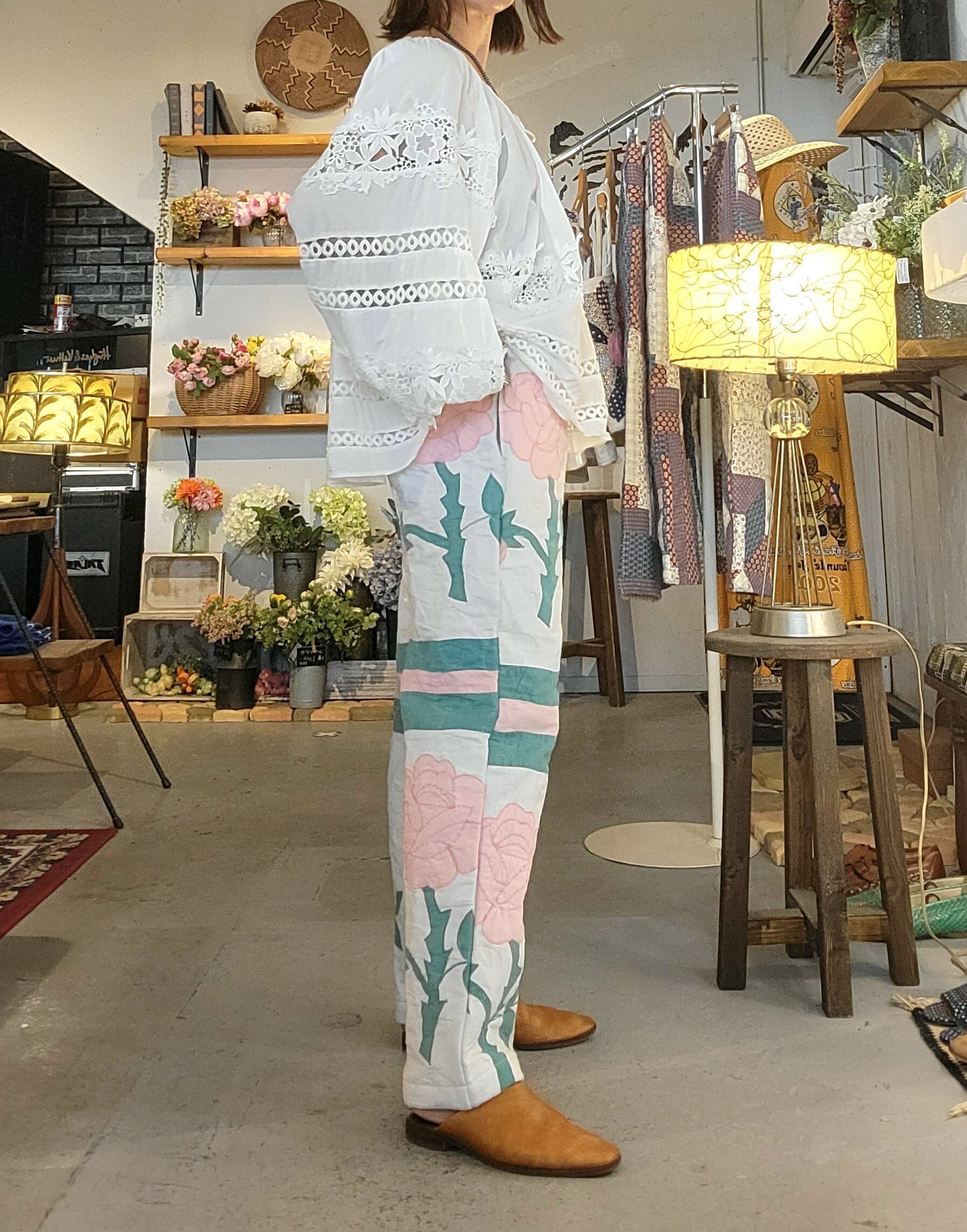 ヴィンテージのパッチワークキルト生地を使用したリメイクイージーパンツ。素材はコットンです。左右にポケット付き。古いキルトのため生地ダメージが数ヶ所見られます。着用に支障はありません。画像でご確認ください。