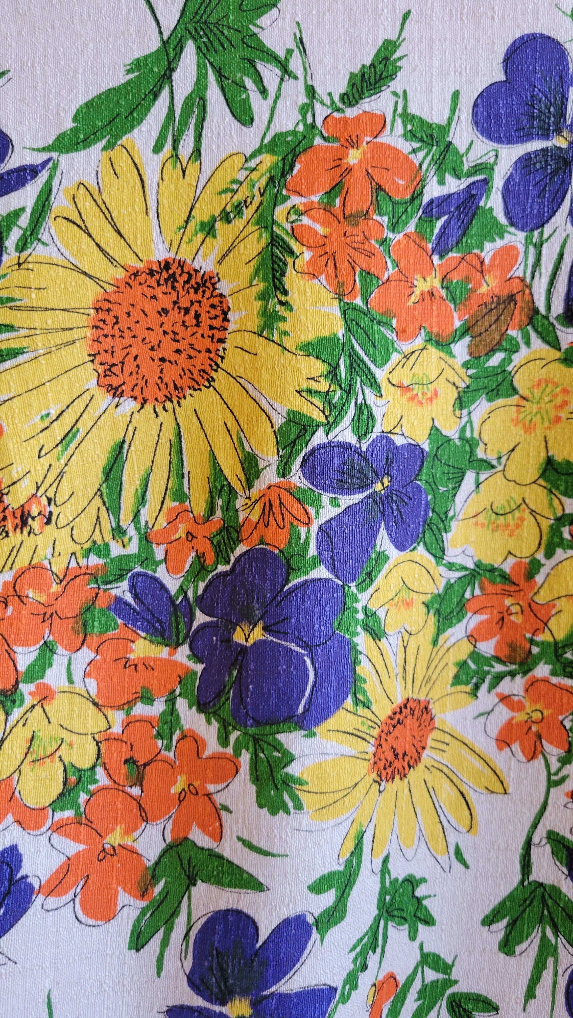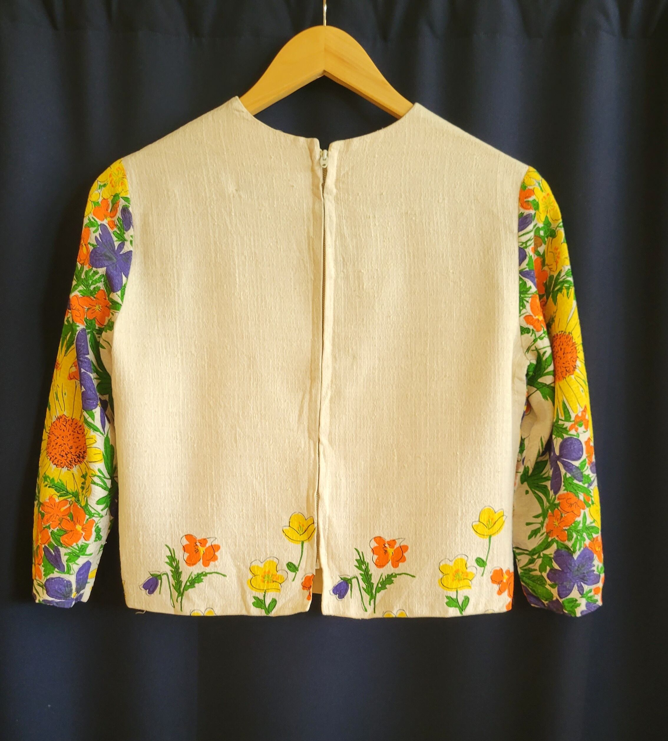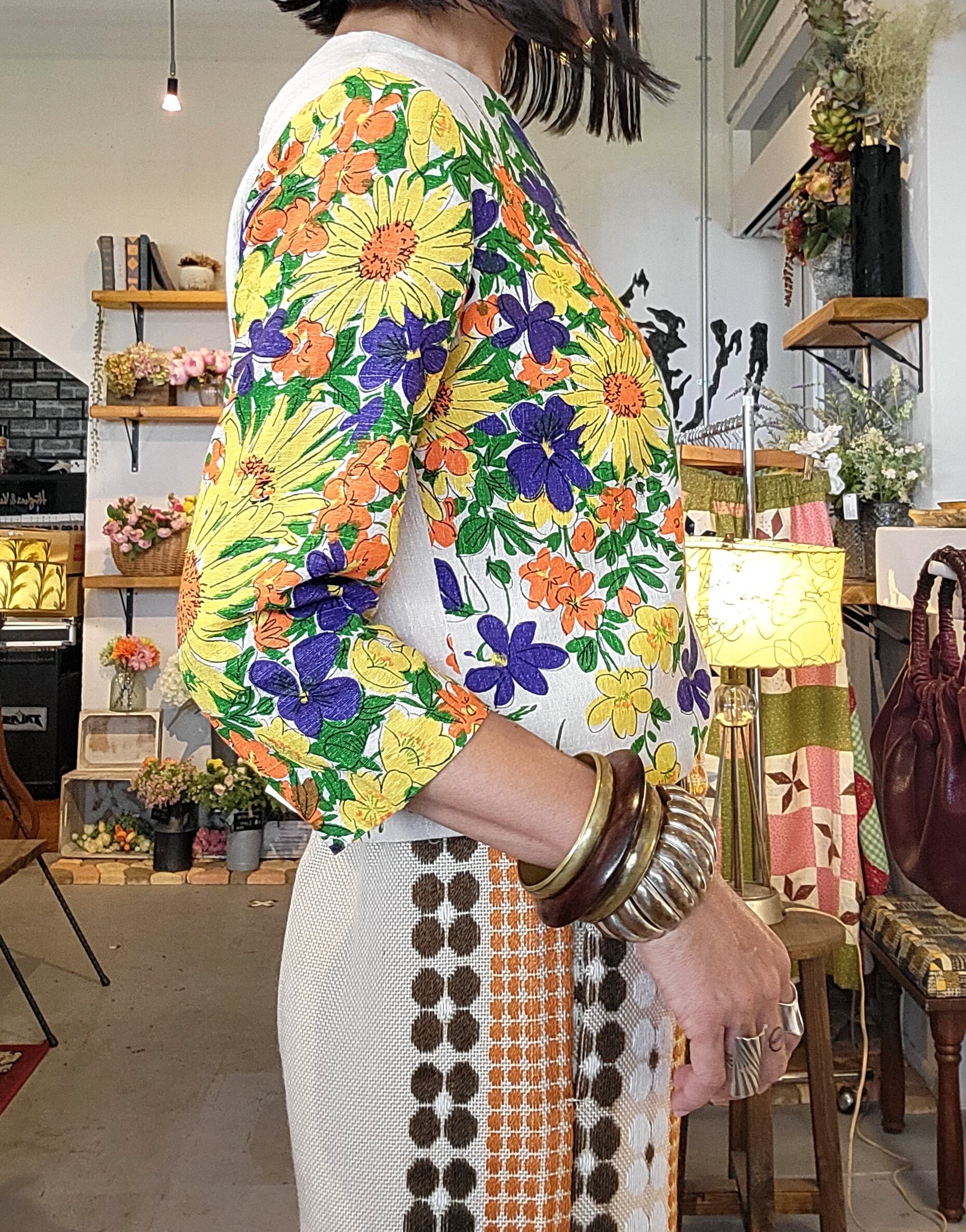 ヴィンテージの花柄ブラウス。バックファスナーがフルオープンになるので着脱が楽です。7分袖と短めの丈のコンパクトなサイズ感。ハイウエストのボトムとの相性ぴったりです。