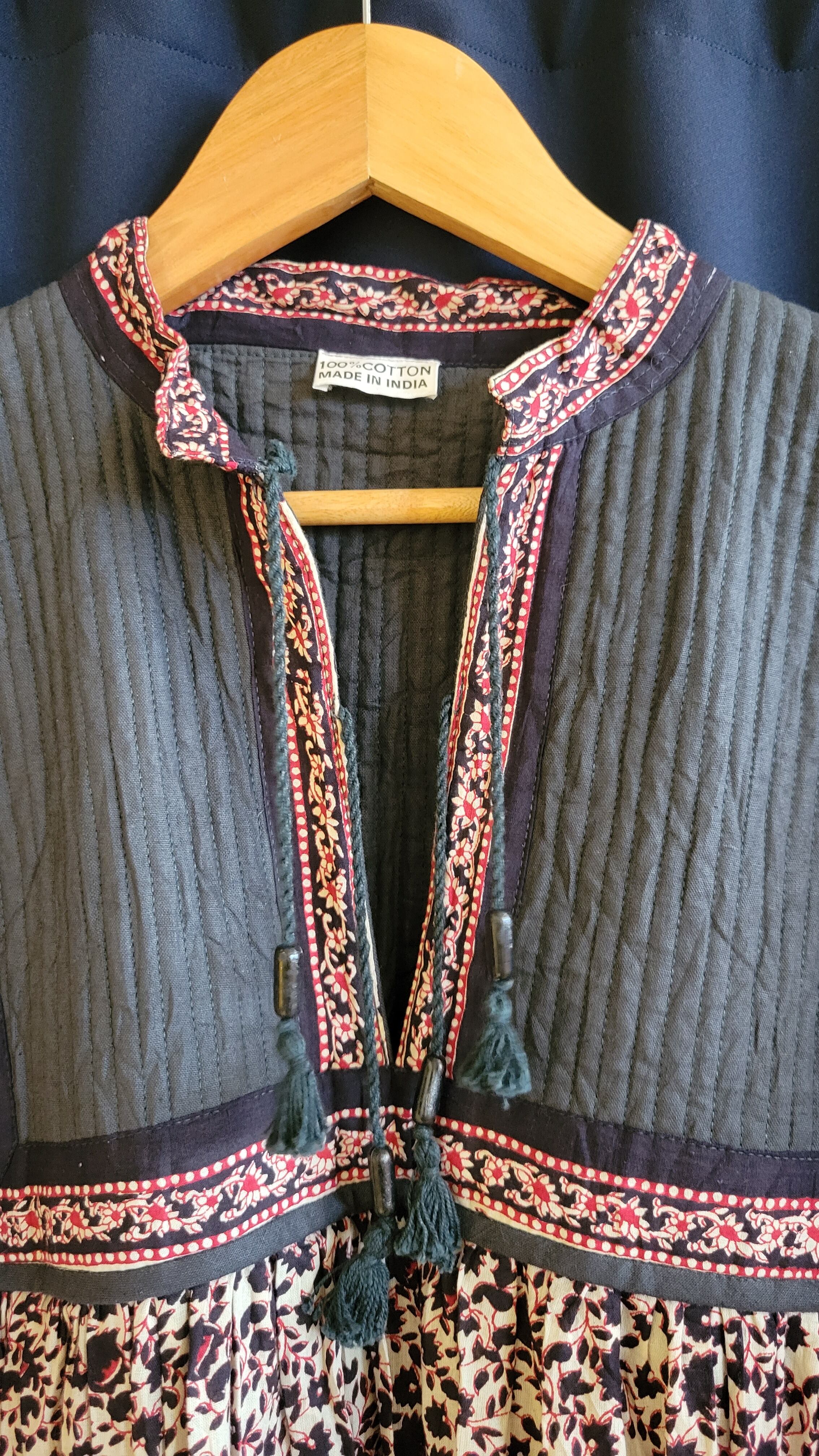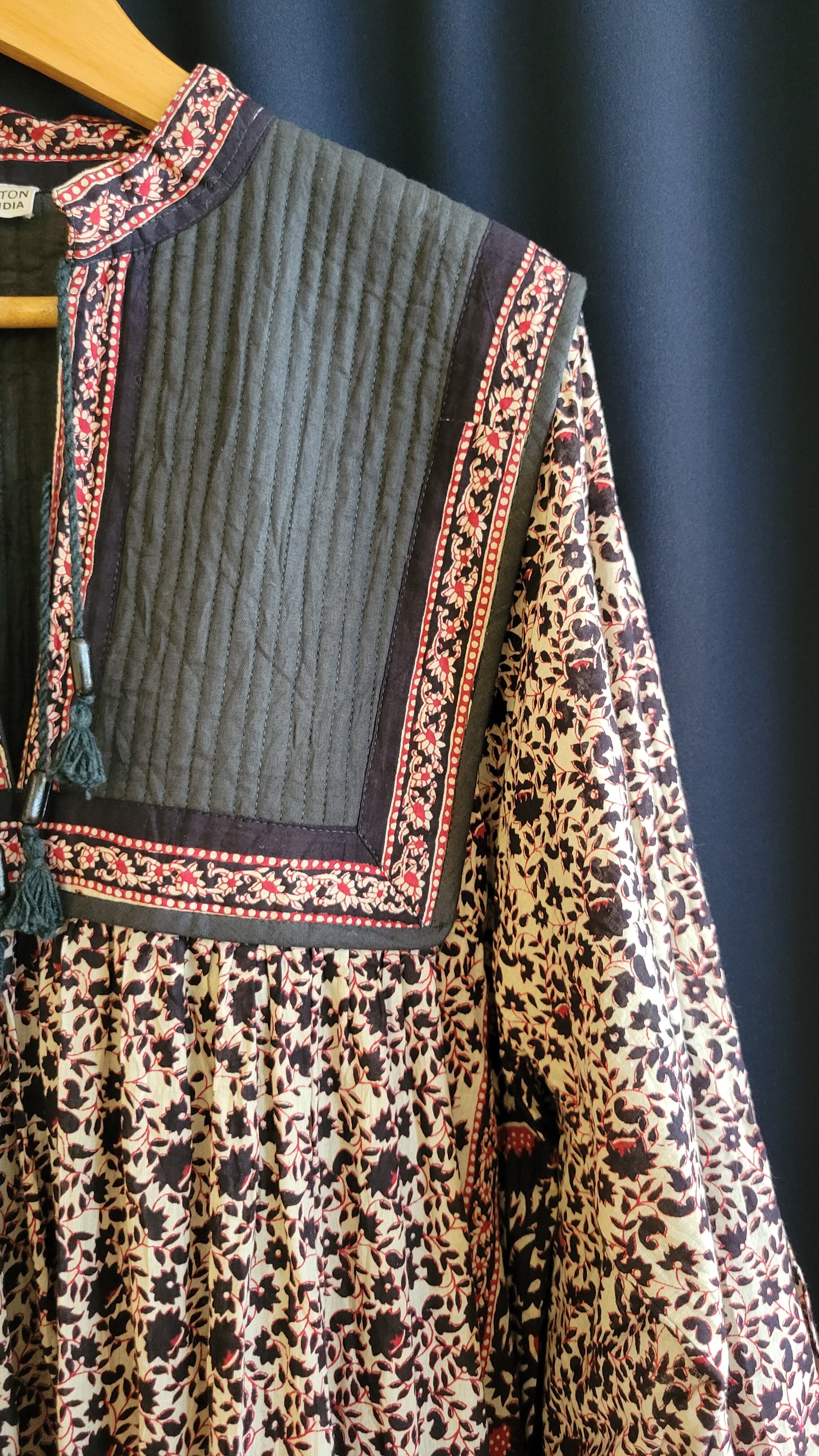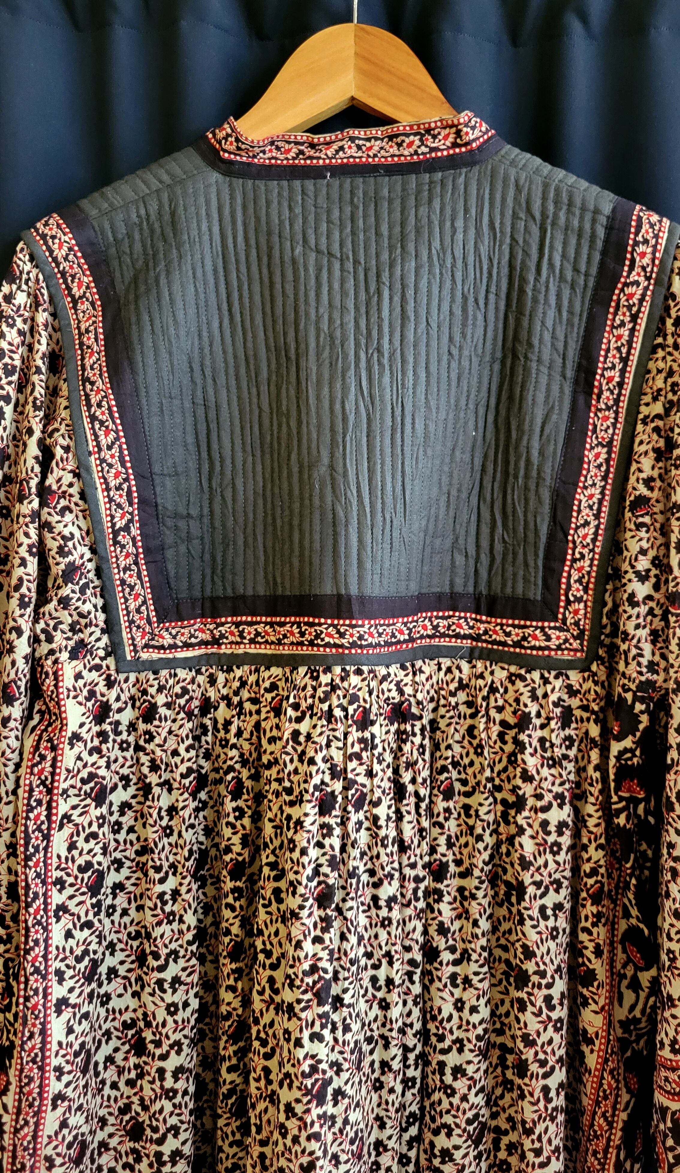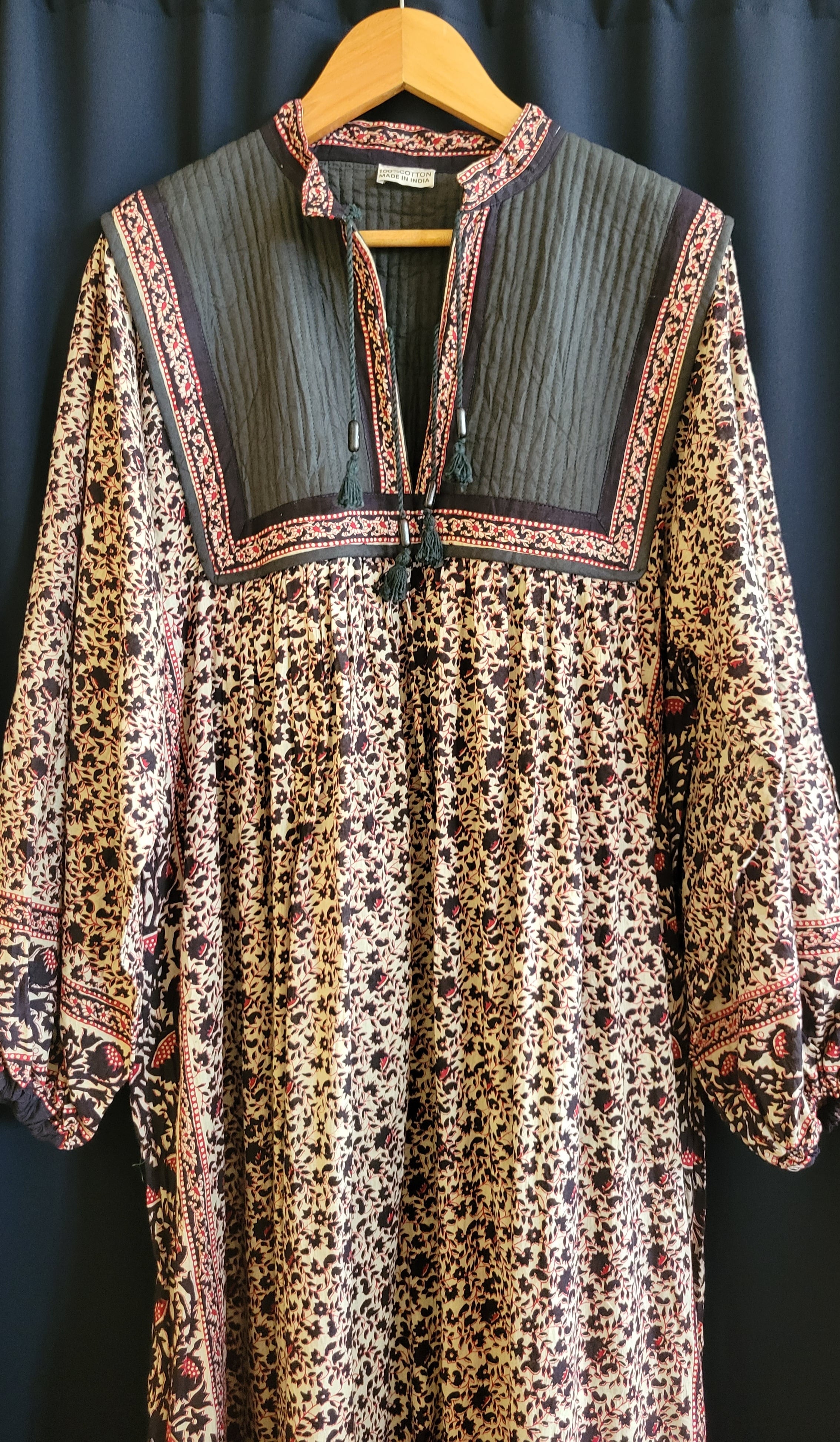 ヴィンテージのインディアンコットンのマキシドレス。ほぼ未使用の大変良いコンディションです。袖口にゴムの入ったふんわり袖。たっぷりの着丈とシックなカラーで大人っぽい雰囲気の1枚です。