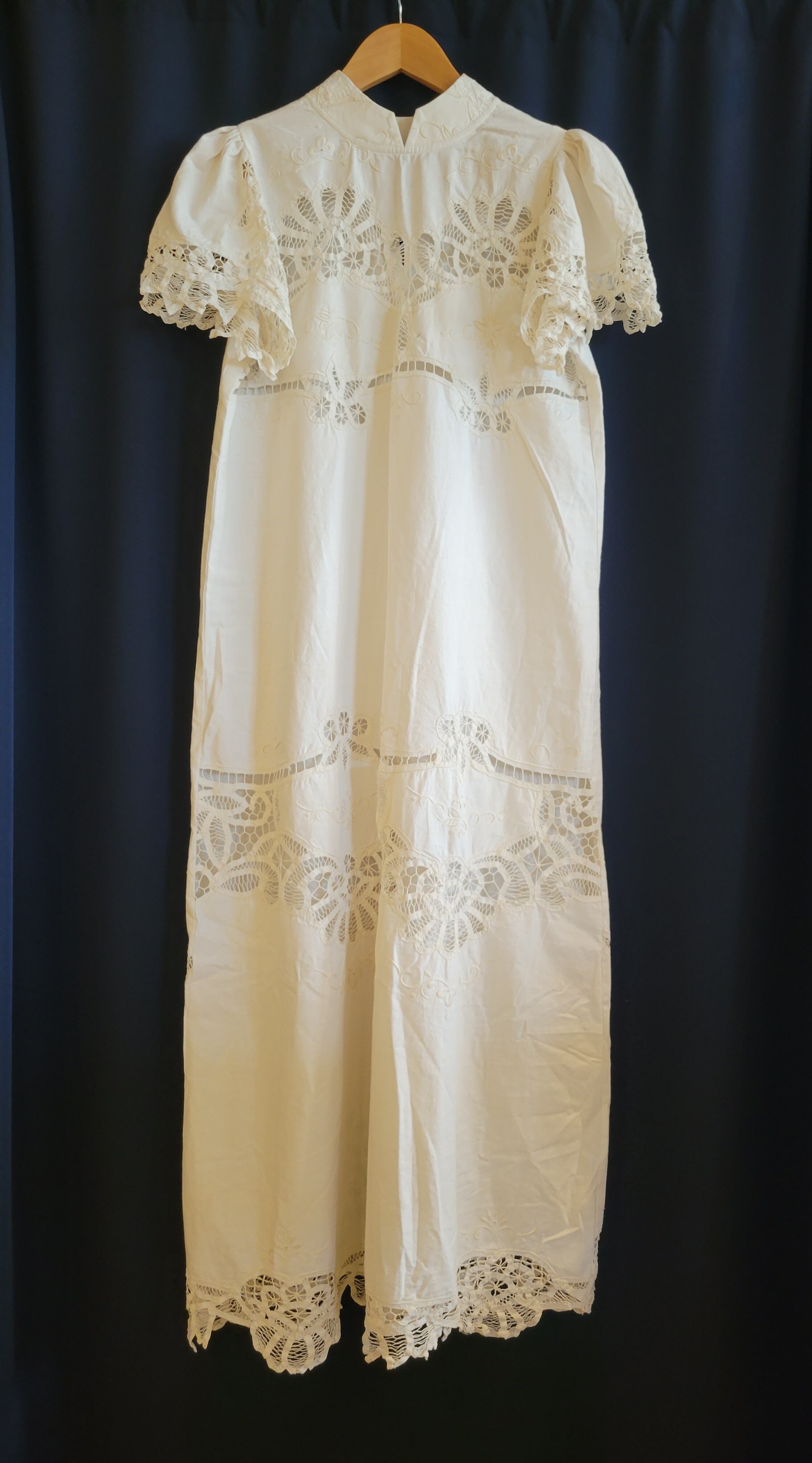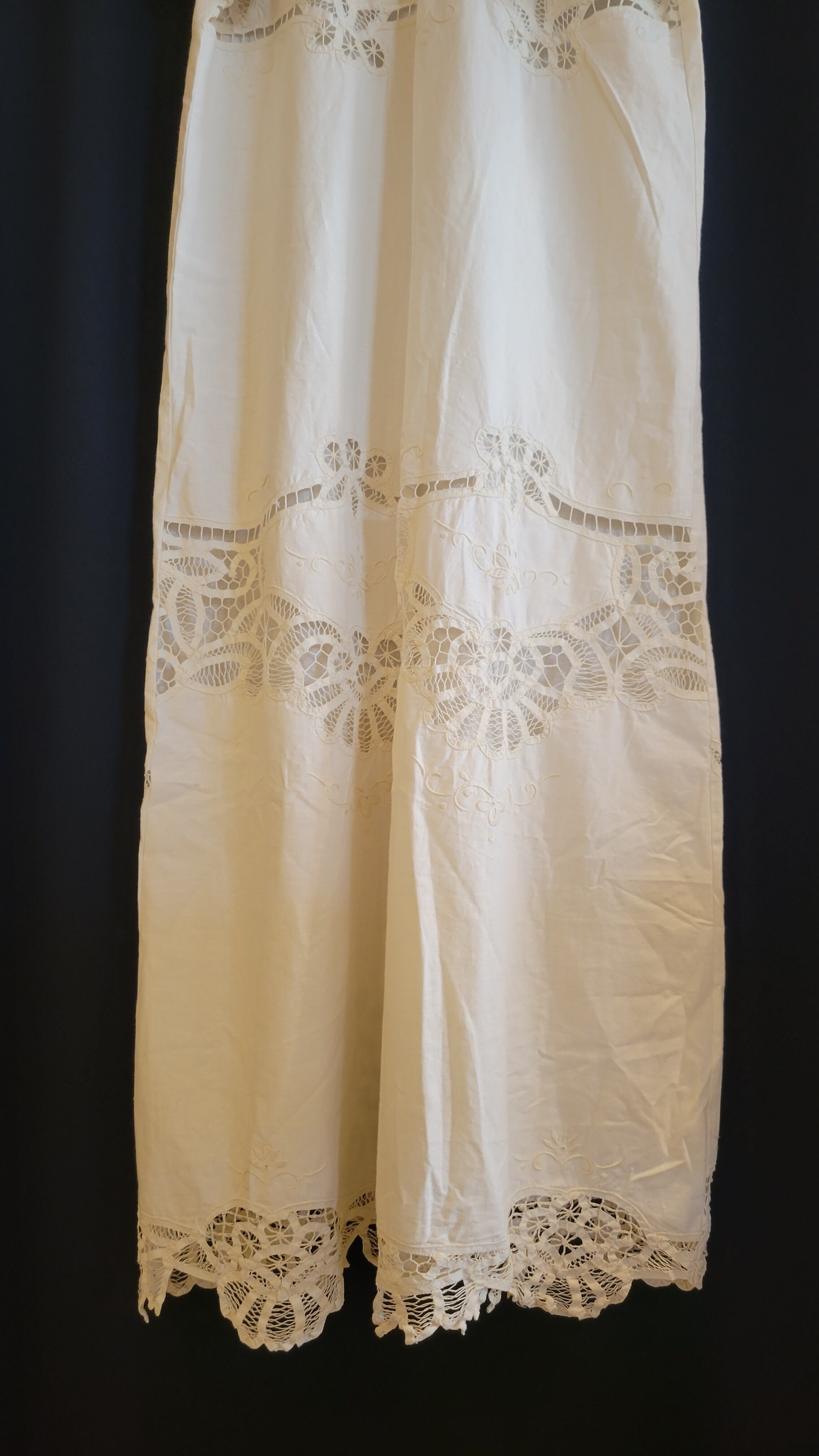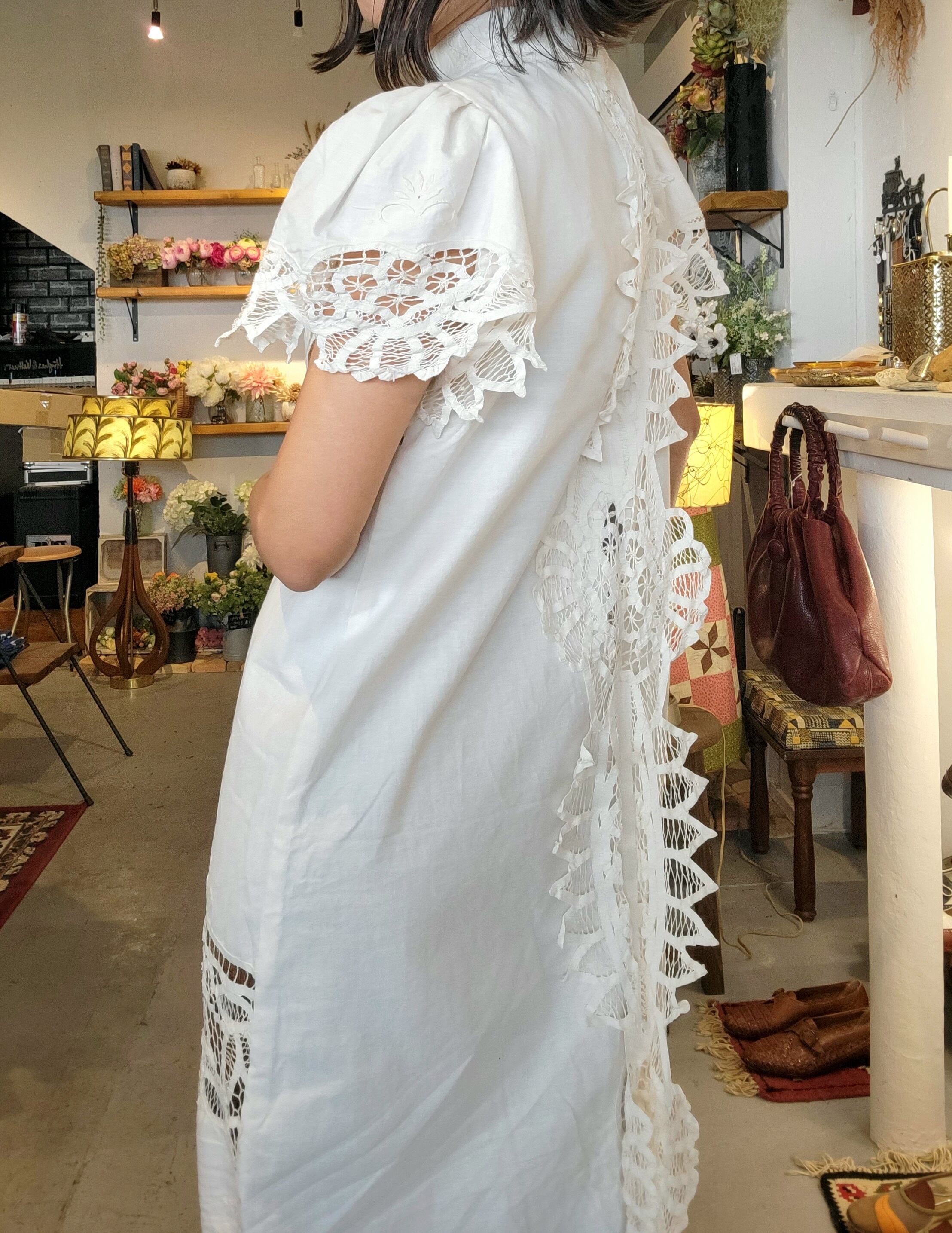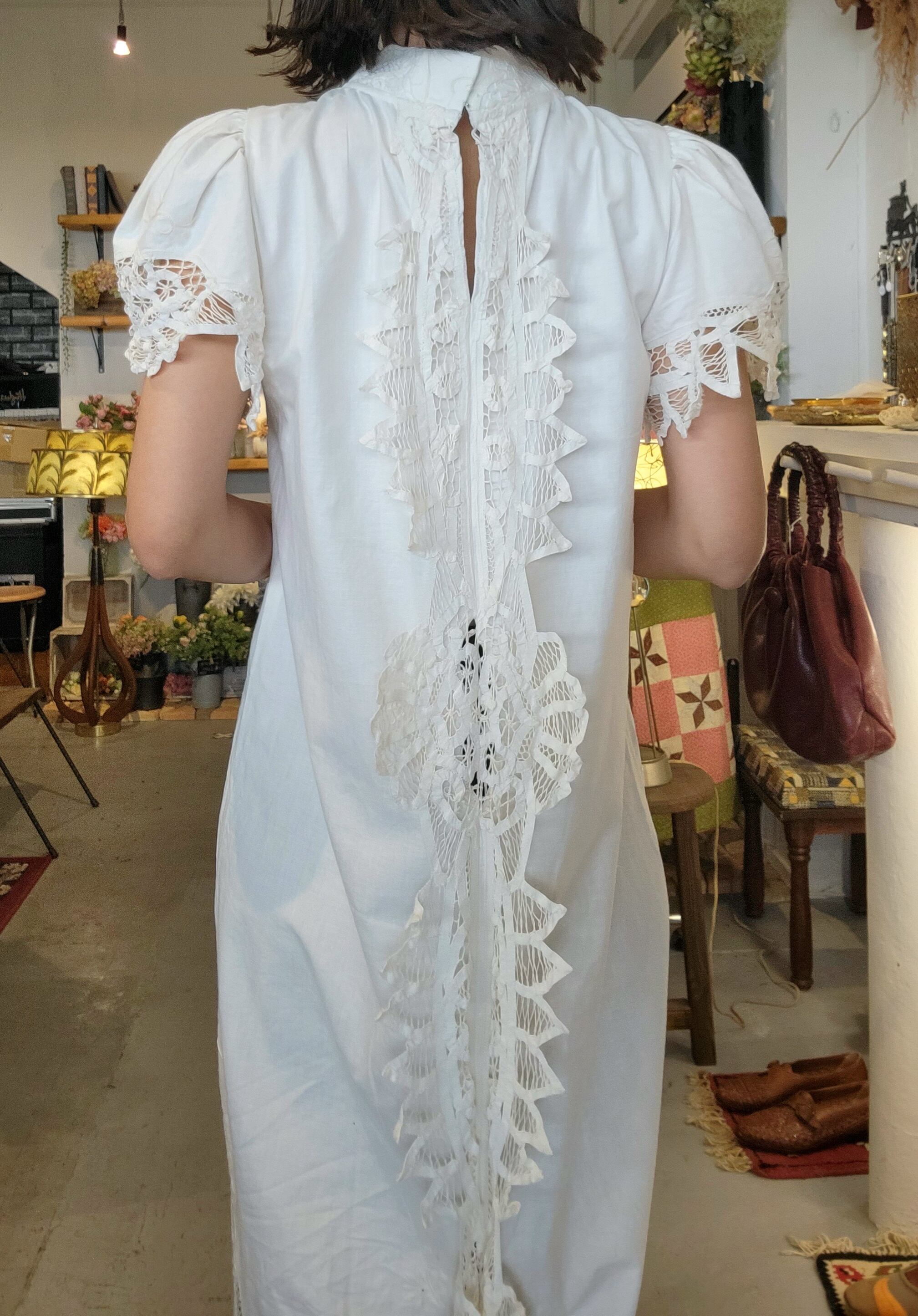 ヴィンテージのコットン生地をたっぷり使用したリメイクワンピース。首後ろにホックがひとつ付いています。マオカラーとふんわり袖が上品な印象。バテンレースが華やかな1枚です。