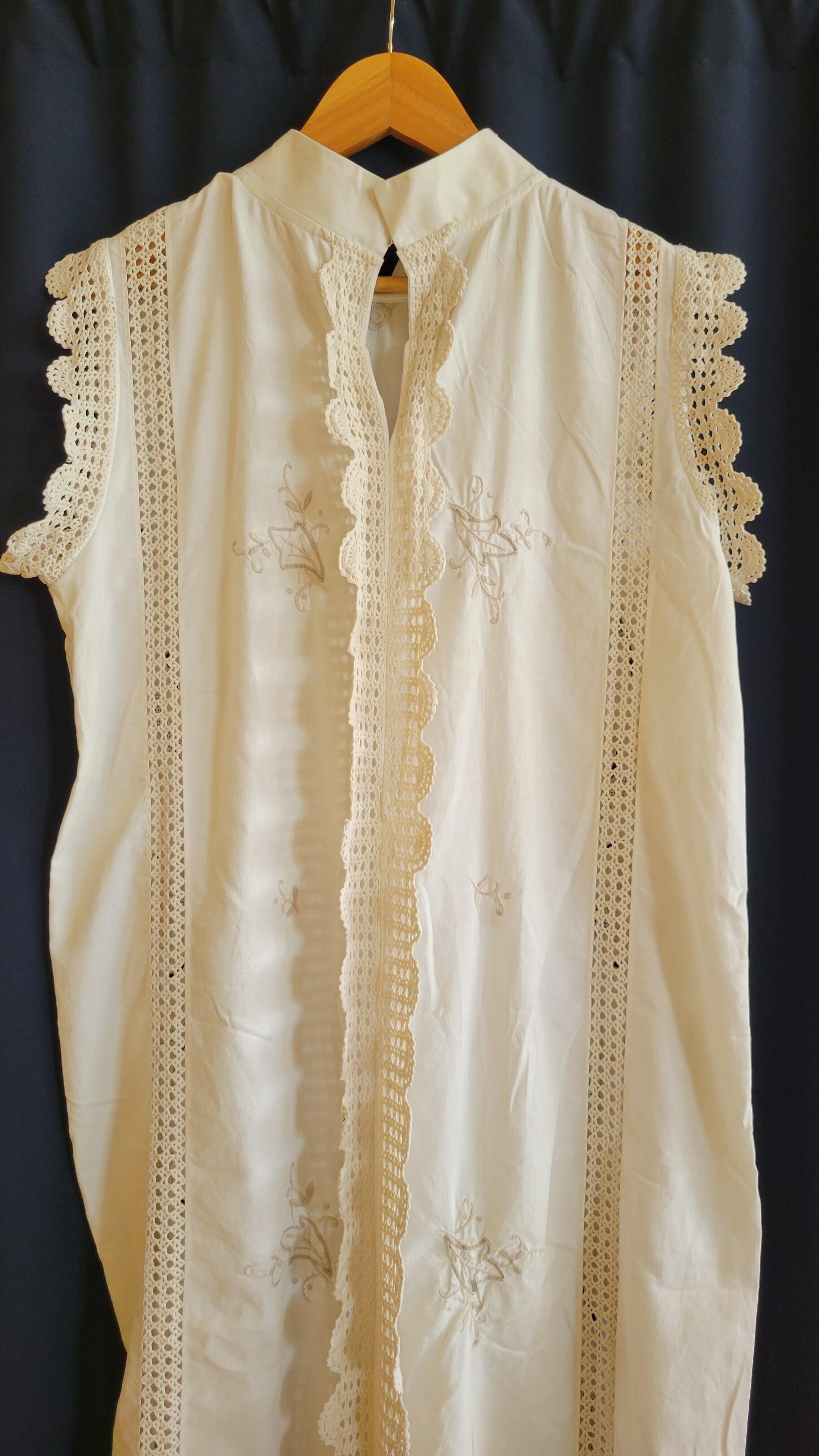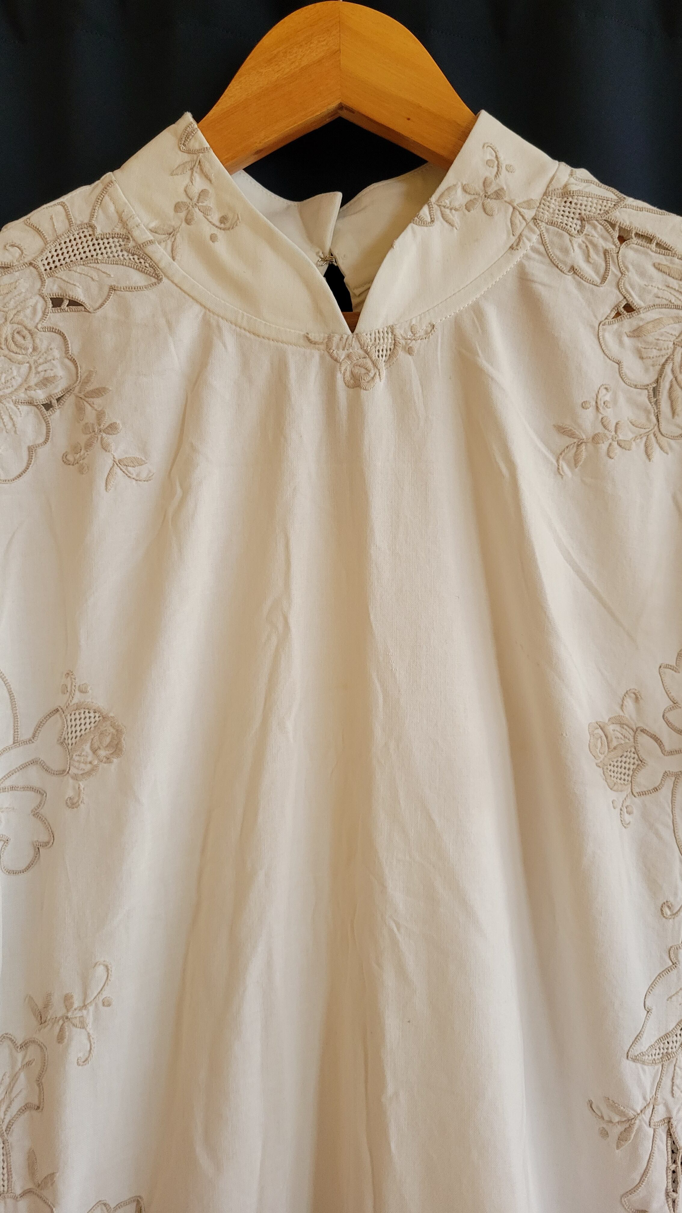 ヴィンテージのコットン生地をたっぷり使用したリメイクワンピース。首後ろにホックがひとつ付いています。マオカラーとレースが上品な印象の1枚です。
