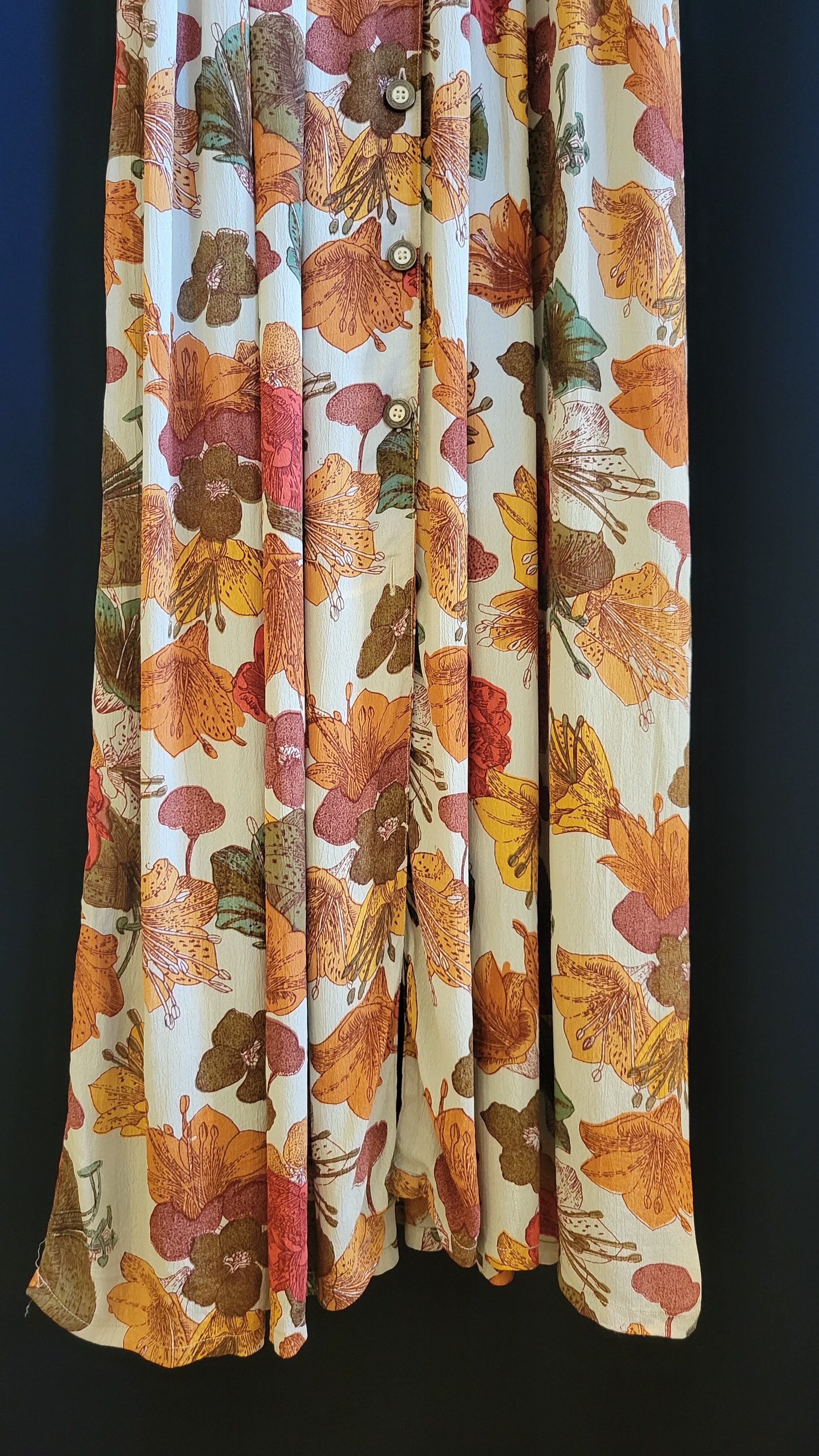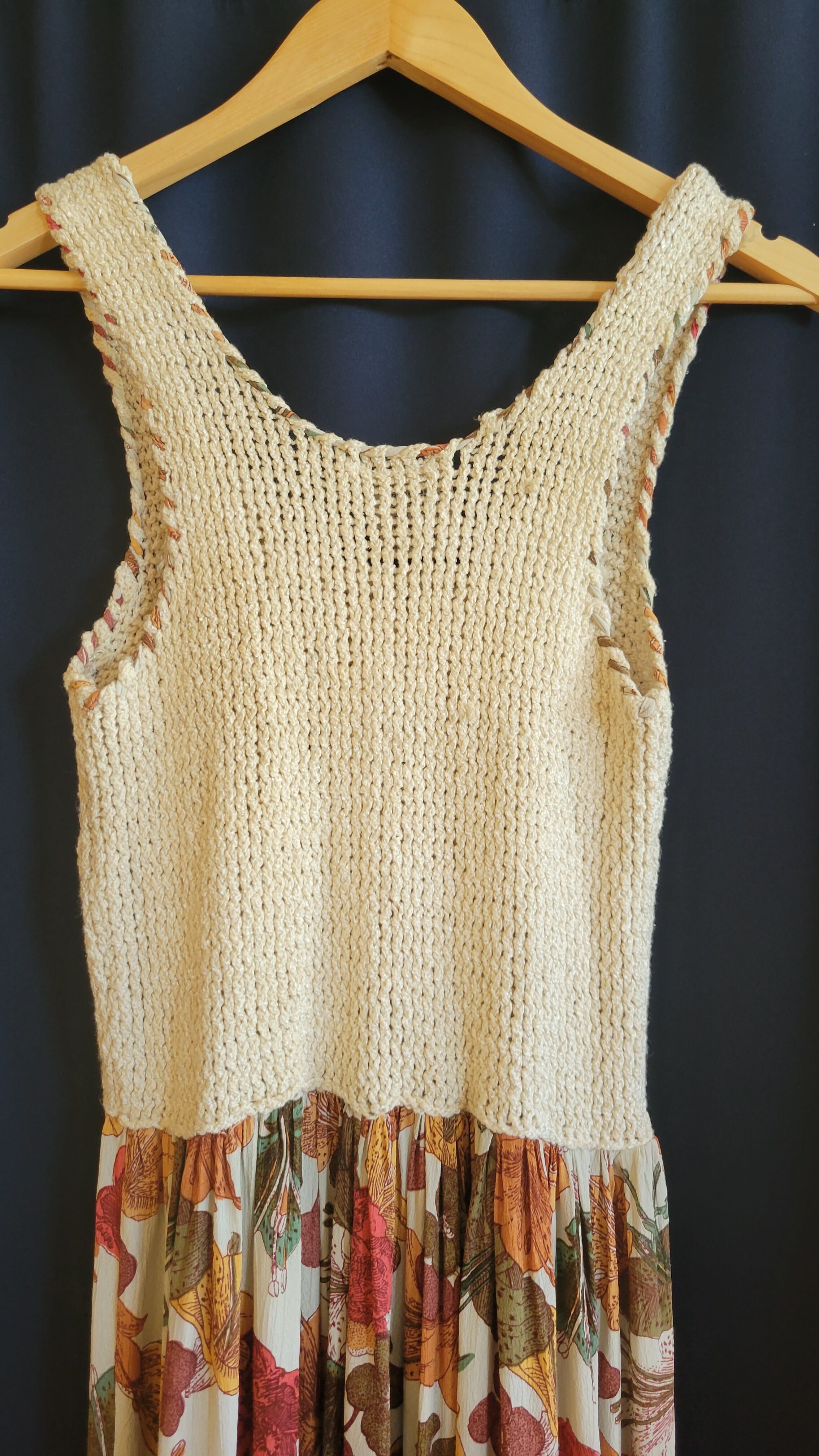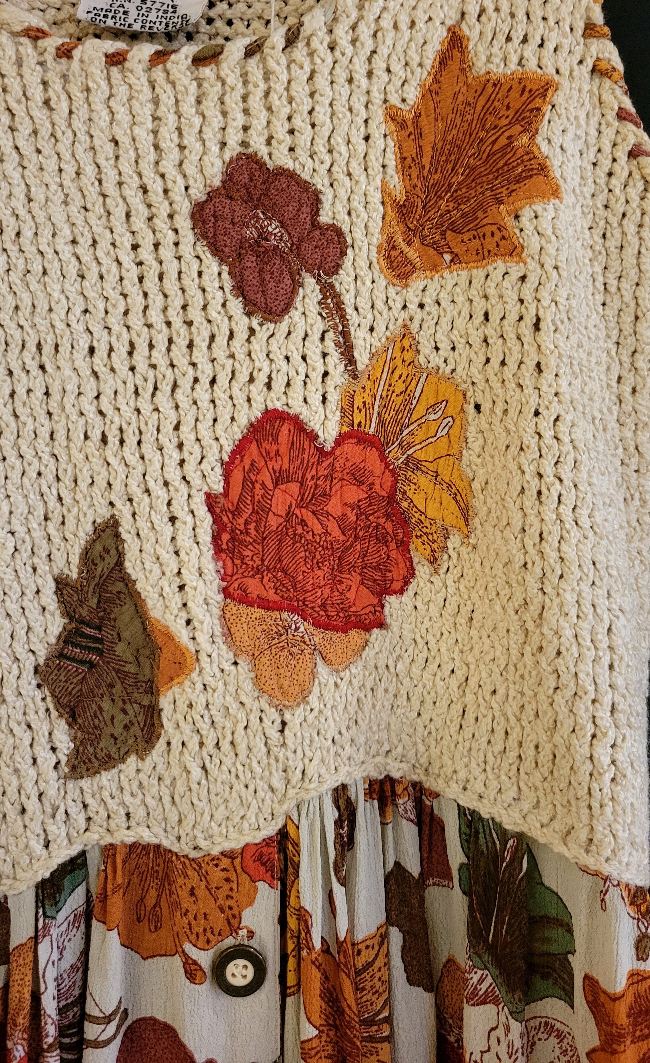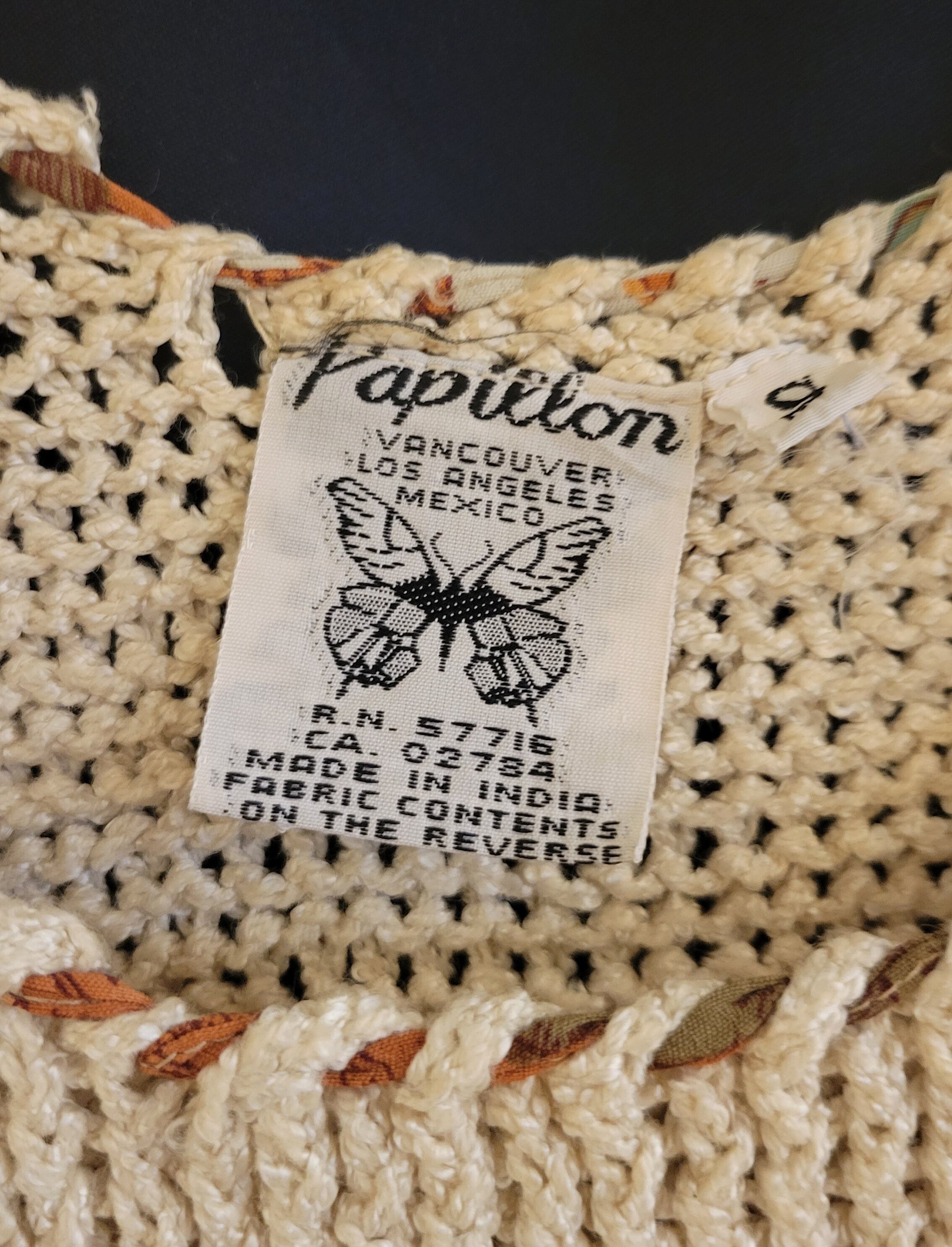 Made in India "papillon" のヴィンテージワンピース。素材表記はレーヨン100%です。トップス部分がニットになり伸縮性があります。胸元の草花はプリントではなくアップリケです。落ち着いたカラーとカジュアル感で気負わず着られるヴィンテージワンピースです。*背中側のニット部分に穴ではありませんが編み目の荒い部分があります。画像でご確認ください。