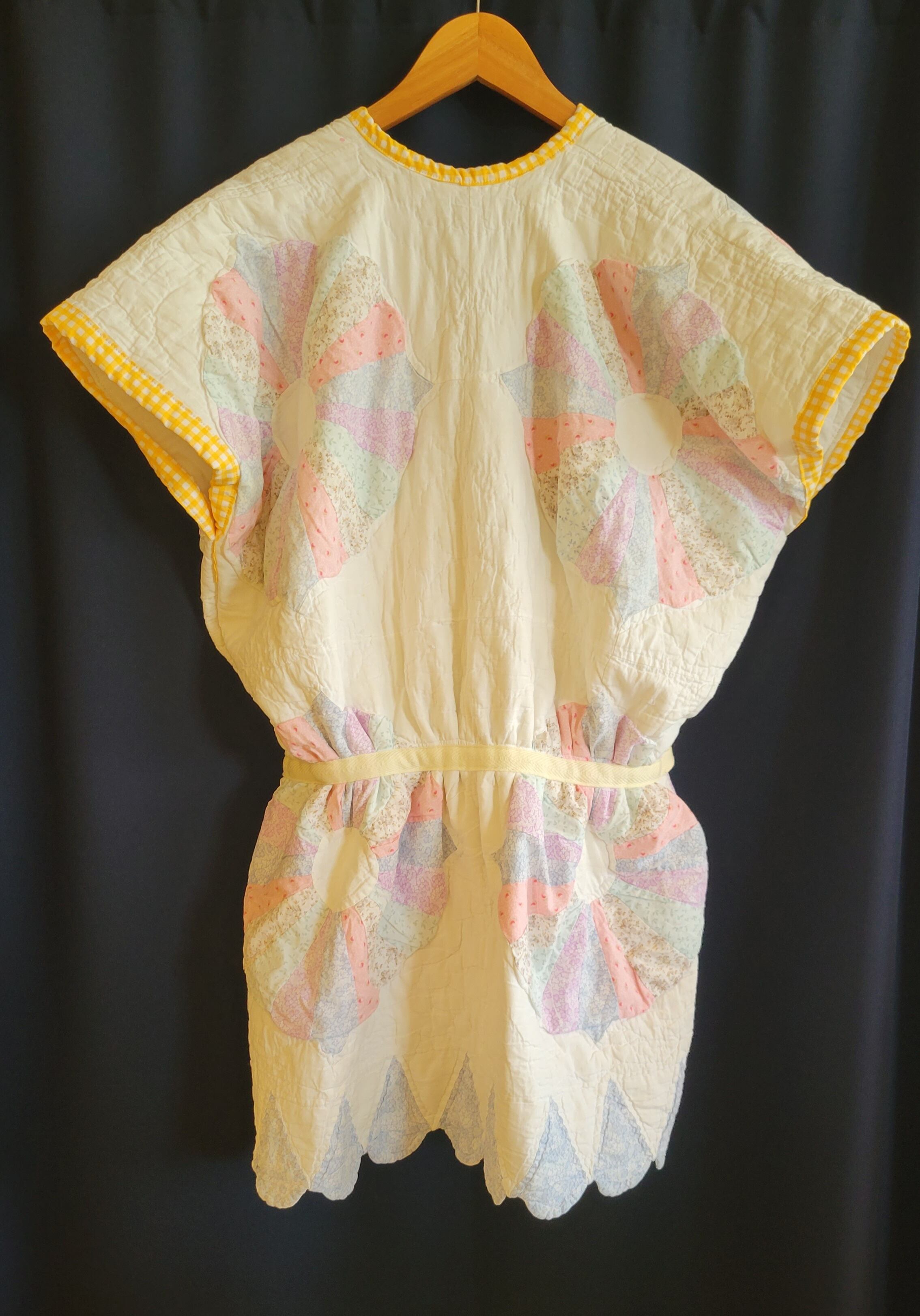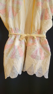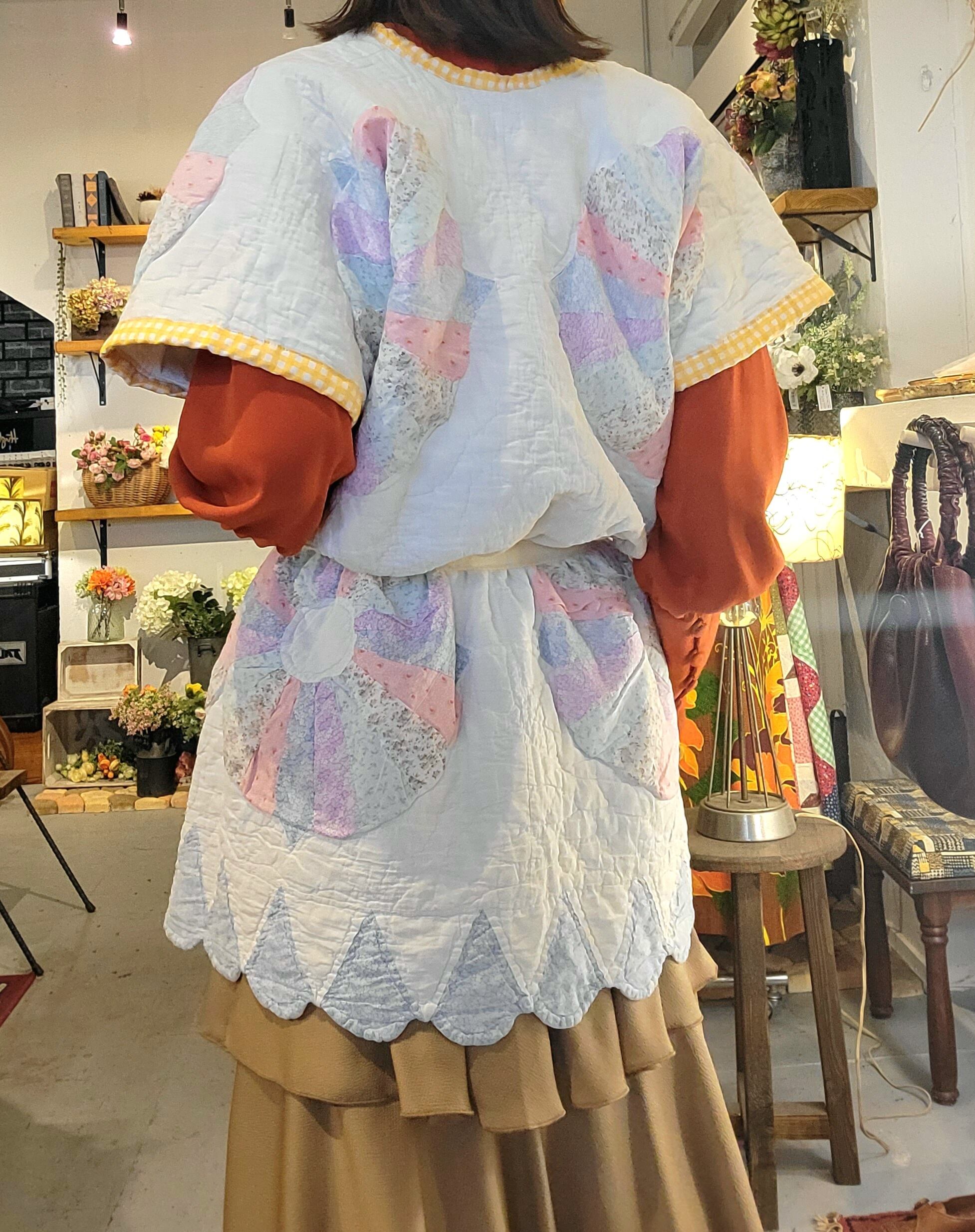 ヴィンテージのパッチワークキルト生地を使用したリメイクベスト。淡いパステルカラーのドレスデンパッチワークが優しい印象です。ウエストリボンはバックで縫い付けられています。サイドでそのまま垂らしても、フロントできゅっと結んでも可愛く着ていただけます。