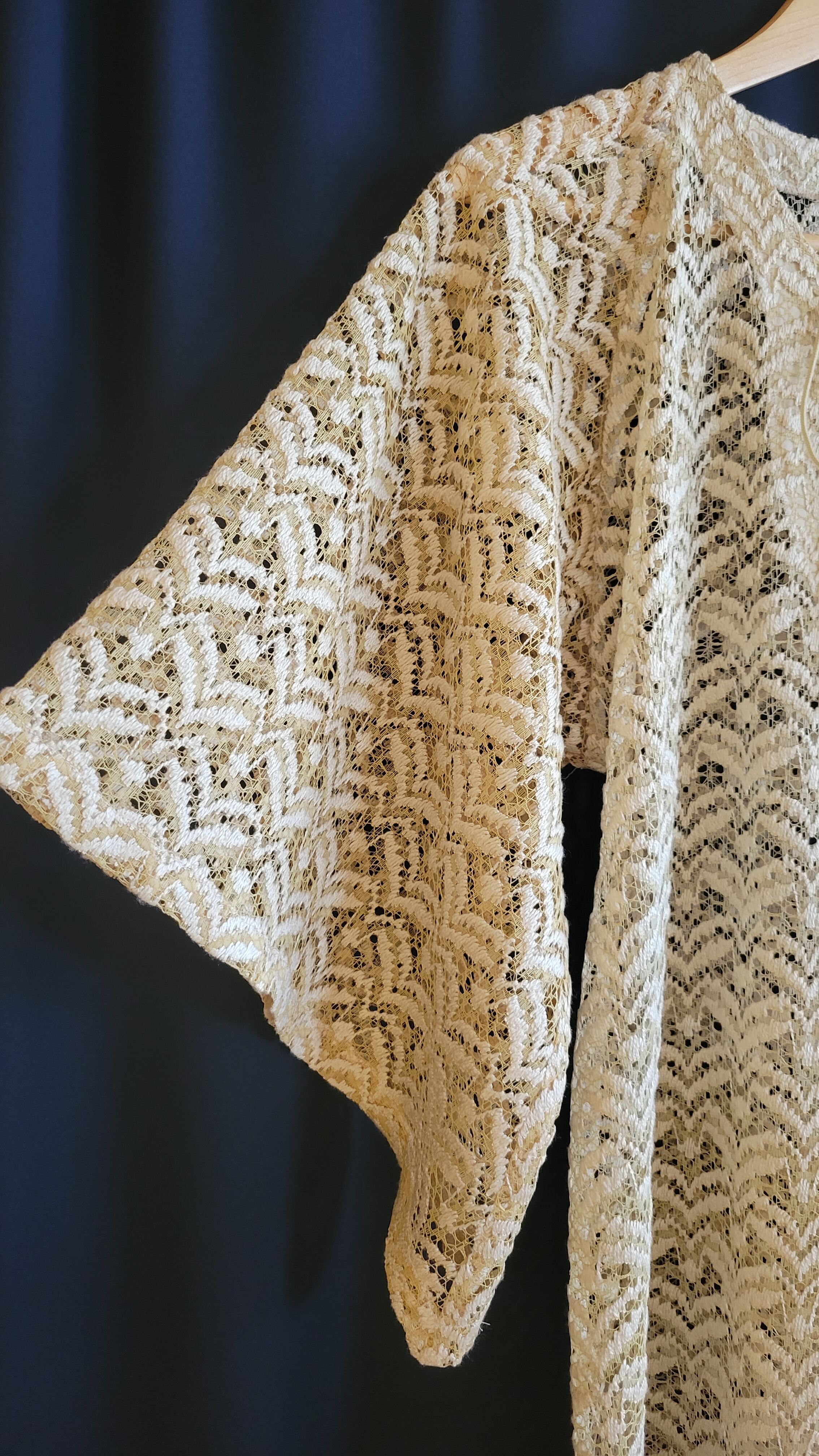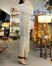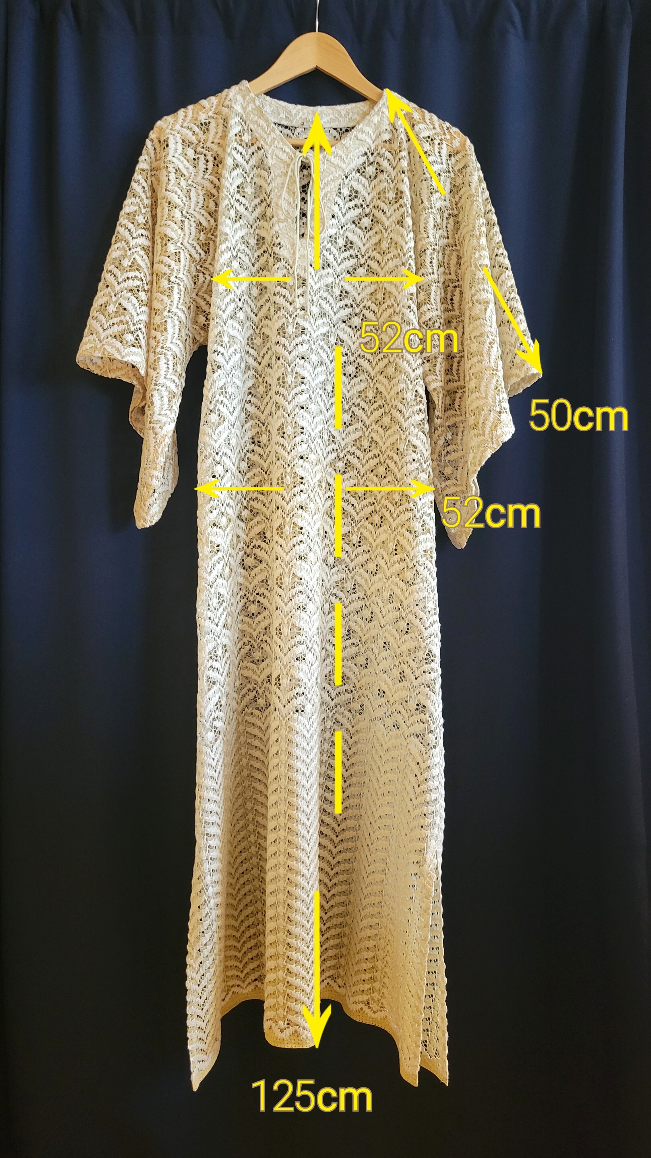 ヴィンテージのレースカーテンを使用したオリジナルのリメイクワンピース。素材不明ですがやや光沢のある、薄すぎないややしっかりめのレース素材です。伸縮性はありません。ファスーは付いておらず頭から被るタイプです。裏地はありません。締め付け感無く、大人っぽいリラクシングなワンピースです。