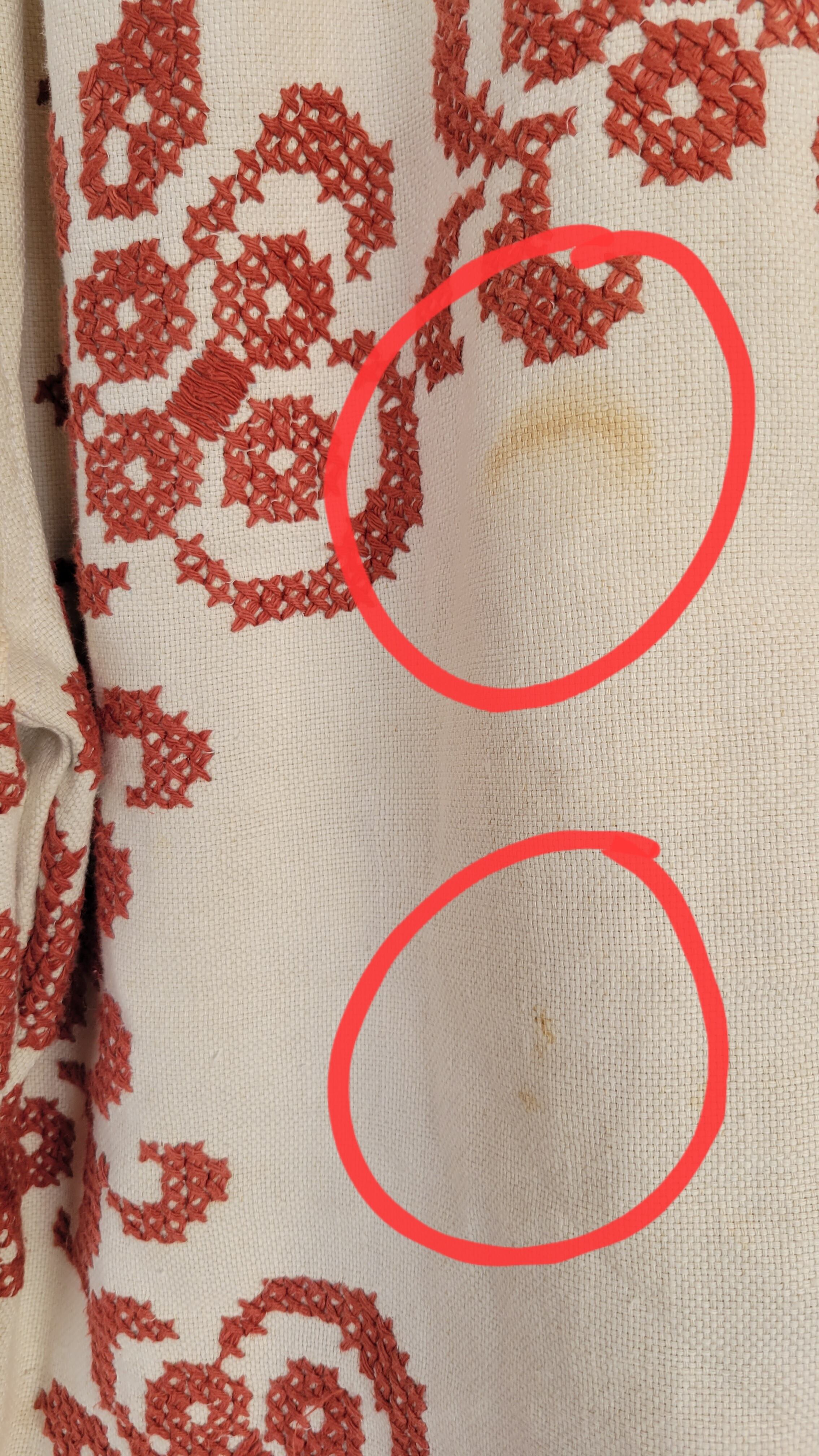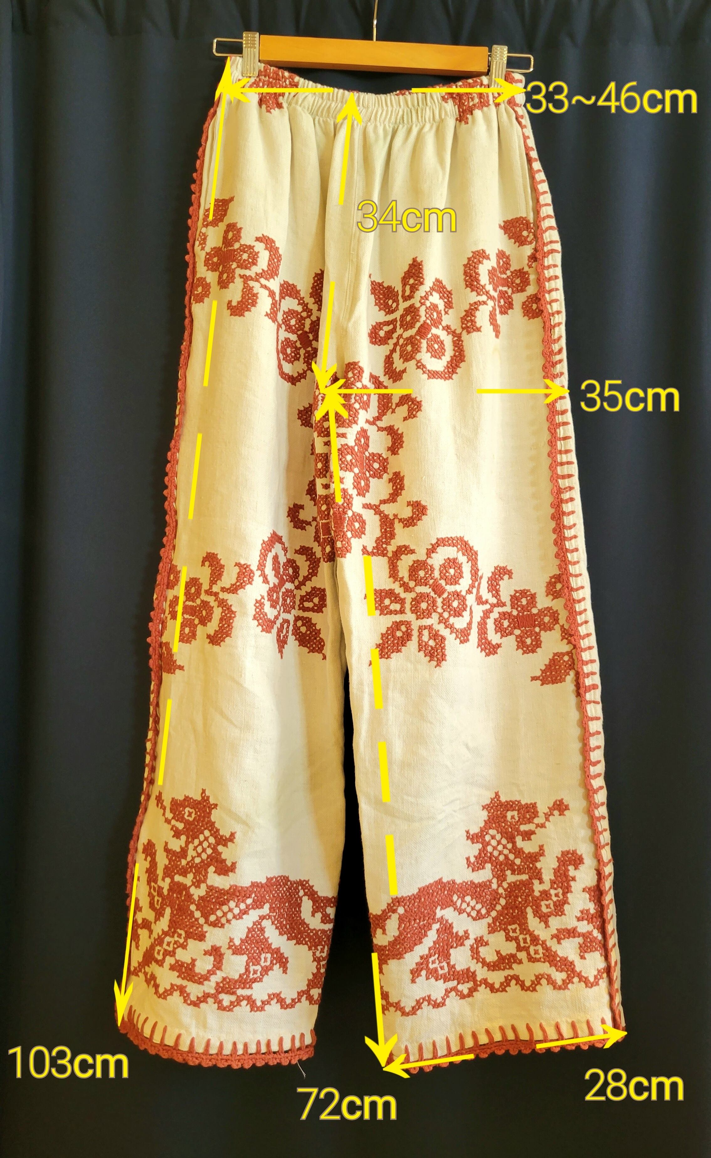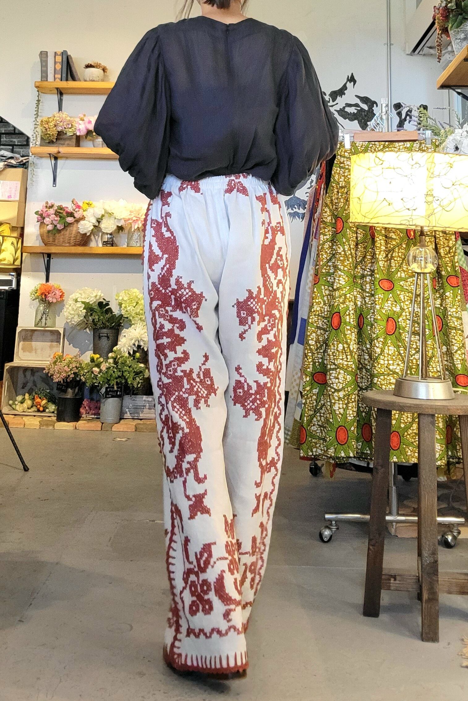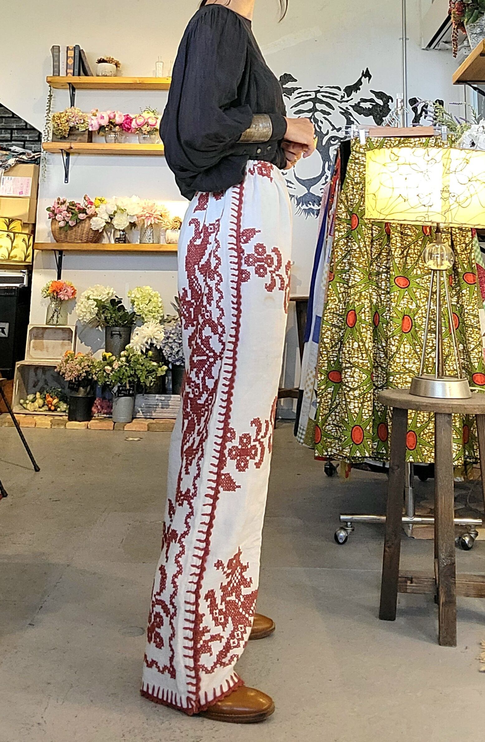 ヴィンテージの刺繍入りリネンクロスを使用したリメイクパンツ。ウエストゴムのイージーパンツです。左右にシームポケット付き。柄はプリントではなく全て刺繍です。リネンの肌触りが気持ち良い一本。*フロント左もも付近にシミが2ヶ所あります。画像でご確認ください。