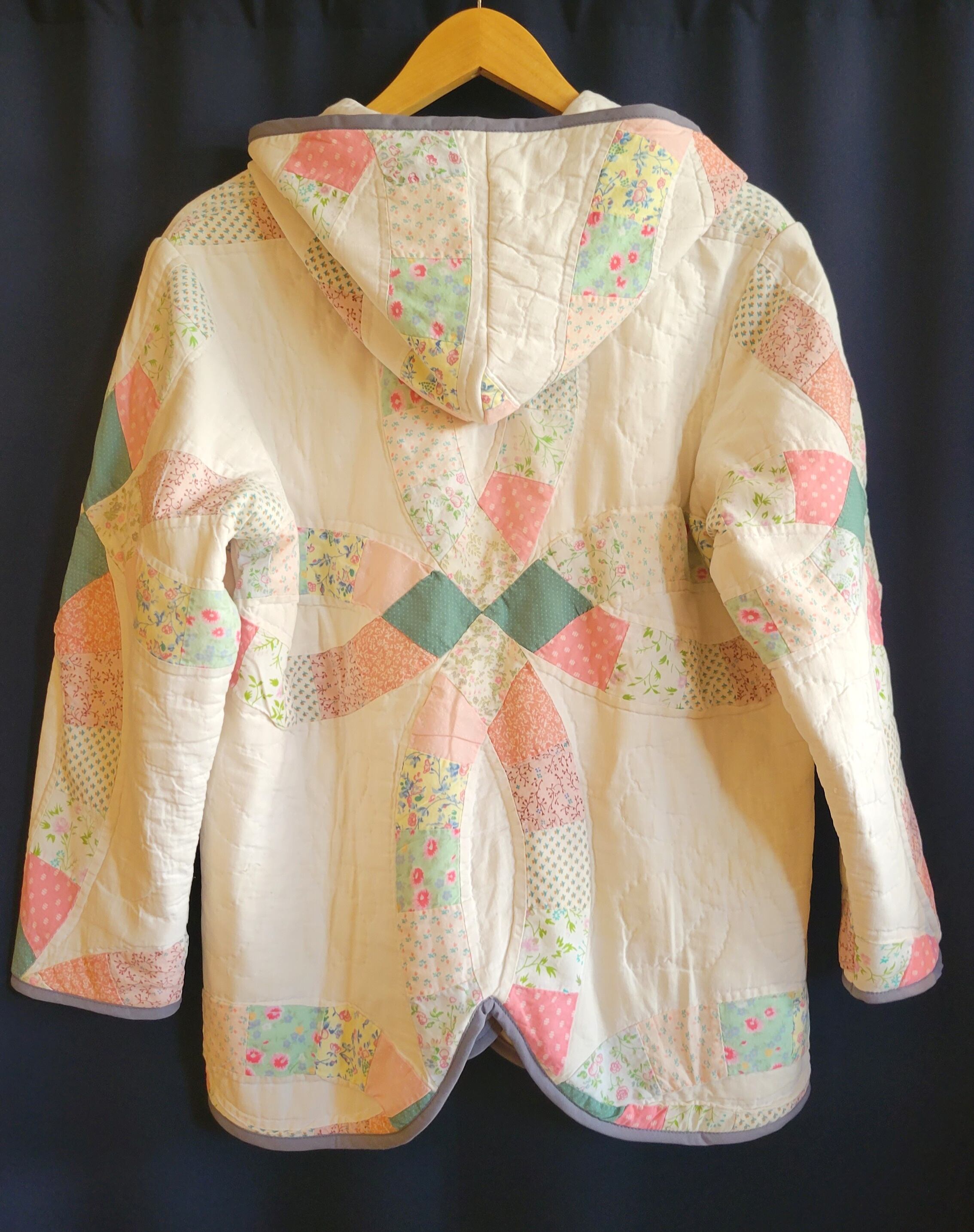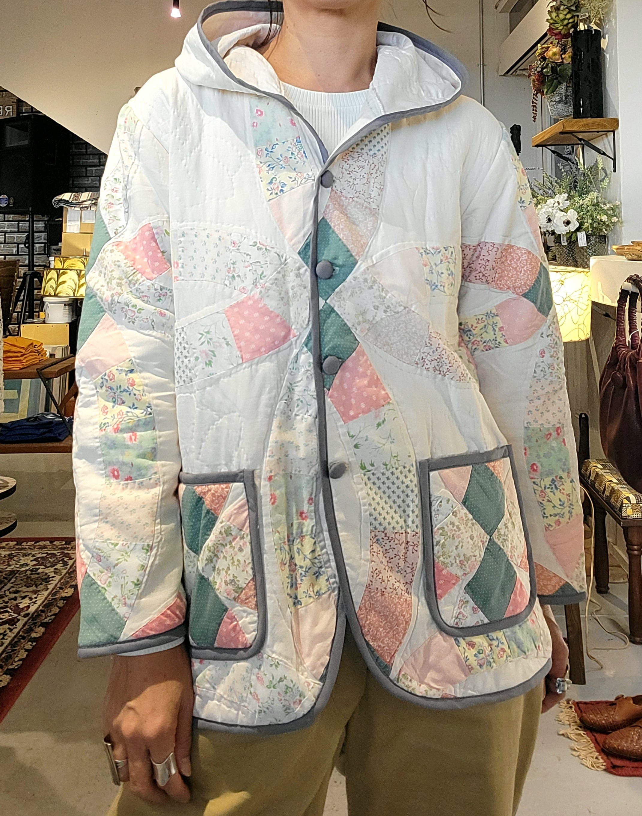 ヴィンテージのパッチワークキルト生地を使用したフード付きリメイクジャケット。こちらは海外のヴィンテージキルトコレクターの方に生地をご提供いただき、現地で仕立てたリメイクジャケットです。素材はコットンです。軽量でコットンの肌触りが気持ちの良い、気軽に羽織れるアウターとして重宝しそうな一着です。