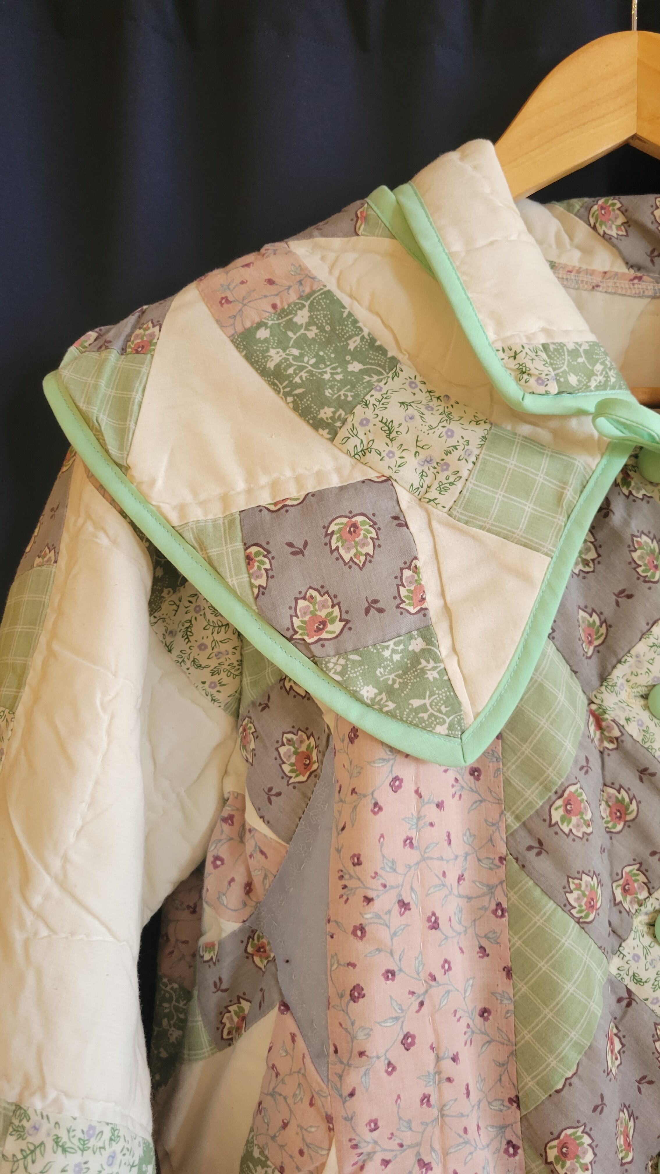 ヴィンテージのパッチワークキルト生地を使用したリメイクジャケット。こちらは海外のヴィンテージキルトコレクターの方に生地をご提供いただき、現地で仕立てたリメイクジャケットです。素材はコットンです。襟は取り外しができ、単体で付け襟としても楽しめます。軽量でコットンの肌触りが気持ちの良い、気軽に羽織れるアウターとして重宝しそうな一着です。