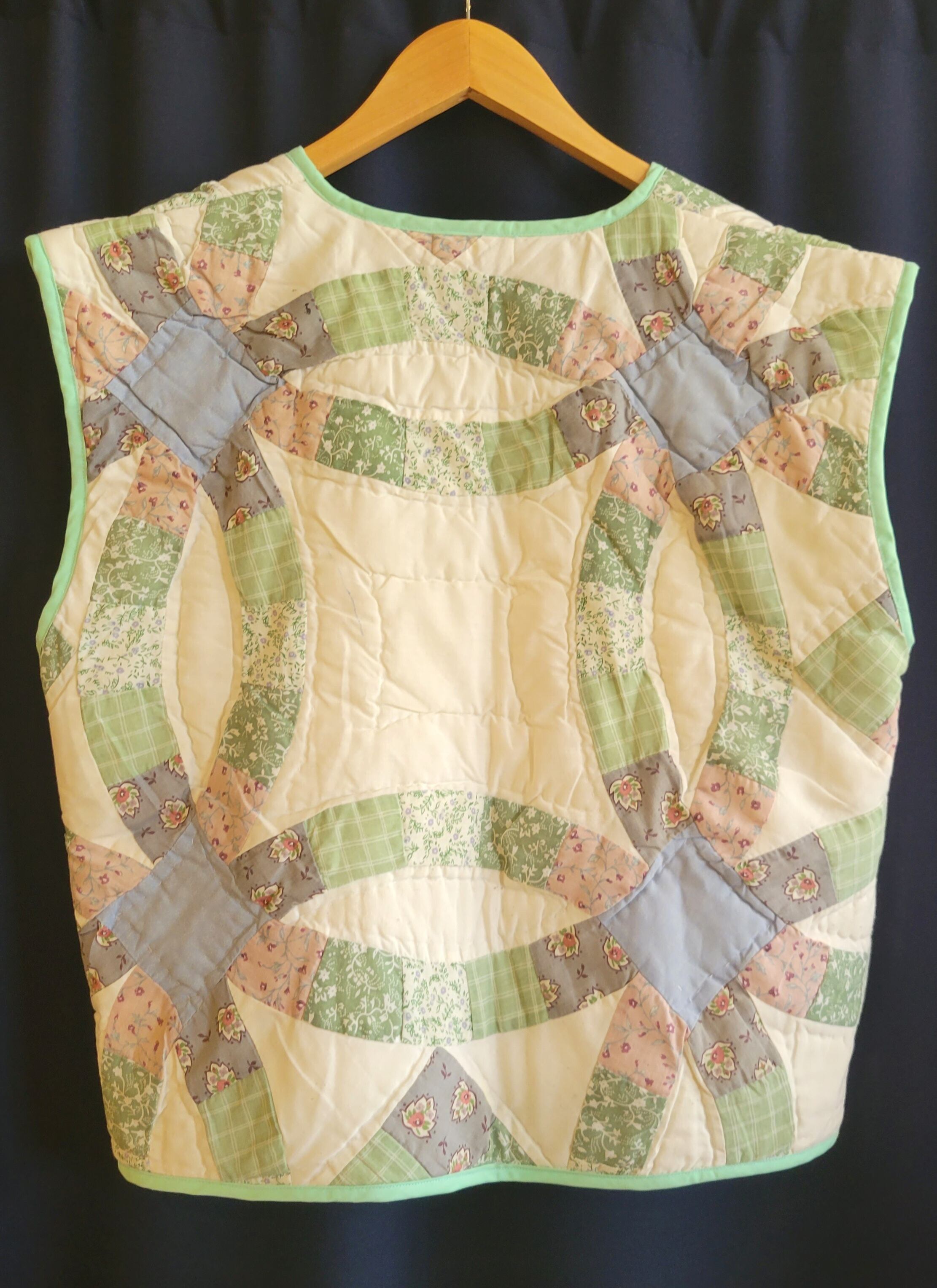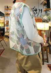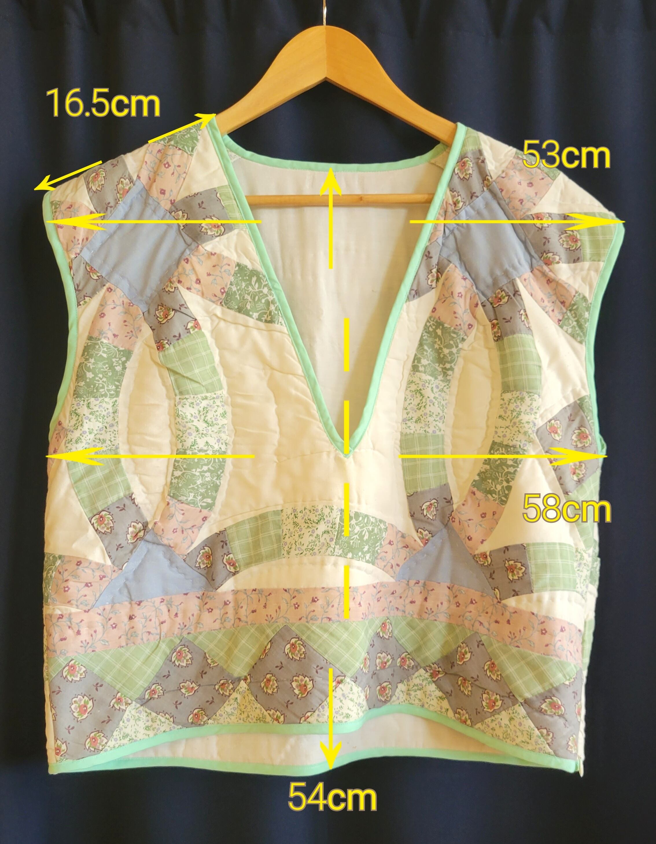 ヴィンテージのパッチワークキルト生地を使用したリメイクベスト。海外のヴィンテージキルトコレクターの方に生地をご提供いただき、現地で仕立てたリメイクベストです。素材はコットン。左サイドにジッパー付き。軽量、ゆったりめのサイズ感でストレス無く着用いただけます。*背中に約6cmの青いペンで書いたような細い線があります。画像でご確認ください。
