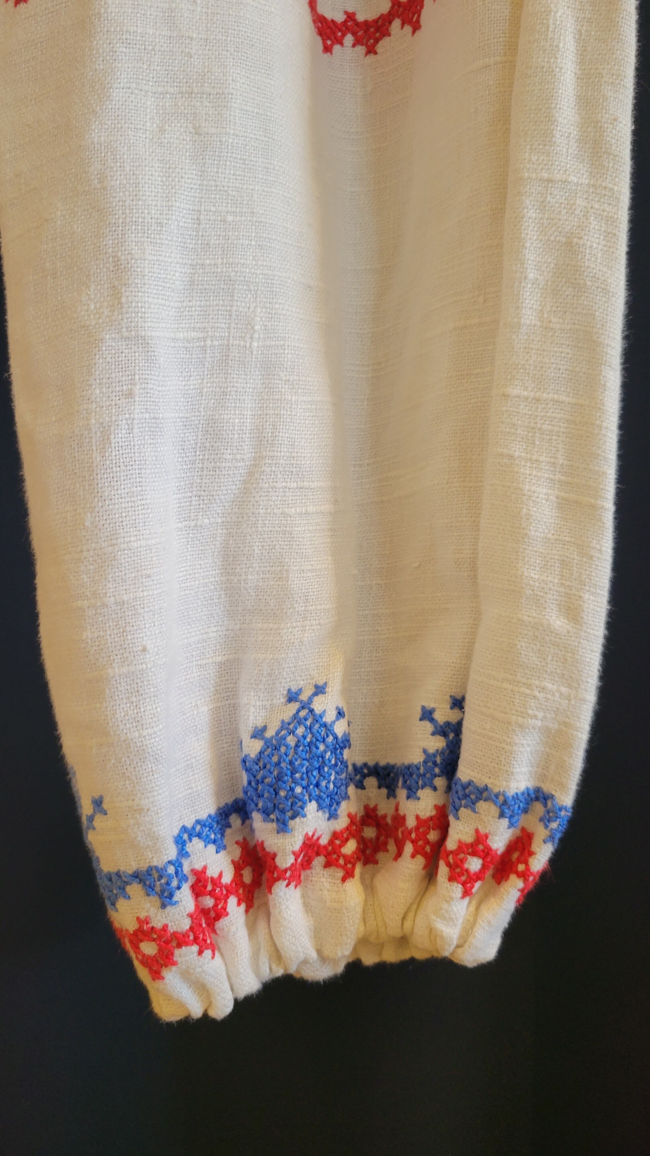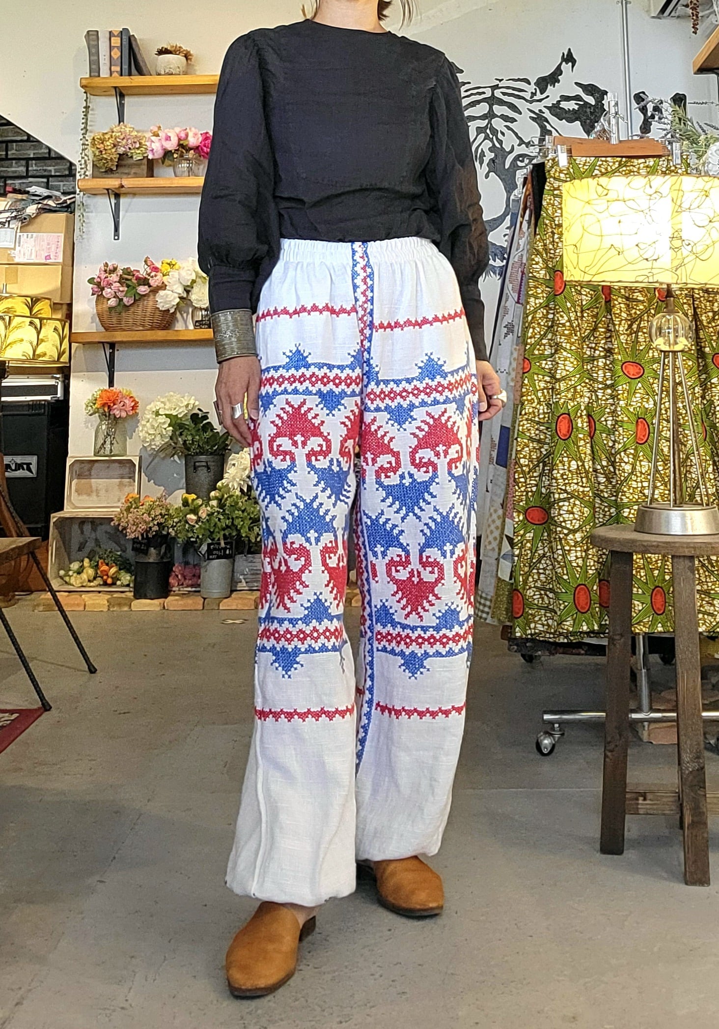 ヴィンテージの刺繍入りリネンクロスを使用したリメイクパンツ。ウエストゴムのイージーパンツです。左右にシームポケット付き。柄はプリントではなく全て刺繍です。リネンの肌触りが気持ち良い一本。
