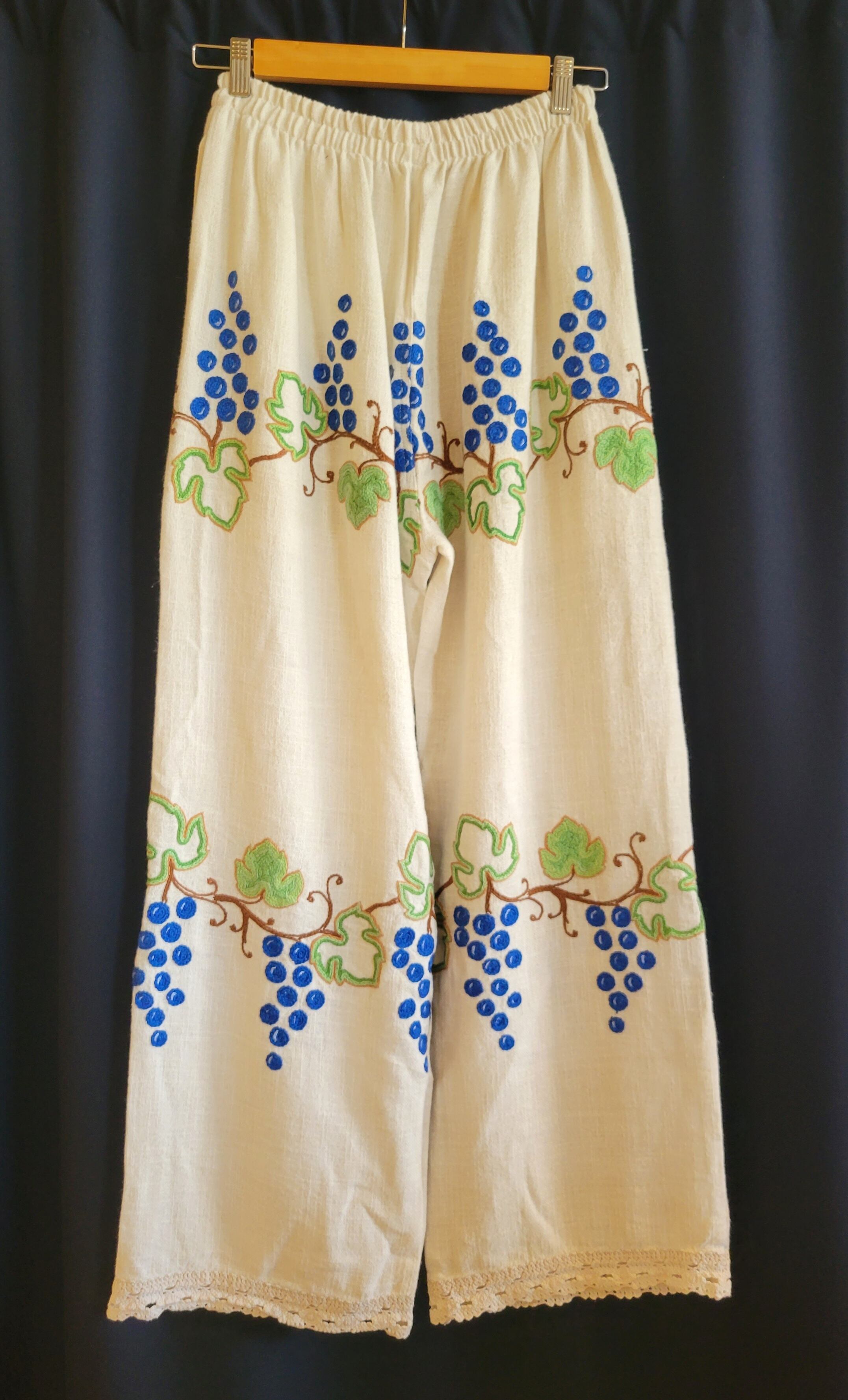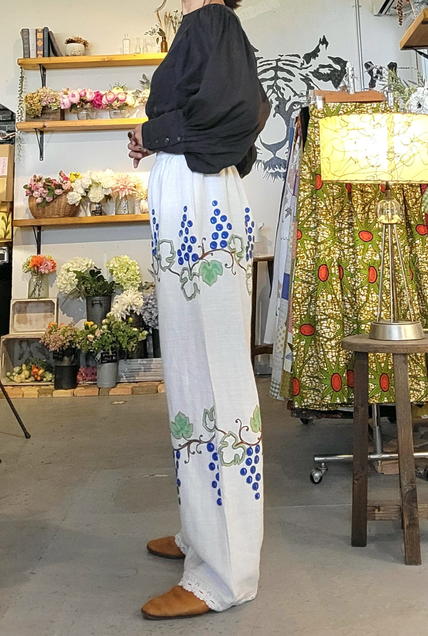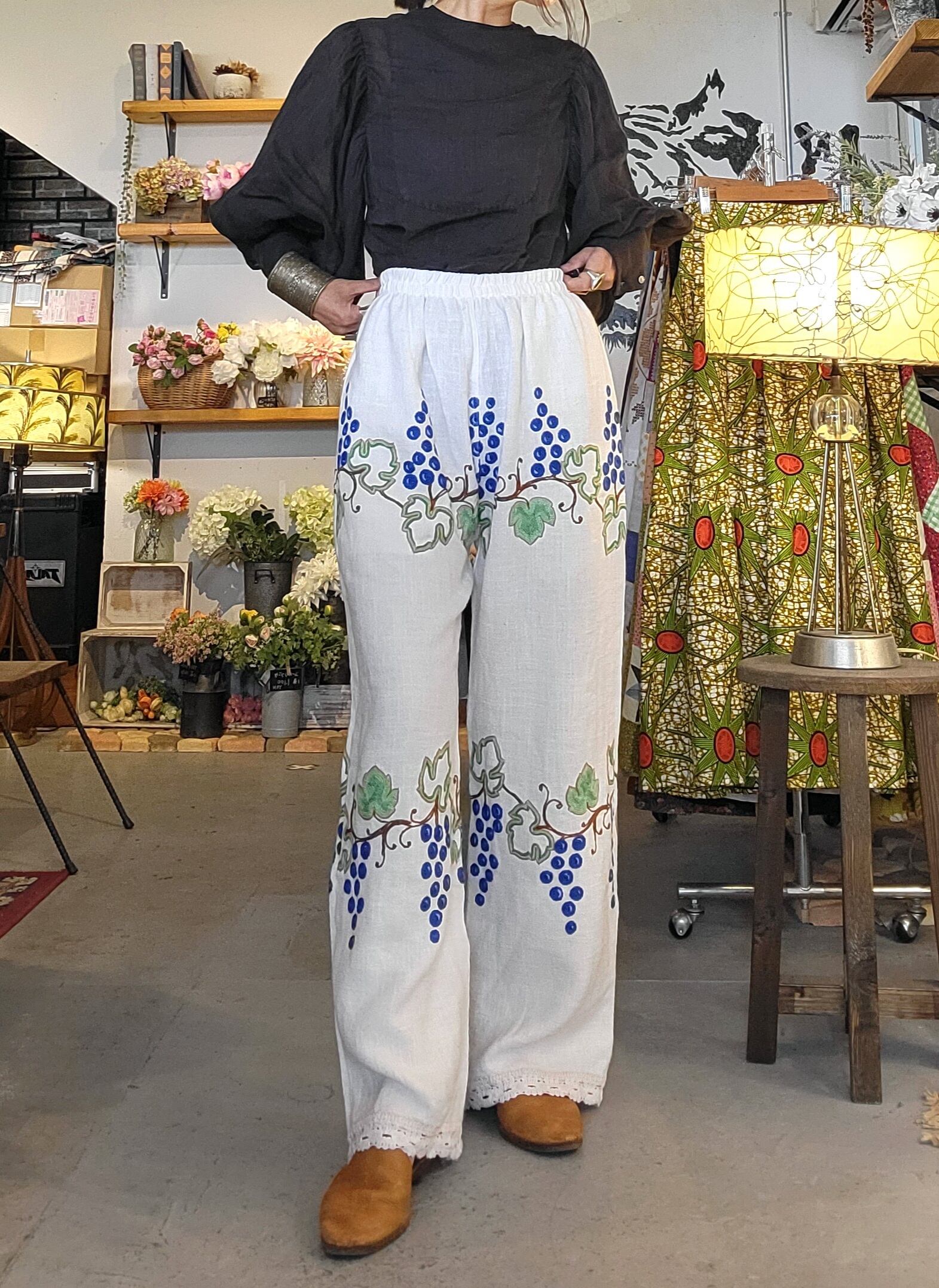 ヴィンテージの刺繍入りリネンクロスを使用したリメイクパンツ。ウエストゴムのイージーパンツです。左右にシームポケット付き。柄はプリントではなく全て刺繍です。リネンの肌触りが気持ち良い一本。