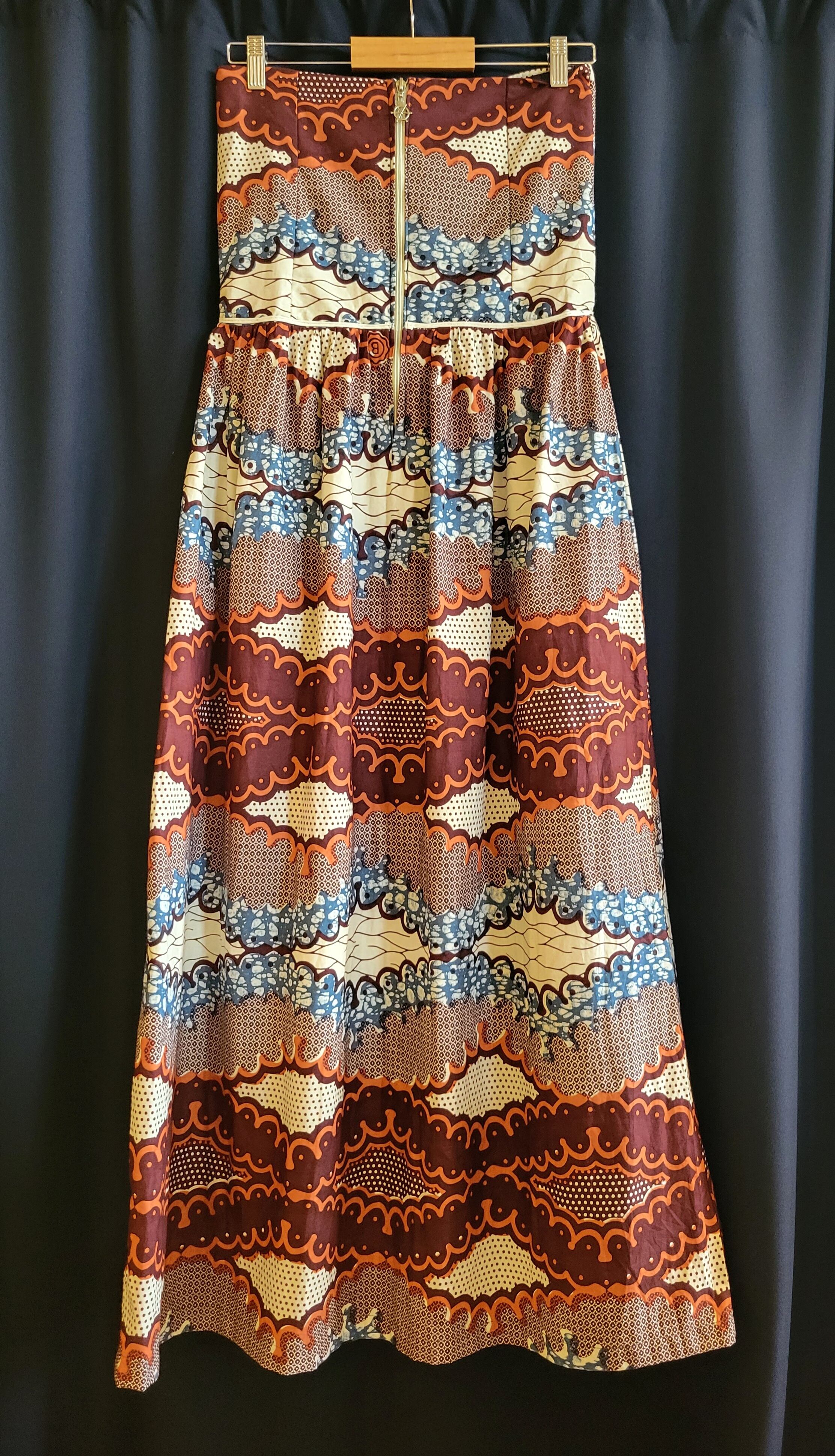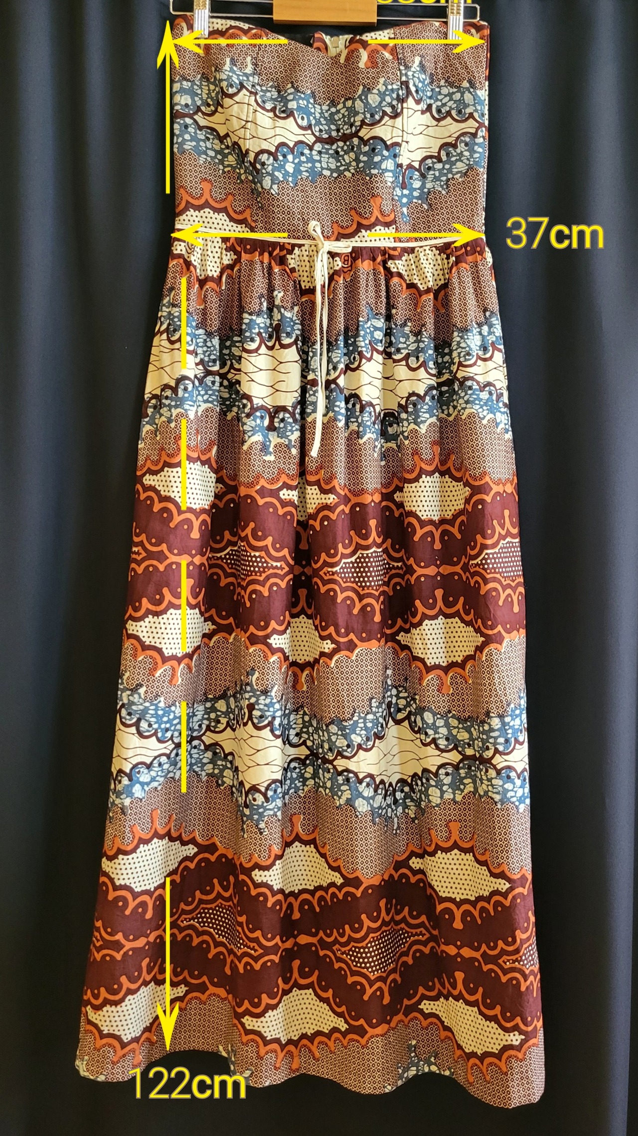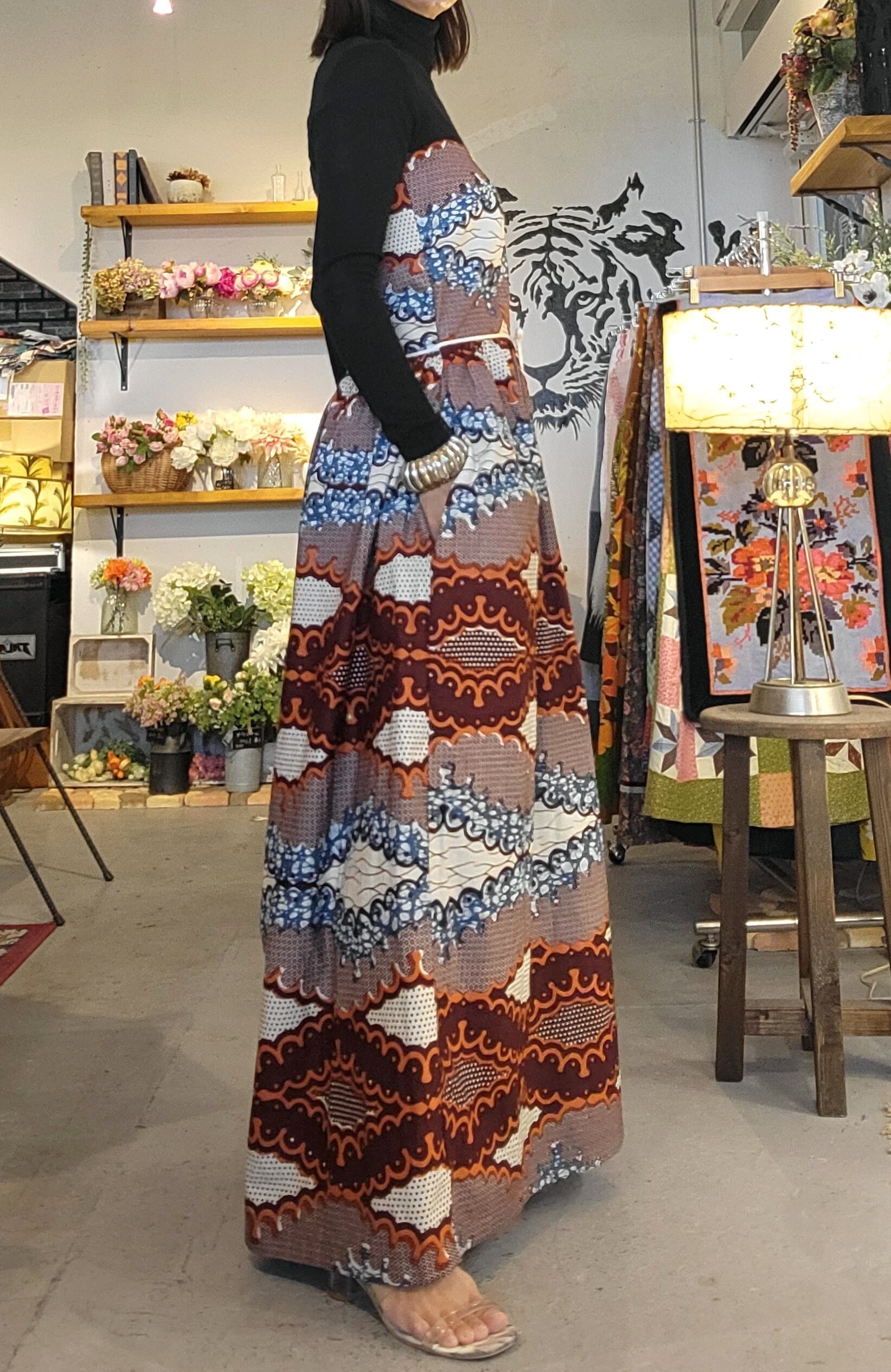 アフリカンバティックのヴィンテージドレス。素材表記はありませんが張りのあるコットンです。バックファスナー付き。ニットやシアートップス等、色々なトップスとの組み合わせを楽しめます。春夏には1枚でも着用可、シーズンレスで長く着られる1着。