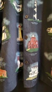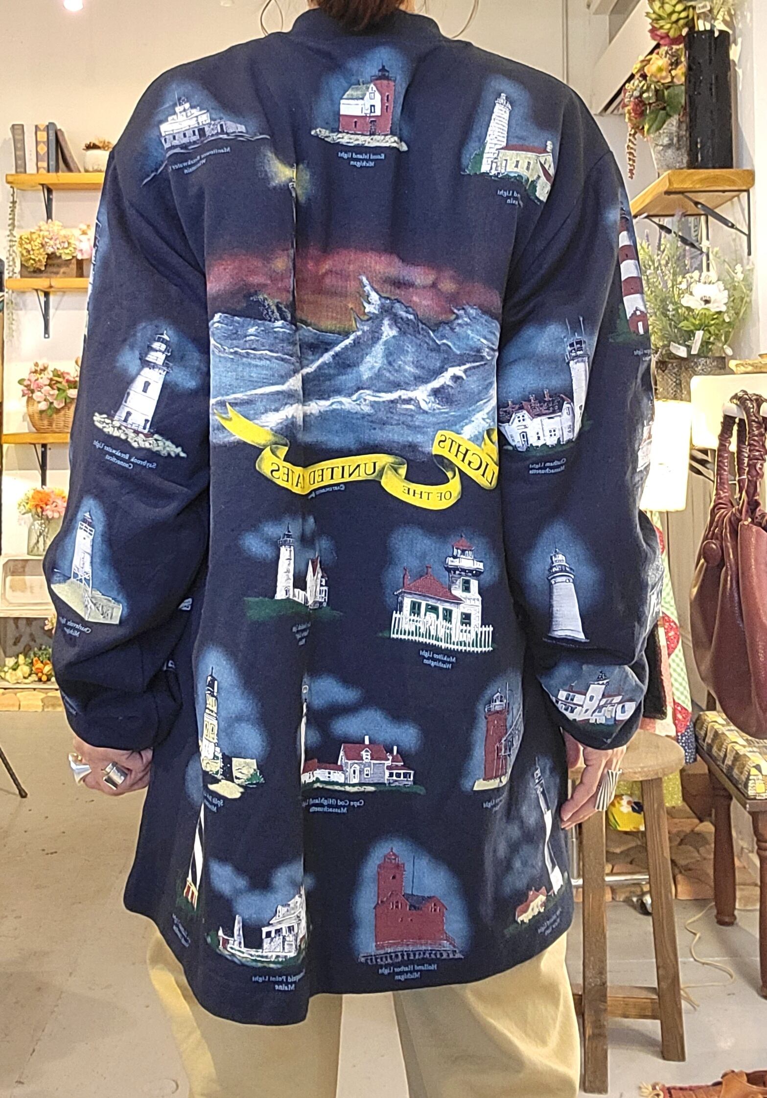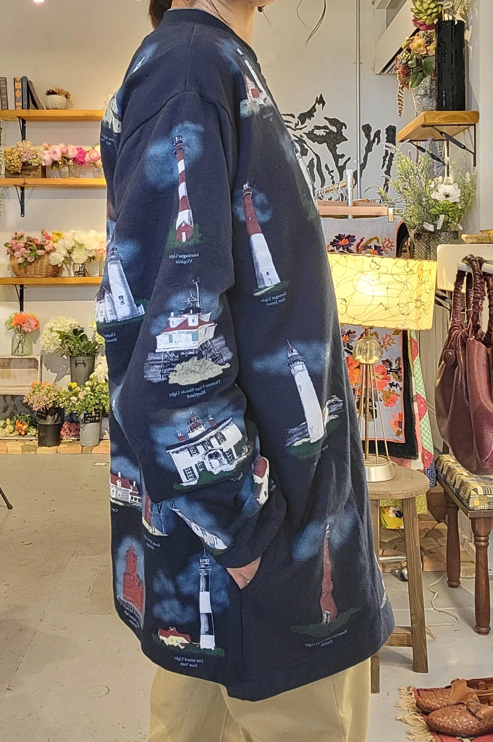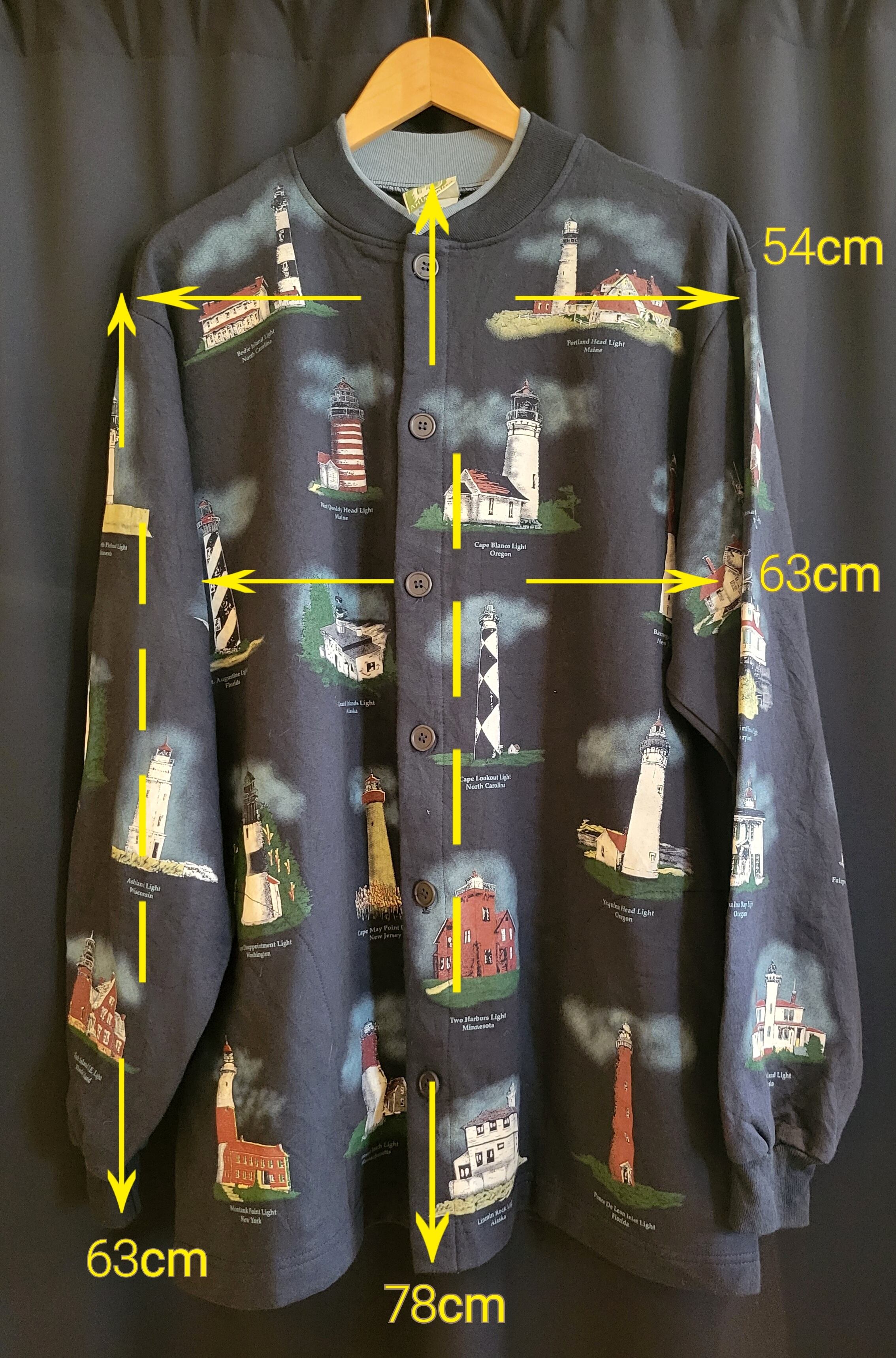 スウェット素材のプリントジャケット。素材はコットンです。様々な灯台の総柄プリント。ゆったりオーバーサイズとカジュアルな素材感が日常使いぴったりの1着です。